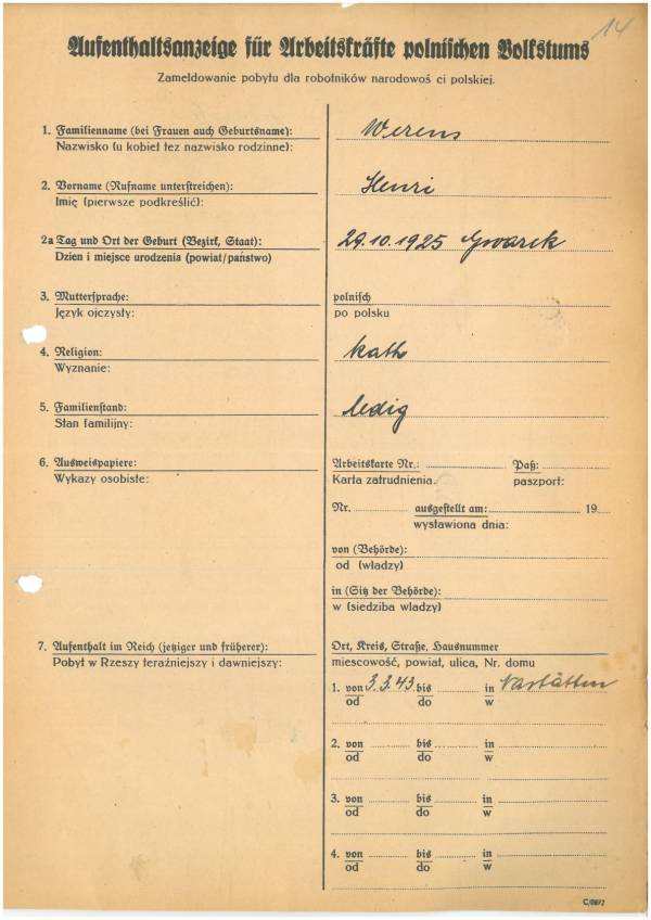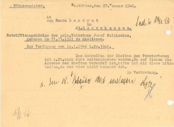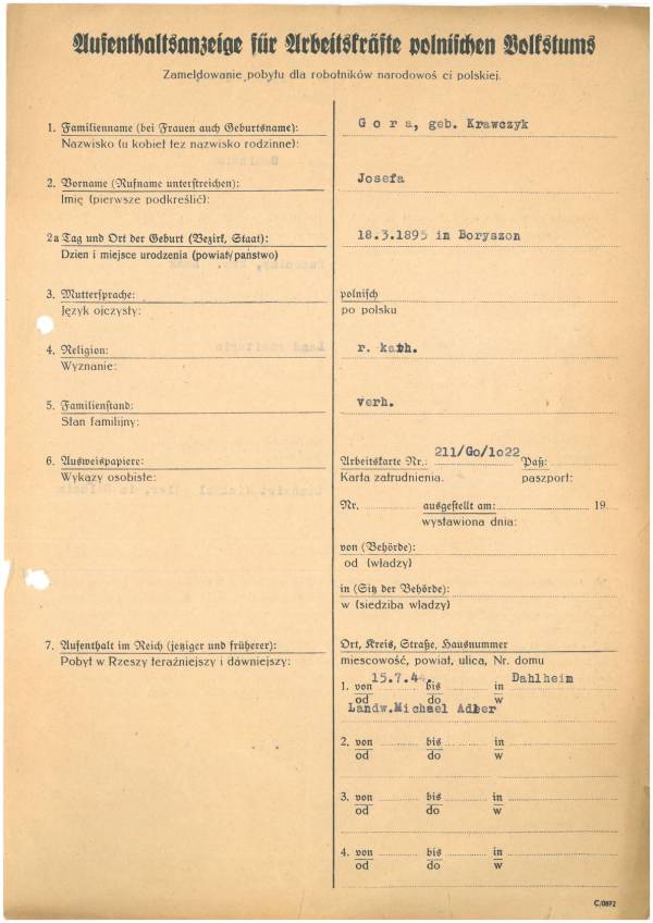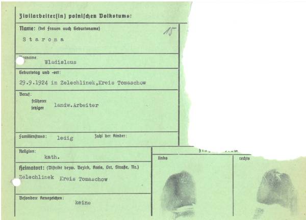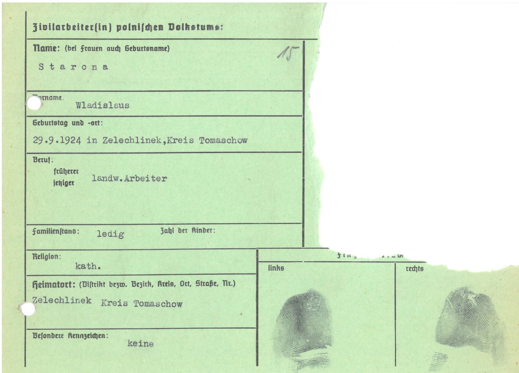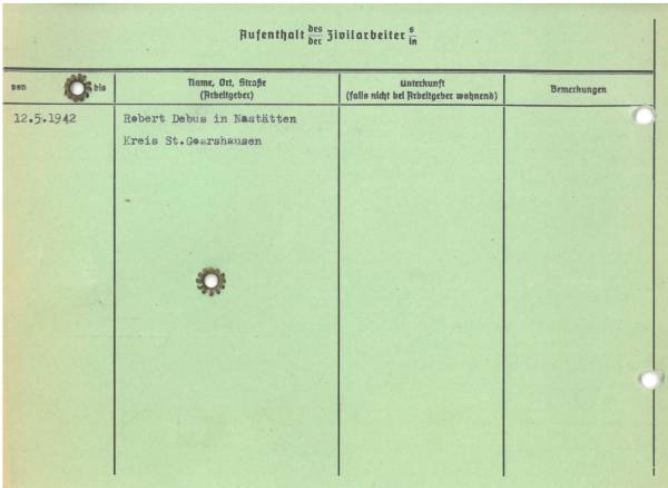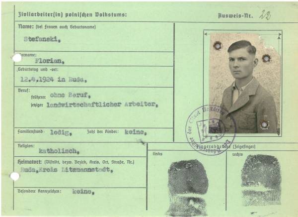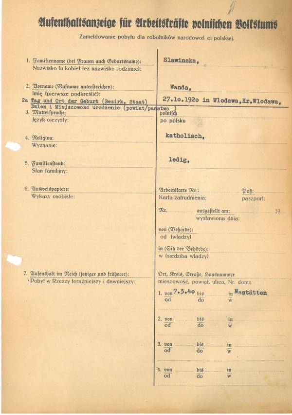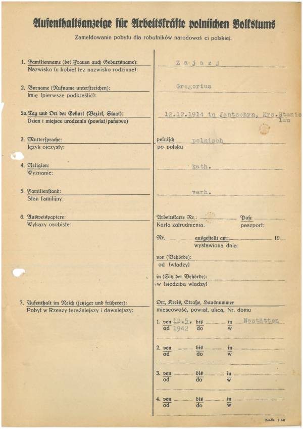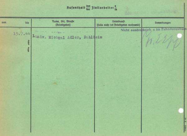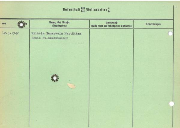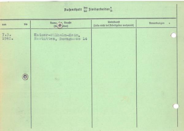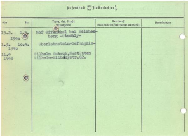 Im Oktober 1939 wurde die Einführung der Arbeitspflicht für Polen zwischen dem 18. und 60. Lebensjahr verordnet. Ab Sommer 1941 wurden die Zwangsarbeitsmaßnahmen auch auf den sowjetisch besetzen Teil Polens übertragen. Mehr und mehr wurden auch Jugendliche und selbst Kinder zur Zwangsarbeit herangezogen. Im Oktober 1940 arbeiteten in der deutschen Landwirtschaft etwa 400.000, in der Industrie rund 140.000 sogenannte Zivilarbeiter aus Polen und Sowjetrussland. Auch in Nastätten wurden Zivilarbeiter überwiegend in der Landwirtschaft eingesetzt. Finden sie Aufenthaltsbescheinigungen und Ausweise der in Nastätten eingesetzten Zivilarbeiter.