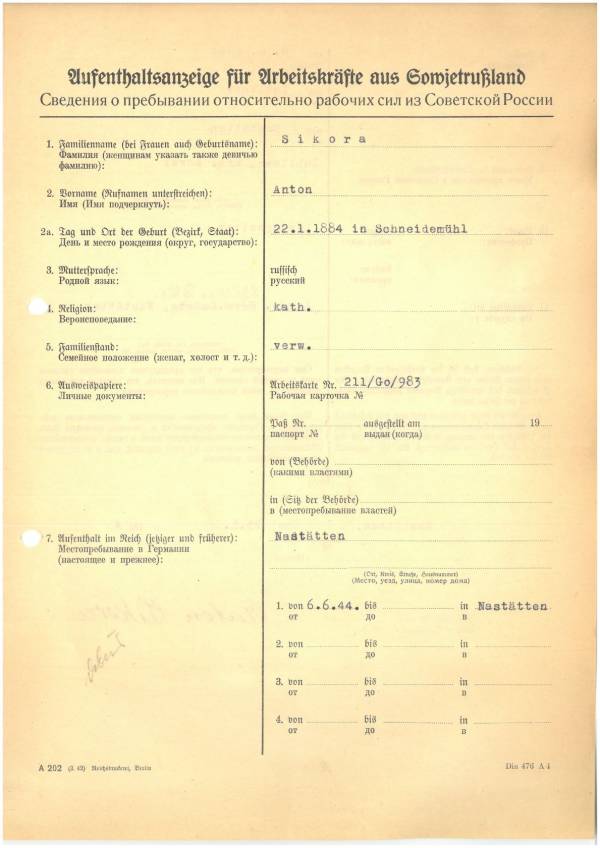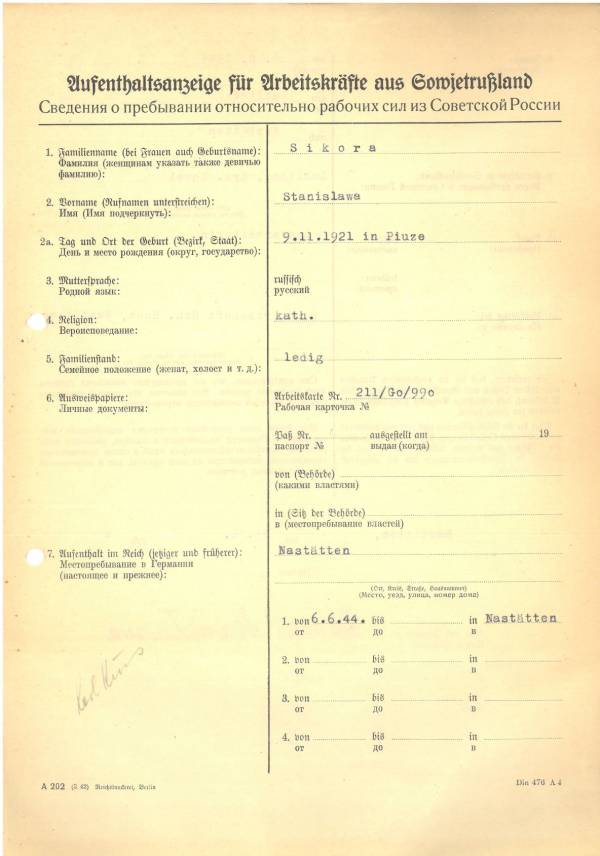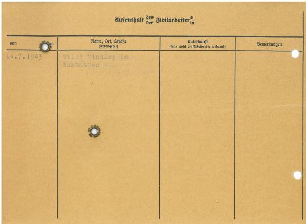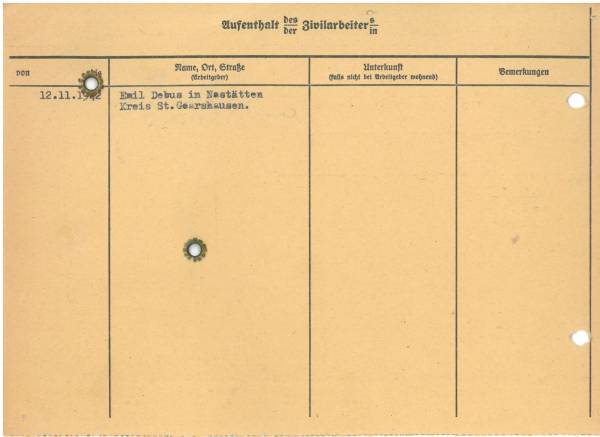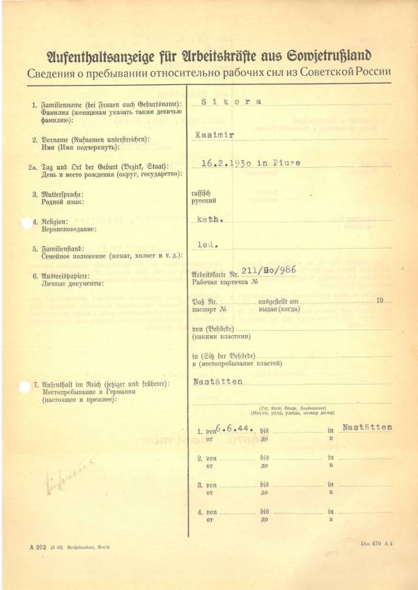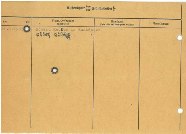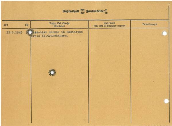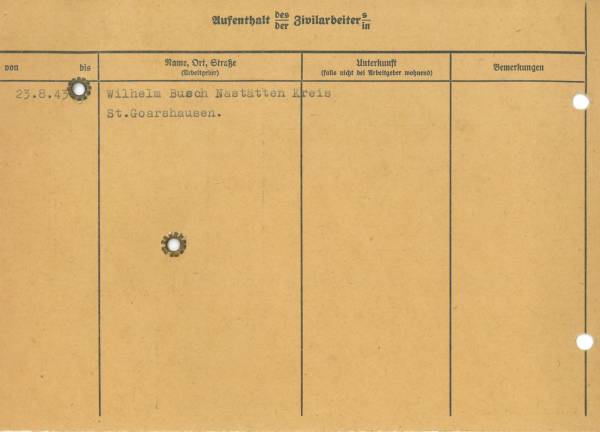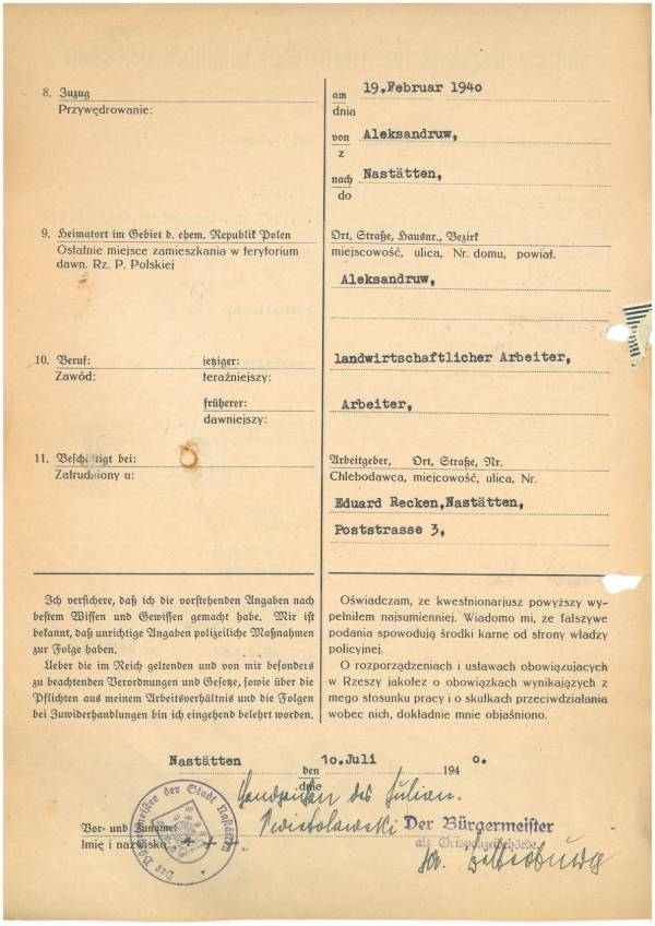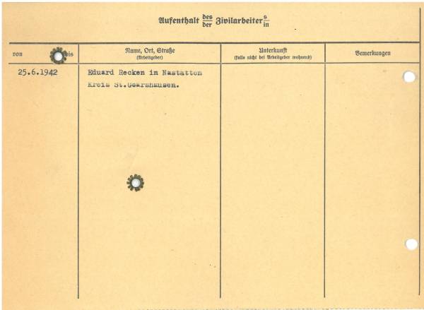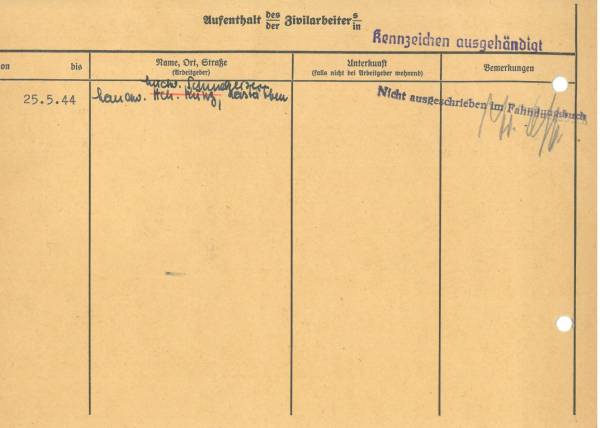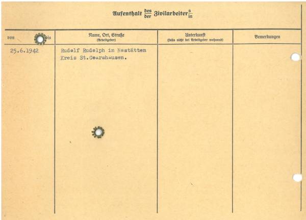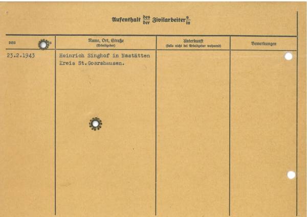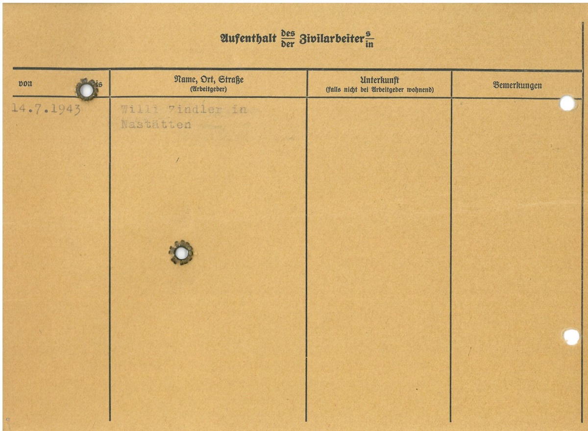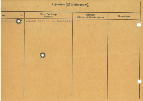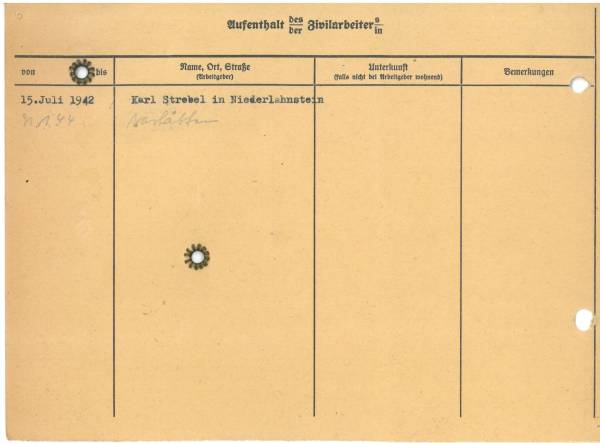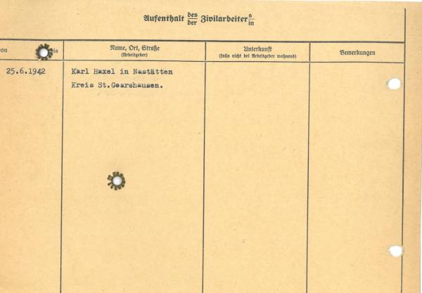 Im Oktober 1939 wurde die Einführung der Arbeitspflicht für Polen zwischen dem 18. und 60. Lebensjahr verordnet. Ab Sommer 1941 wurden die Zwangsarbeitsmaßnahmen auch auf den sowjetisch besetzen Teil Polens übertragen. Mehr und mehr wurden auch Jugendliche und selbst Kinder zur Zwangsarbeit herangezogen. Im Oktober 1940 arbeiteten in der deutschen Landwirtschaft etwa 400.000, in der Industrie rund 140.000 sogenannte Zivilarbeiter aus Polen und Sowjetrussland. Auch in Nastätten wurden Zivilarbeiter überwiegend in der Landwirtschaft eingesetzt. Finden sie Aufenthaltsbescheinigungen und Ausweise der in Nastätten eingesetzten Zivilarbeiter.