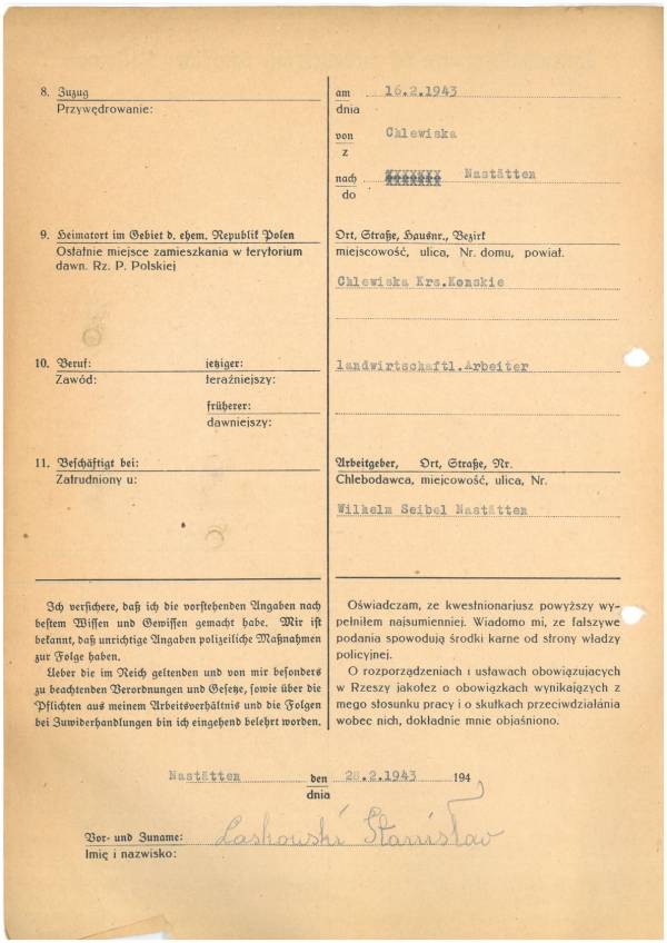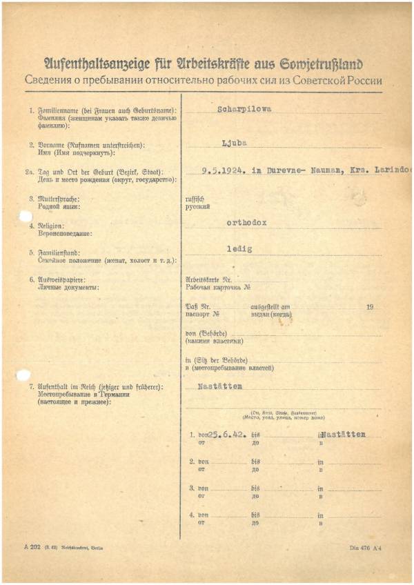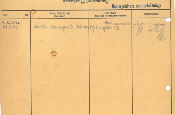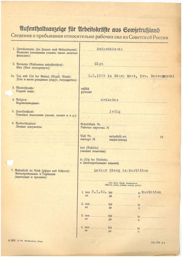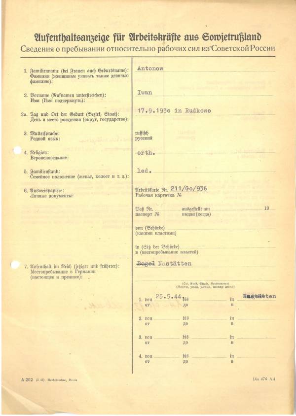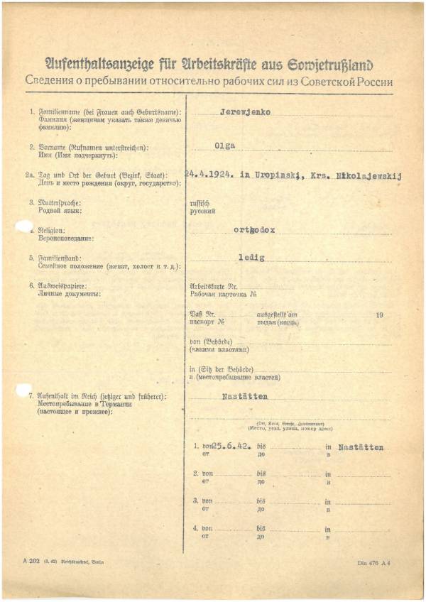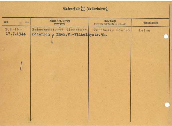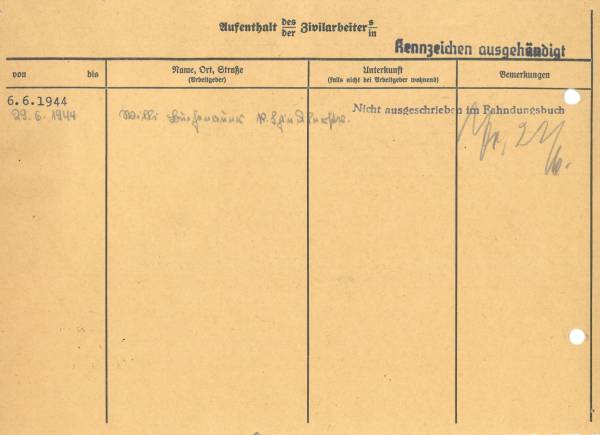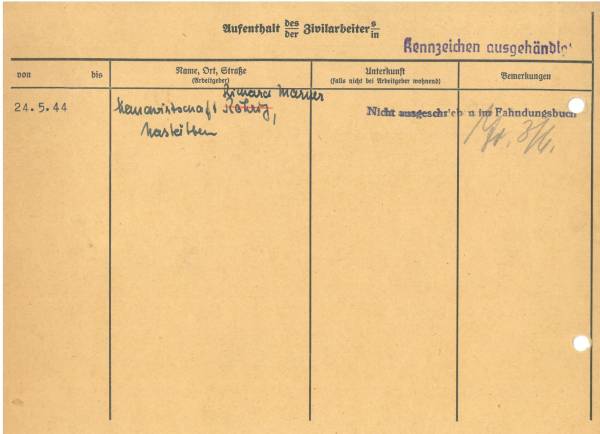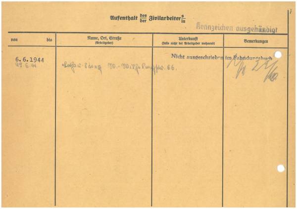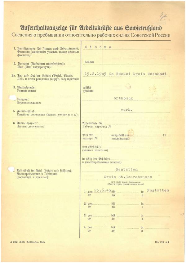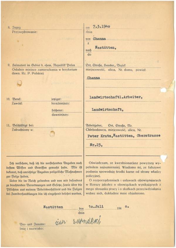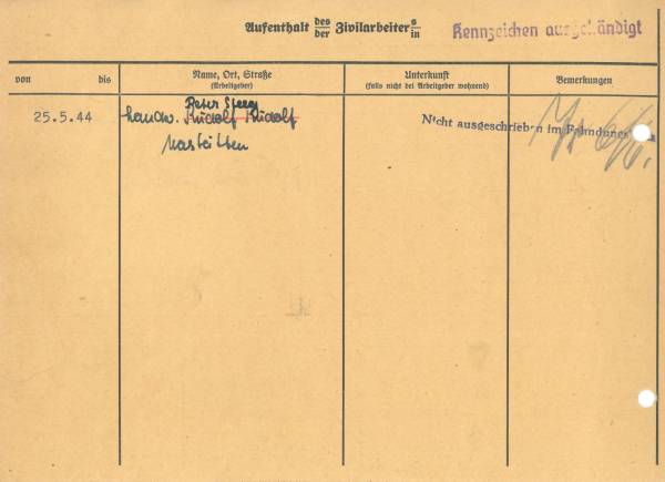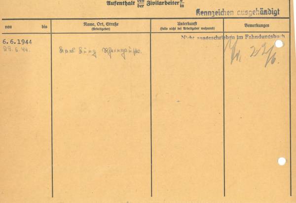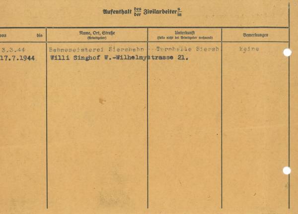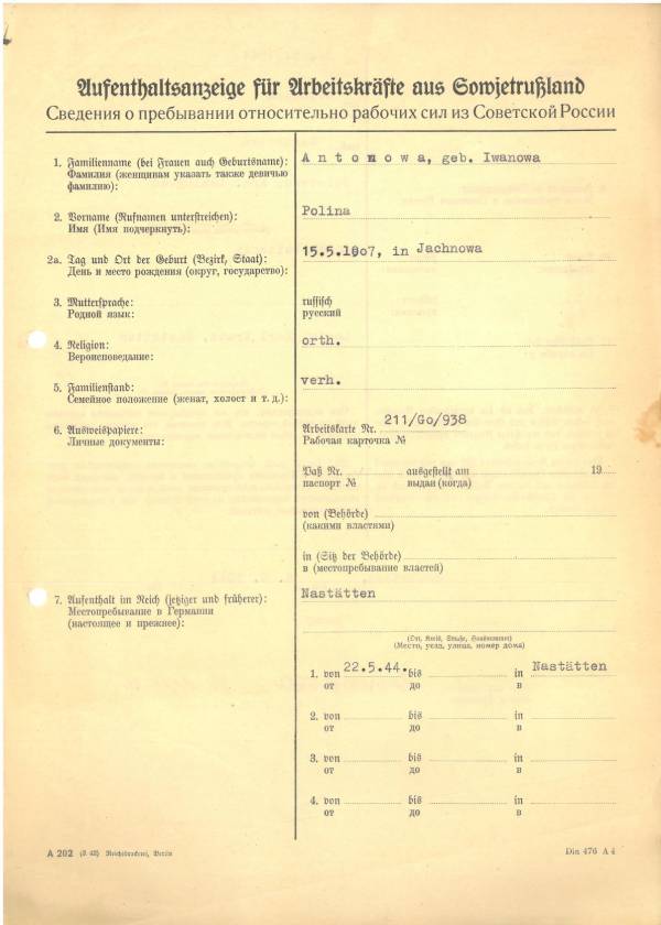 Im Oktober 1939 wurde die Einführung der Arbeitspflicht für Polen zwischen dem 18. und 60. Lebensjahr verordnet. Ab Sommer 1941 wurden die Zwangsarbeitsmaßnahmen auch auf den sowjetisch besetzen Teil Polens übertragen. Mehr und mehr wurden auch Jugendliche und selbst Kinder zur Zwangsarbeit herangezogen. Im Oktober 1940 arbeiteten in der deutschen Landwirtschaft etwa 400.000, in der Industrie rund 140.000 sogenannte Zivilarbeiter aus Polen und Sowjetrussland. Auch in Nastätten wurden Zivilarbeiter überwiegend in der Landwirtschaft eingesetzt. Finden sie Aufenthaltsbescheinigungen und Ausweise der in Nastätten eingesetzten Zivilarbeiter.