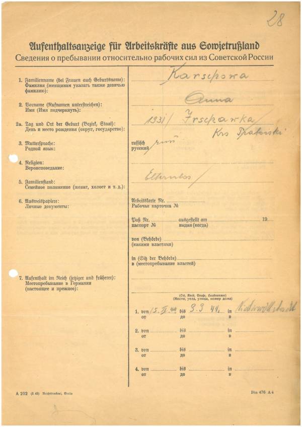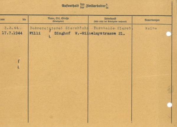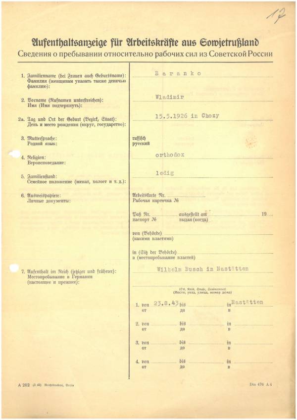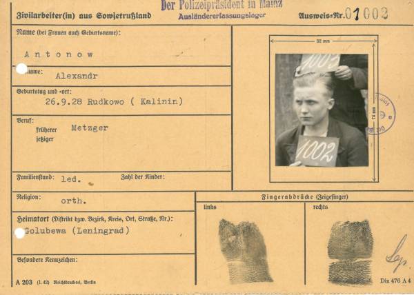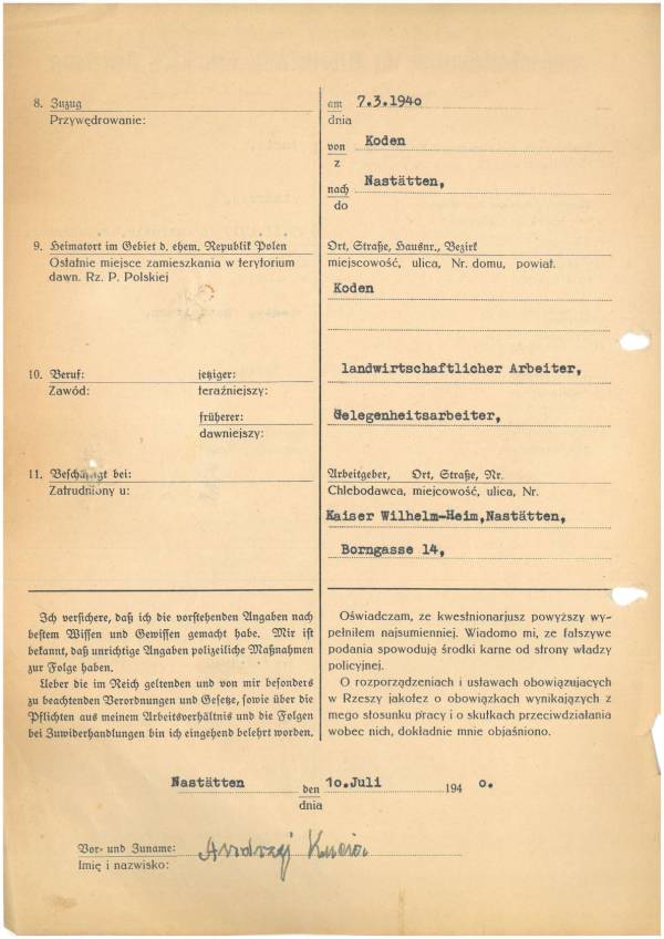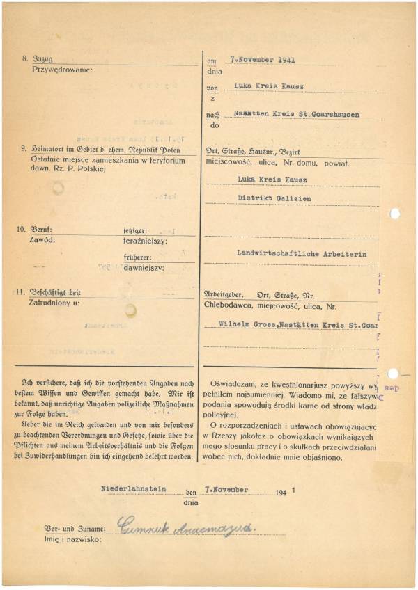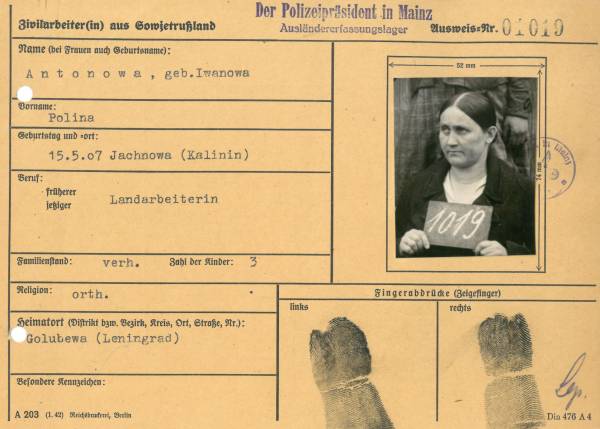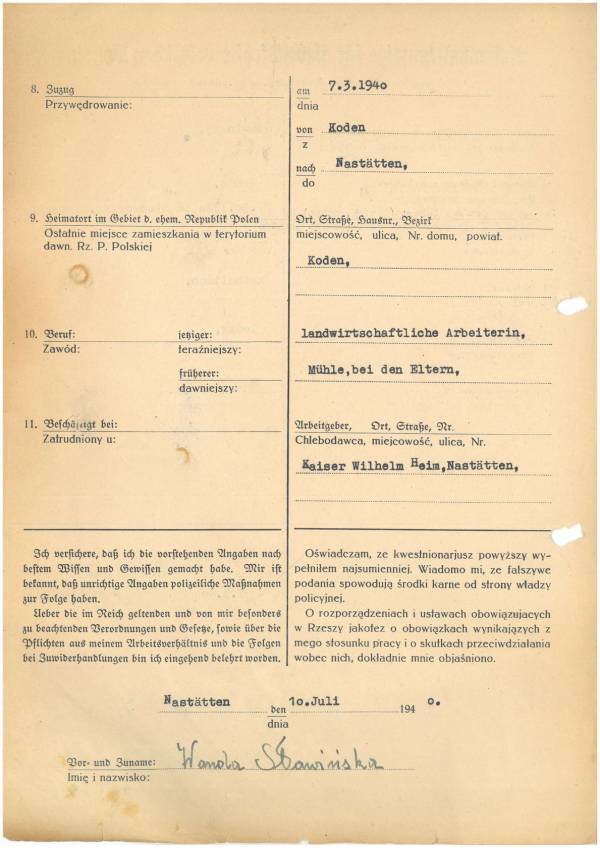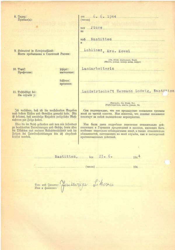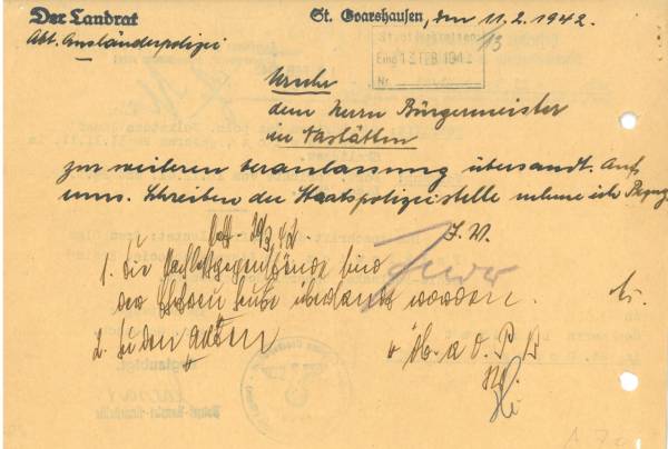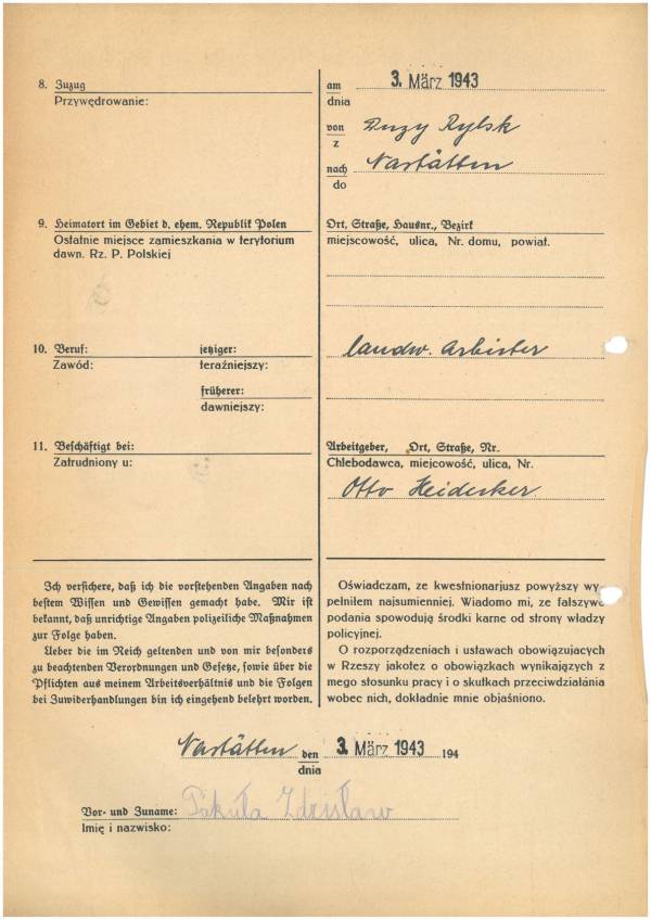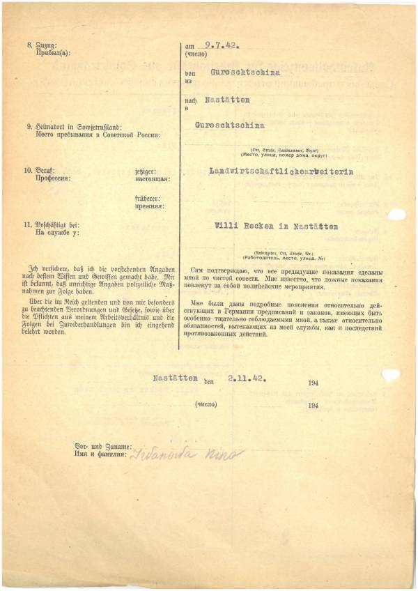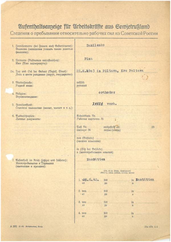 Im Oktober 1939 wurde die Einführung der Arbeitspflicht für Polen zwischen dem 18. und 60. Lebensjahr verordnet. Ab Sommer 1941 wurden die Zwangsarbeitsmaßnahmen auch auf den sowjetisch besetzen Teil Polens übertragen. Mehr und mehr wurden auch Jugendliche und selbst Kinder zur Zwangsarbeit herangezogen. Im Oktober 1940 arbeiteten in der deutschen Landwirtschaft etwa 400.000, in der Industrie rund 140.000 sogenannte Zivilarbeiter aus Polen und Sowjetrussland. Auch in Nastätten wurden Zivilarbeiter überwiegend in der Landwirtschaft eingesetzt. Finden sie Aufenthaltsbescheinigungen und Ausweise der in Nastätten eingesetzten Zivilarbeiter.