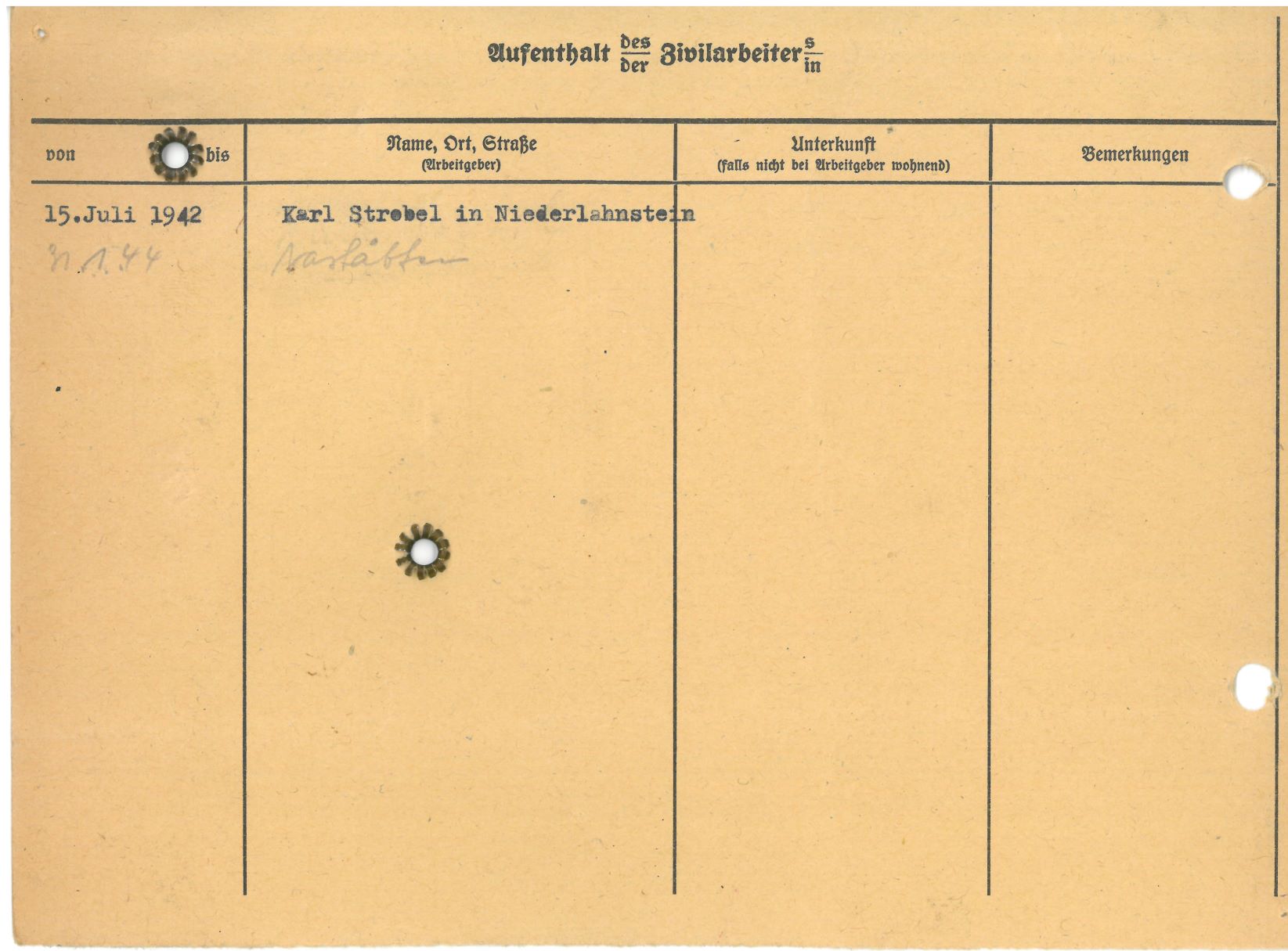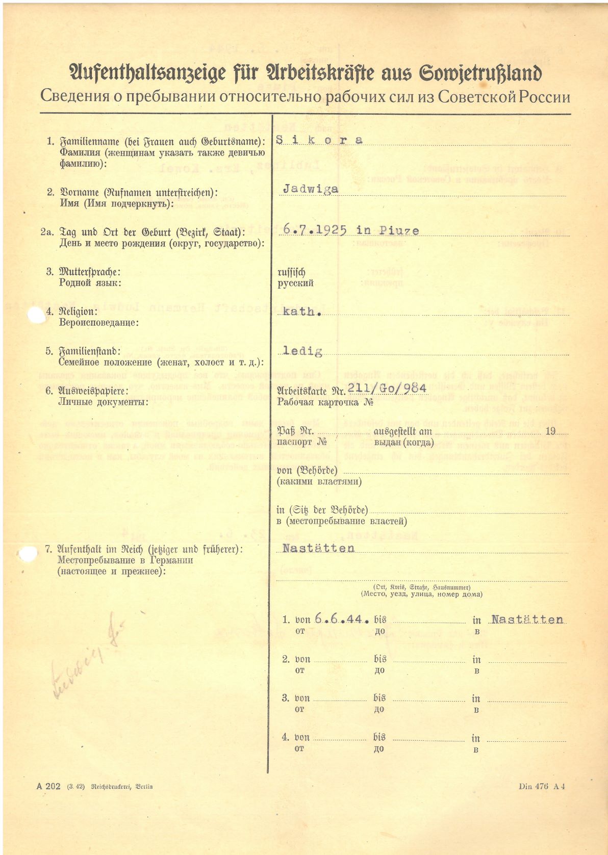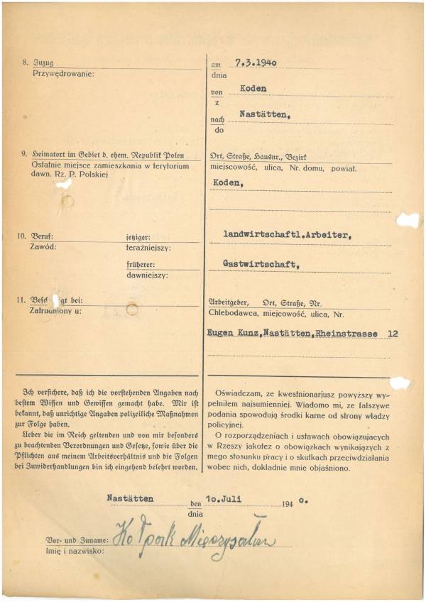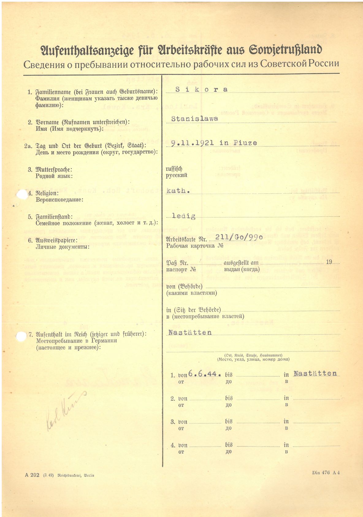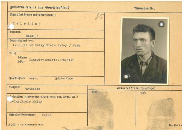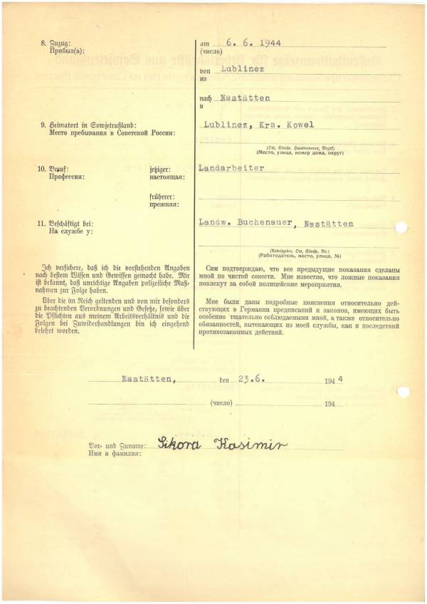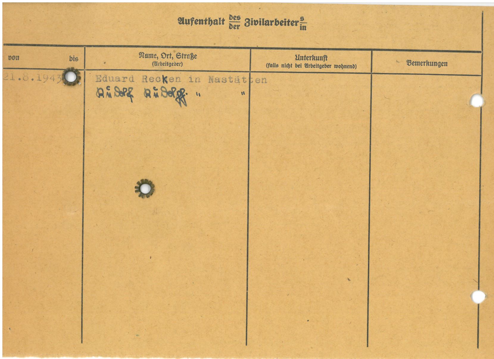 Im Oktober 1939 wurde die Einführung der Arbeitspflicht für Polen zwischen dem 18. und 60. Lebensjahr verordnet. Ab Sommer 1941 wurden die Zwangsarbeitsmaßnahmen auch auf den sowjetisch besetzen Teil Polens übertragen. Mehr und mehr wurden auch Jugendliche und selbst Kinder zur Zwangsarbeit herangezogen. Im Oktober 1940 arbeiteten in der deutschen Landwirtschaft etwa 400.000, in der Industrie rund 140.000 sogenannte Zivilarbeiter aus Polen und Sowjetrussland. Auch in Nastätten wurden Zivilarbeiter überwiegend in der Landwirtschaft eingesetzt. Finden sie Aufenthaltsbescheinigungen und Ausweise der in Nastätten eingesetzten Zivilarbeiter.