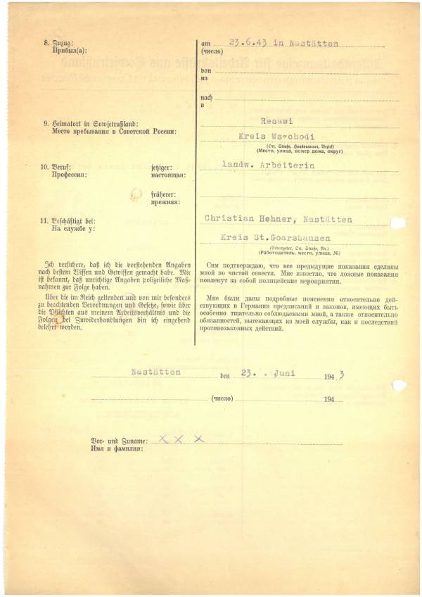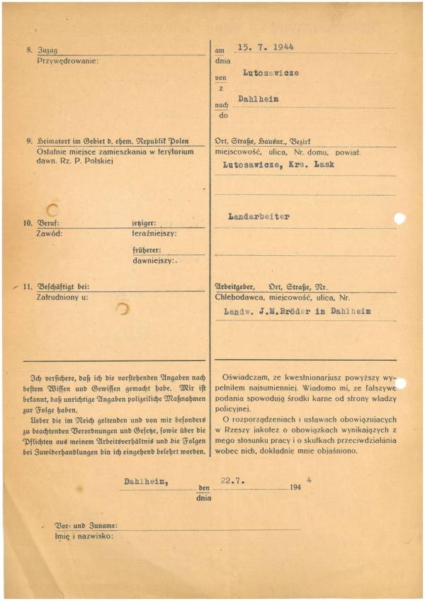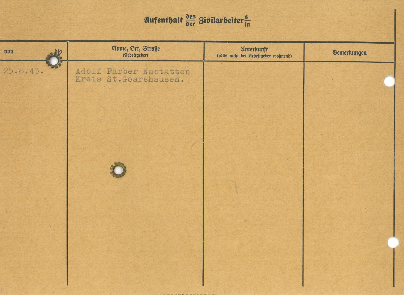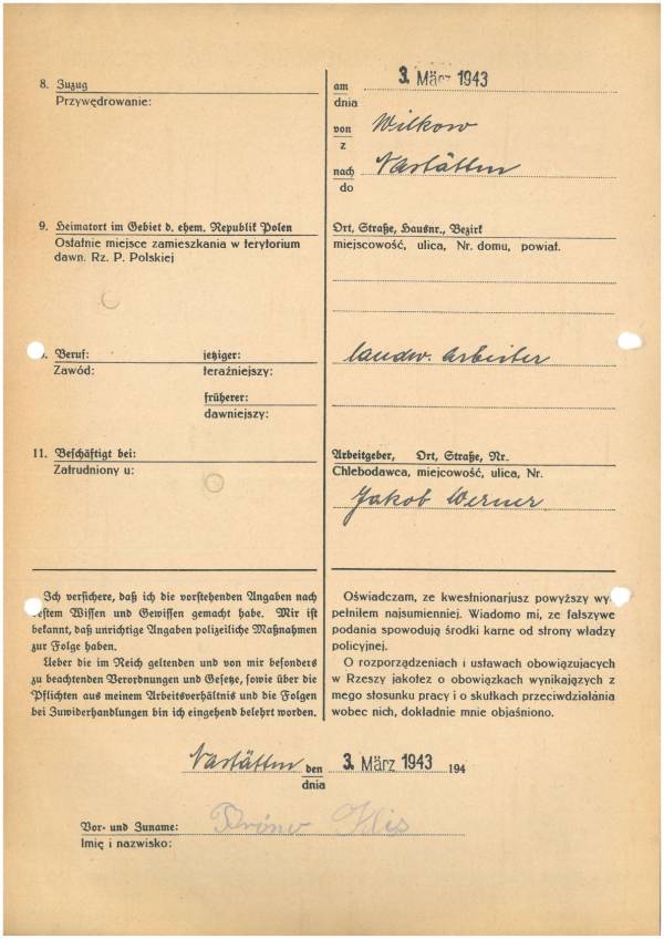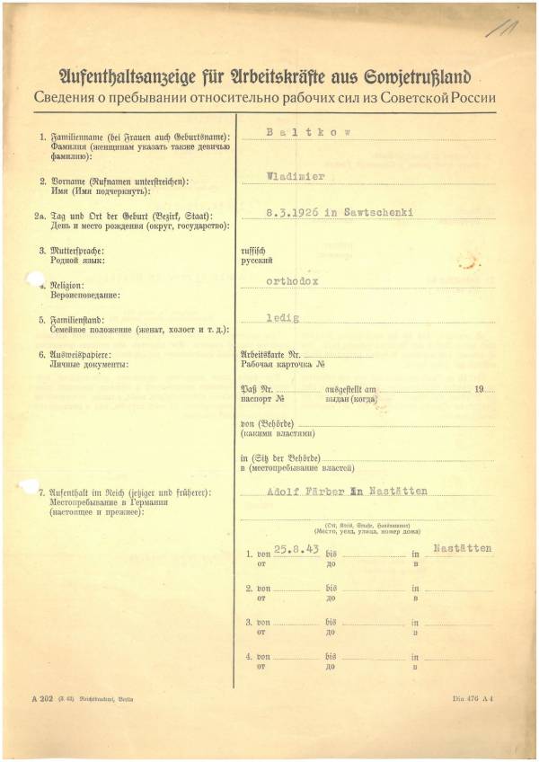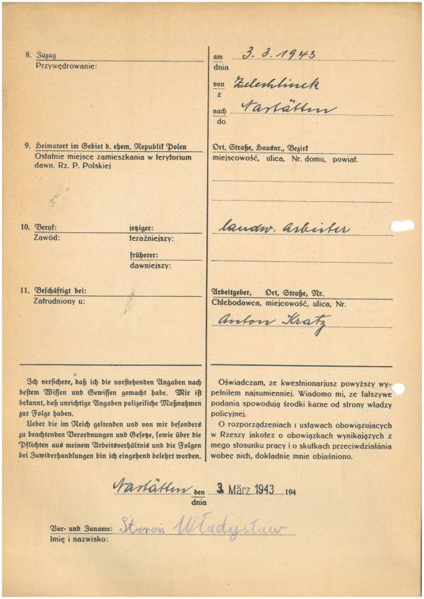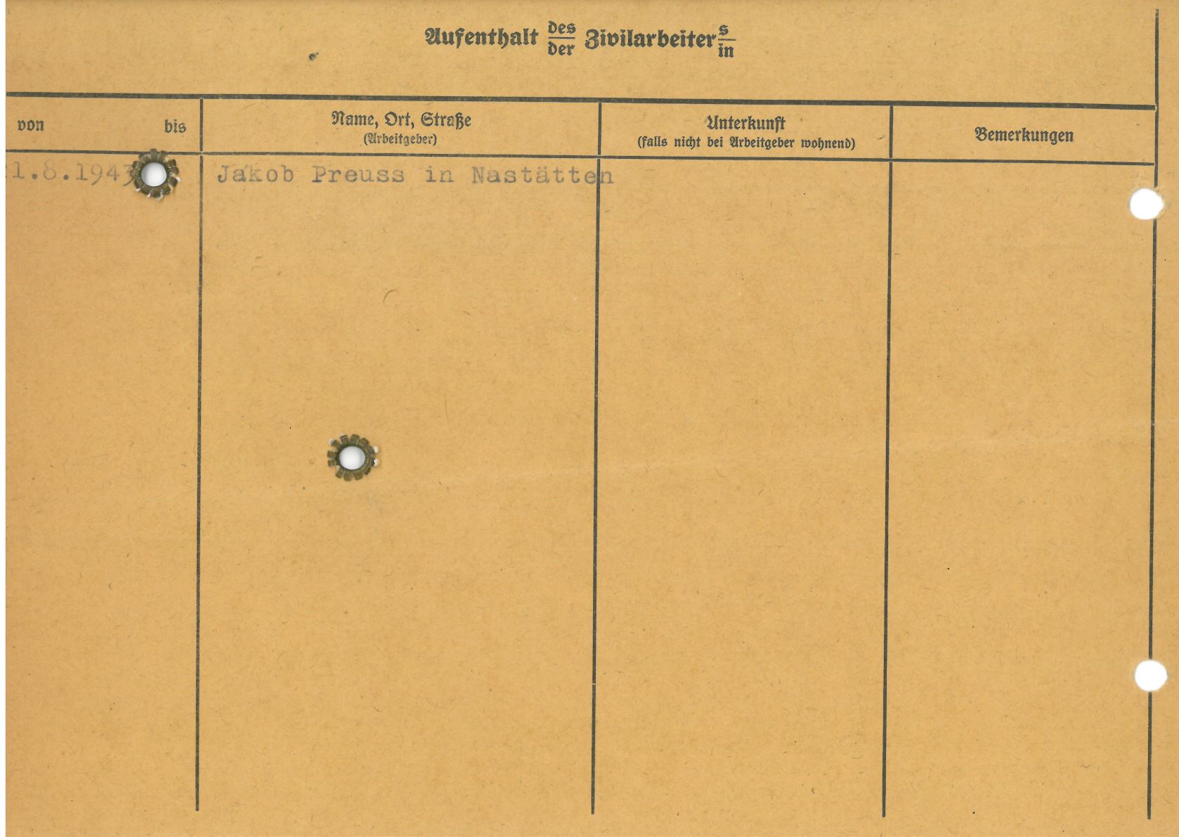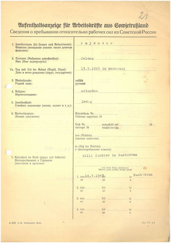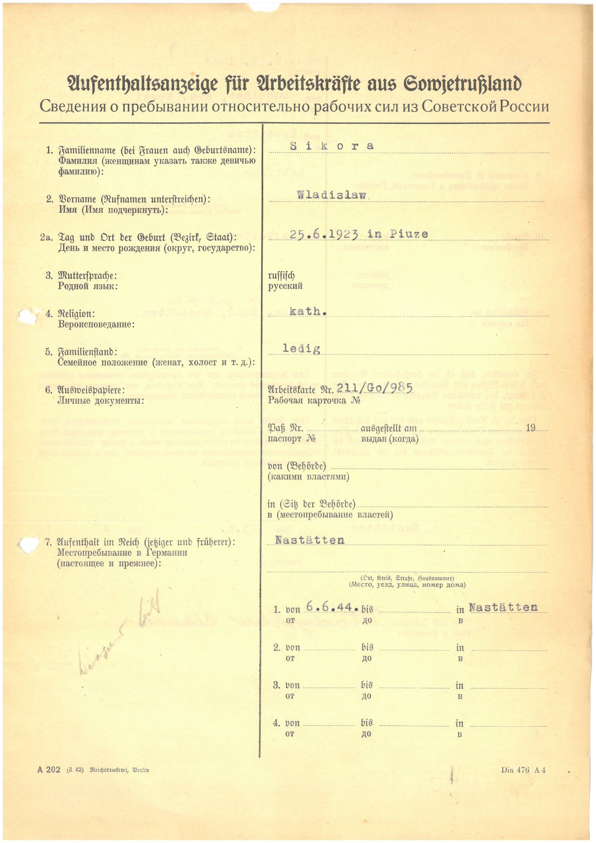 Im Oktober 1939 wurde die Einführung der Arbeitspflicht für Polen zwischen dem 18. und 60. Lebensjahr verordnet. Ab Sommer 1941 wurden die Zwangsarbeitsmaßnahmen auch auf den sowjetisch besetzen Teil Polens übertragen. Mehr und mehr wurden auch Jugendliche und selbst Kinder zur Zwangsarbeit herangezogen. Im Oktober 1940 arbeiteten in der deutschen Landwirtschaft etwa 400.000, in der Industrie rund 140.000 sogenannte Zivilarbeiter aus Polen und Sowjetrussland. Auch in Nastätten wurden Zivilarbeiter überwiegend in der Landwirtschaft eingesetzt. Finden sie Aufenthaltsbescheinigungen und Ausweise der in Nastätten eingesetzten Zivilarbeiter.