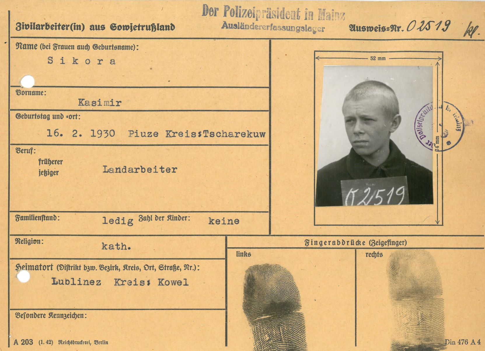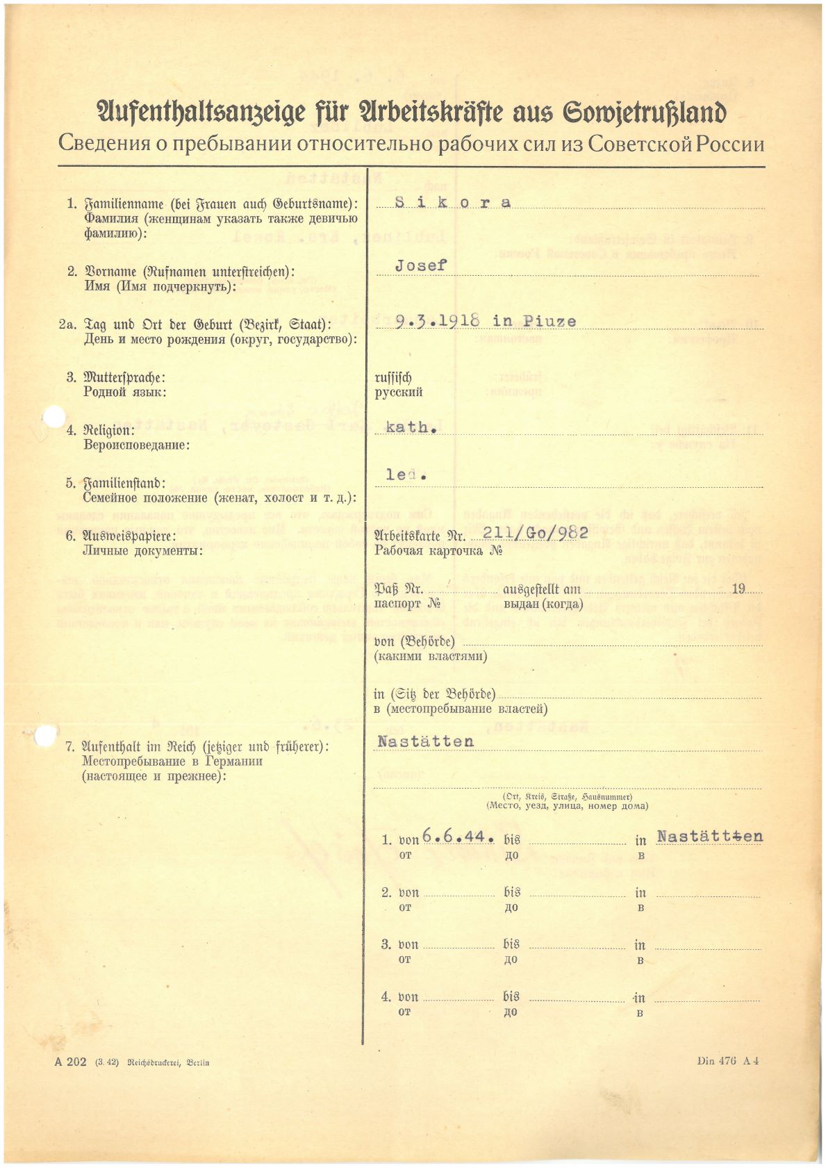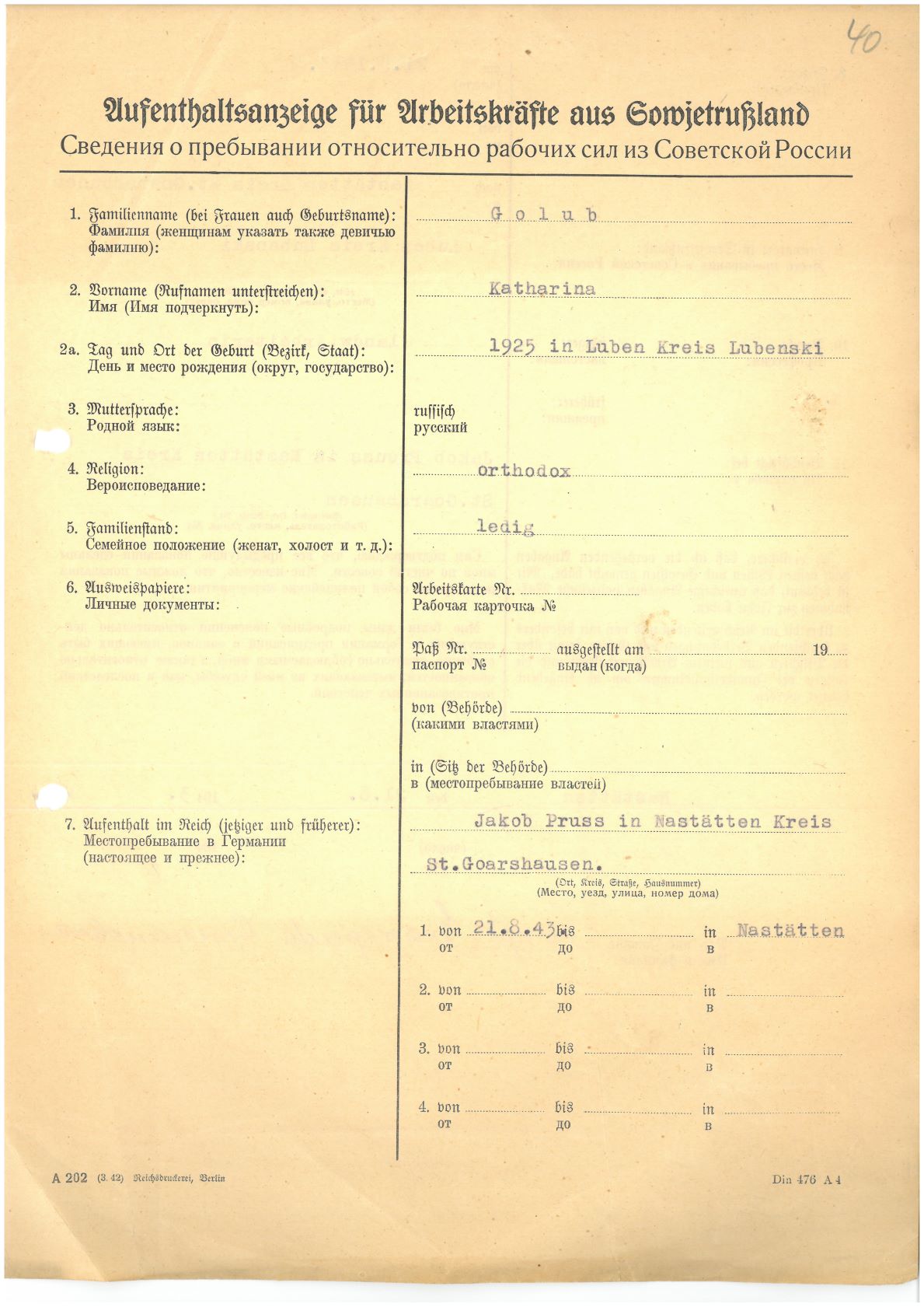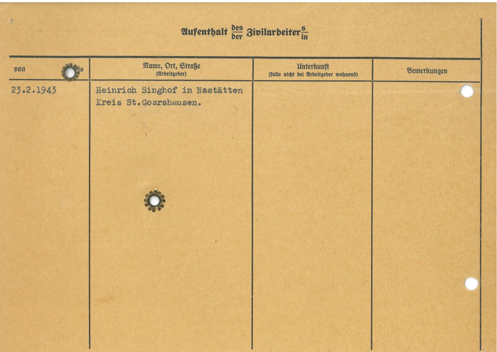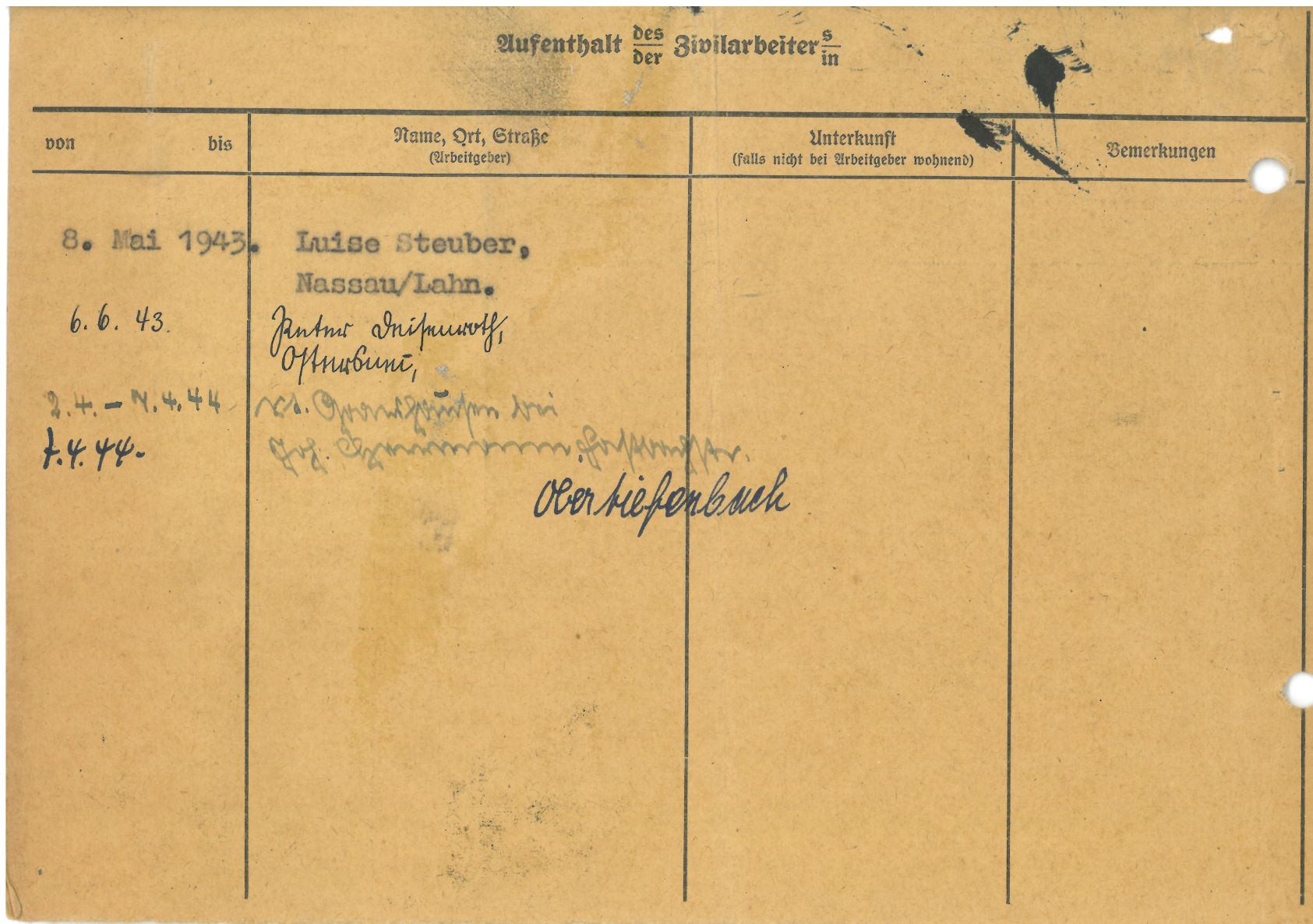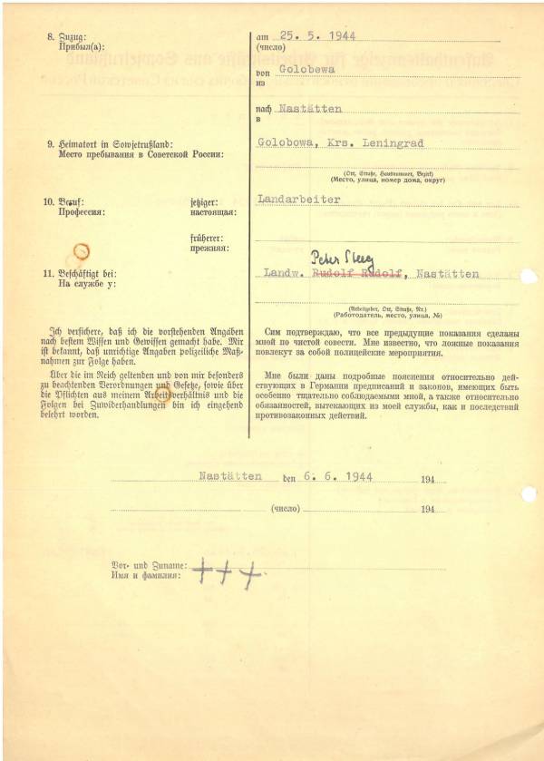 Im Oktober 1939 wurde die Einführung der Arbeitspflicht für Polen zwischen dem 18. und 60. Lebensjahr verordnet. Ab Sommer 1941 wurden die Zwangsarbeitsmaßnahmen auch auf den sowjetisch besetzen Teil Polens übertragen. Mehr und mehr wurden auch Jugendliche und selbst Kinder zur Zwangsarbeit herangezogen. Im Oktober 1940 arbeiteten in der deutschen Landwirtschaft etwa 400.000, in der Industrie rund 140.000 sogenannte Zivilarbeiter aus Polen und Sowjetrussland. Auch in Nastätten wurden Zivilarbeiter überwiegend in der Landwirtschaft eingesetzt. Finden sie Aufenthaltsbescheinigungen und Ausweise der in Nastätten eingesetzten Zivilarbeiter.