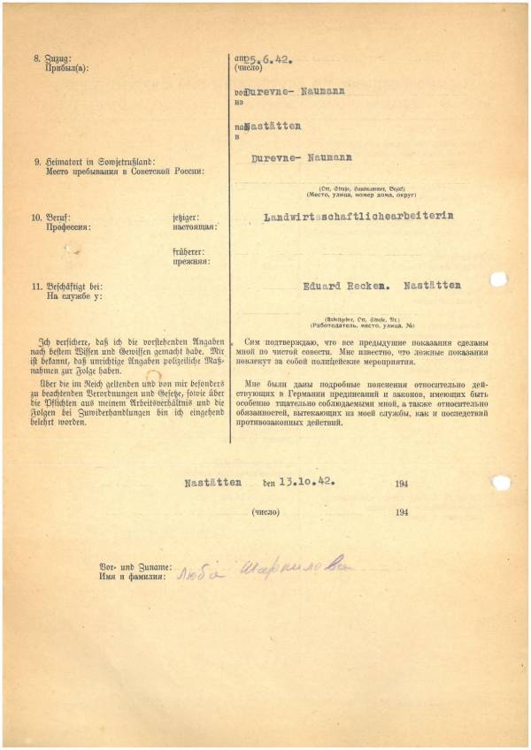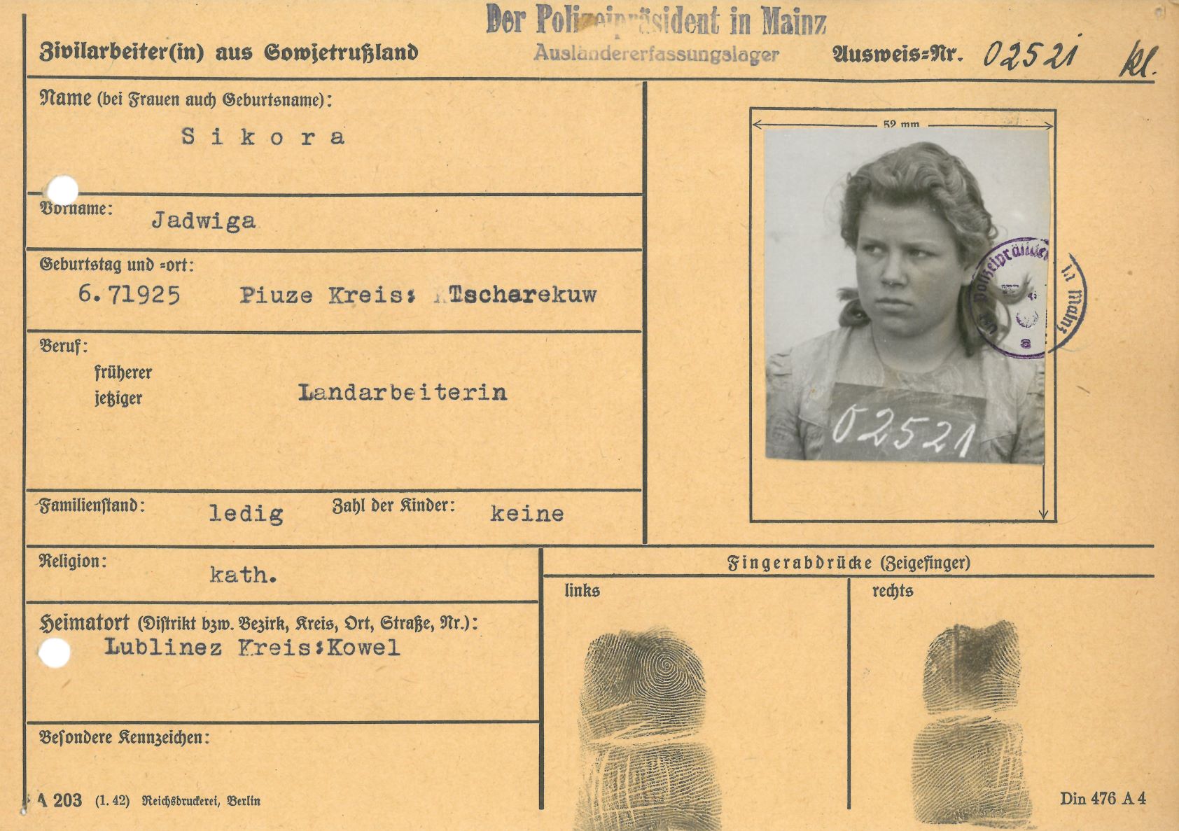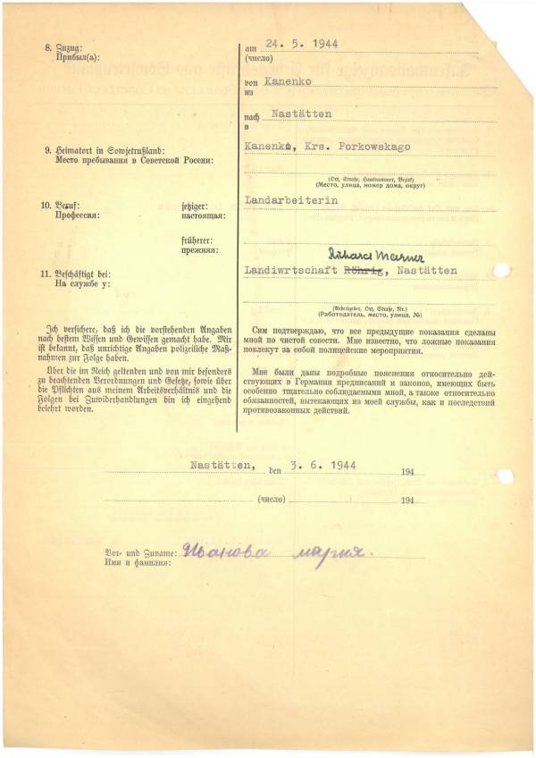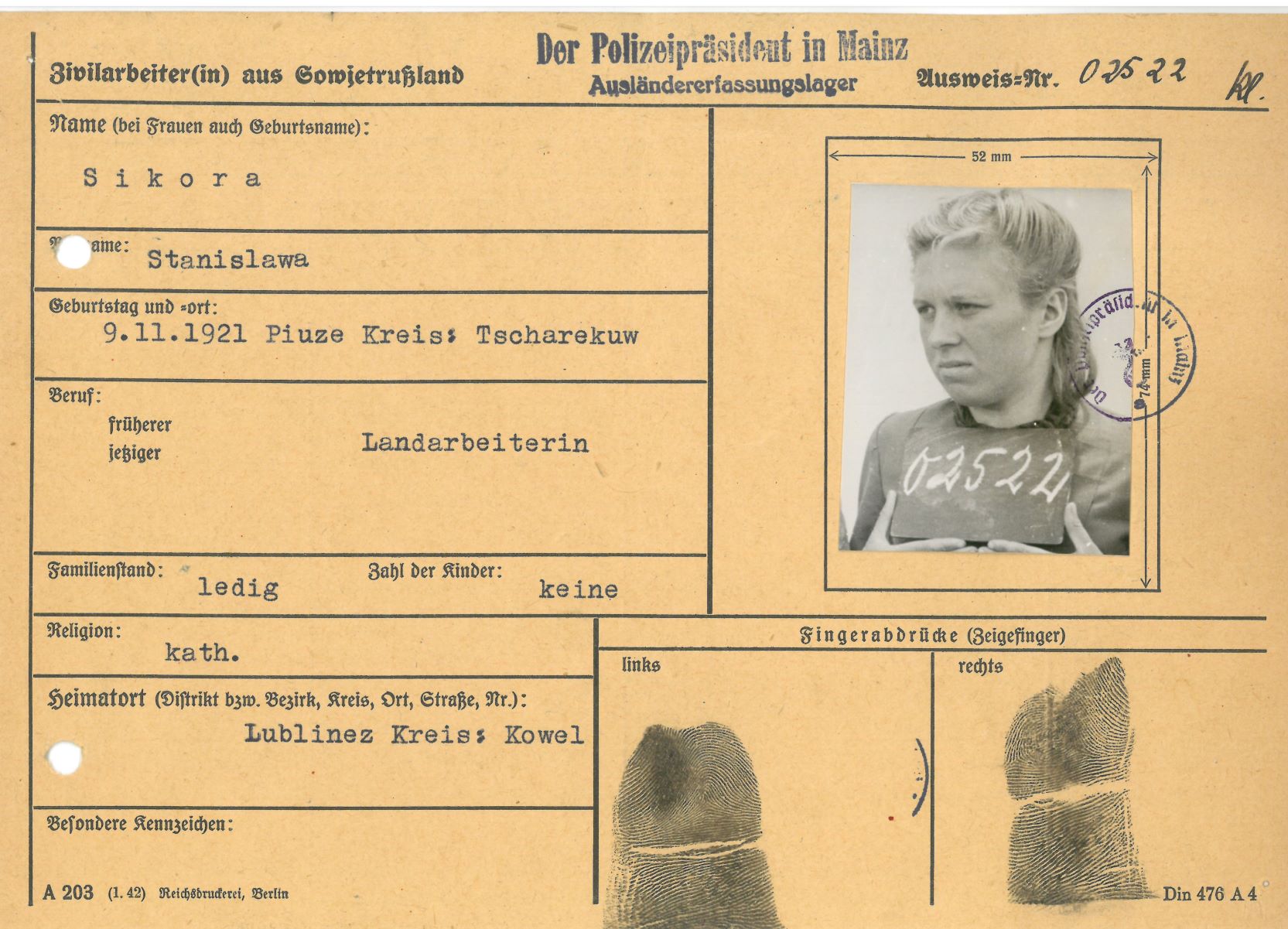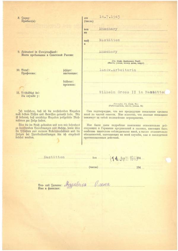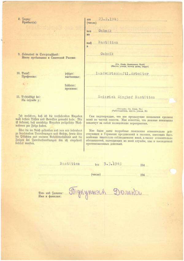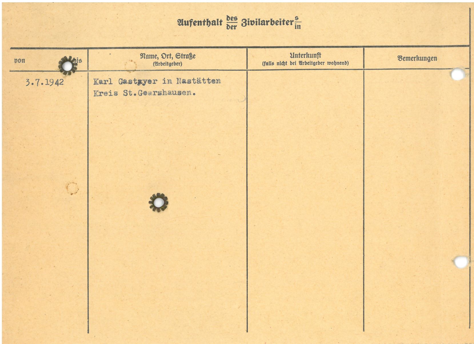 Im Oktober 1939 wurde die Einführung der Arbeitspflicht für Polen zwischen dem 18. und 60. Lebensjahr verordnet. Ab Sommer 1941 wurden die Zwangsarbeitsmaßnahmen auch auf den sowjetisch besetzen Teil Polens übertragen. Mehr und mehr wurden auch Jugendliche und selbst Kinder zur Zwangsarbeit herangezogen. Im Oktober 1940 arbeiteten in der deutschen Landwirtschaft etwa 400.000, in der Industrie rund 140.000 sogenannte Zivilarbeiter aus Polen und Sowjetrussland. Auch in Nastätten wurden Zivilarbeiter überwiegend in der Landwirtschaft eingesetzt. Finden sie Aufenthaltsbescheinigungen und Ausweise der in Nastätten eingesetzten Zivilarbeiter.
