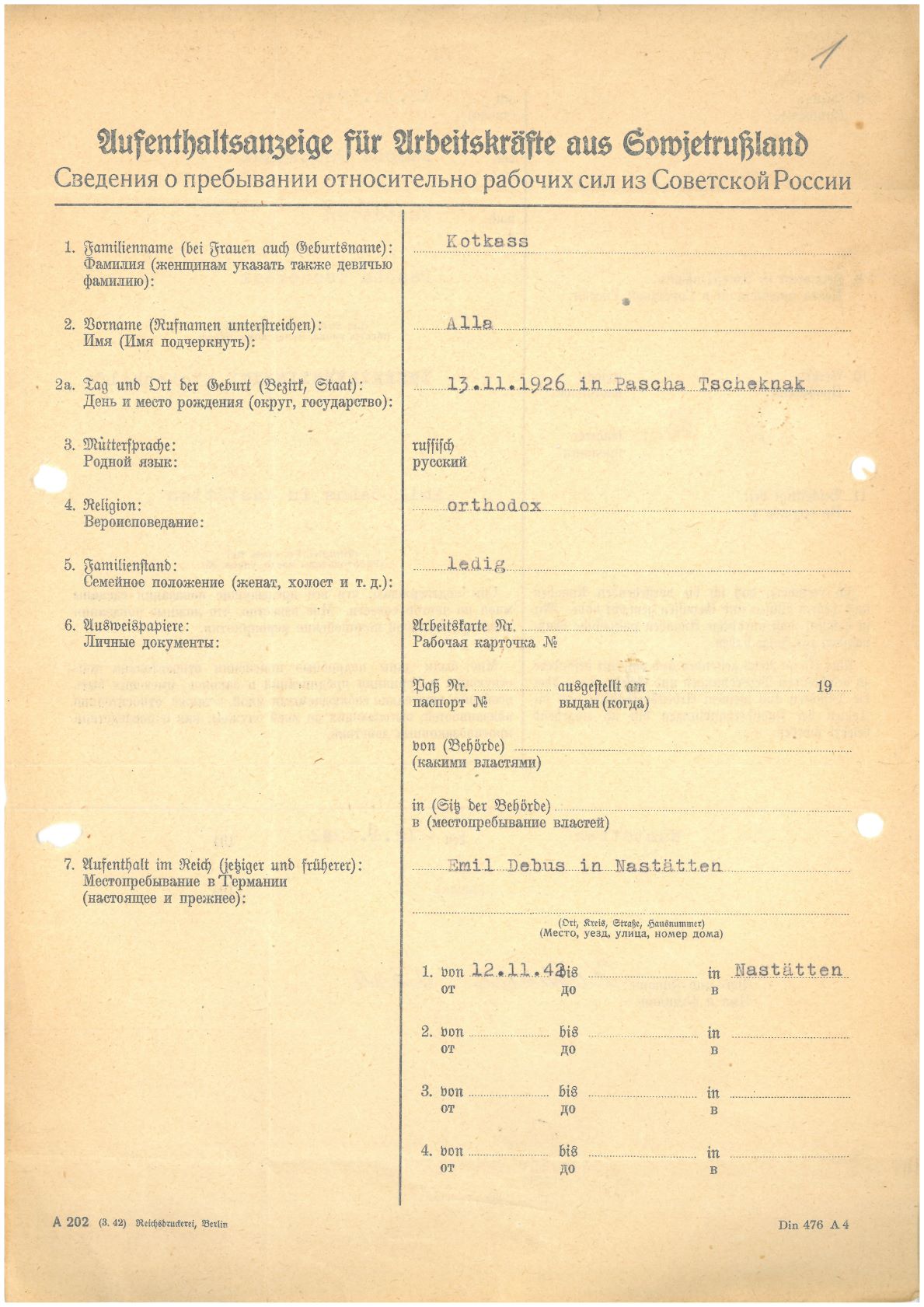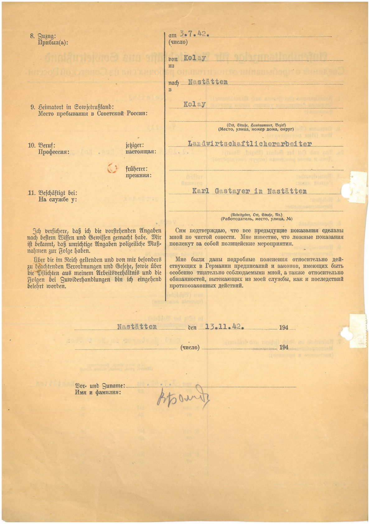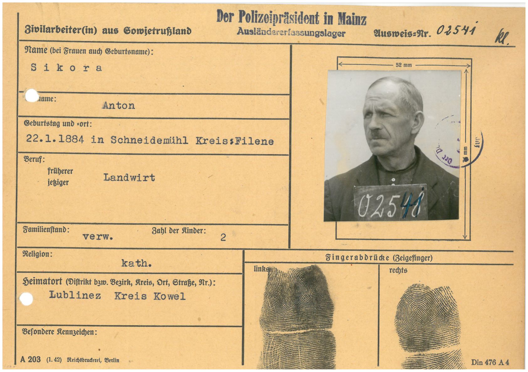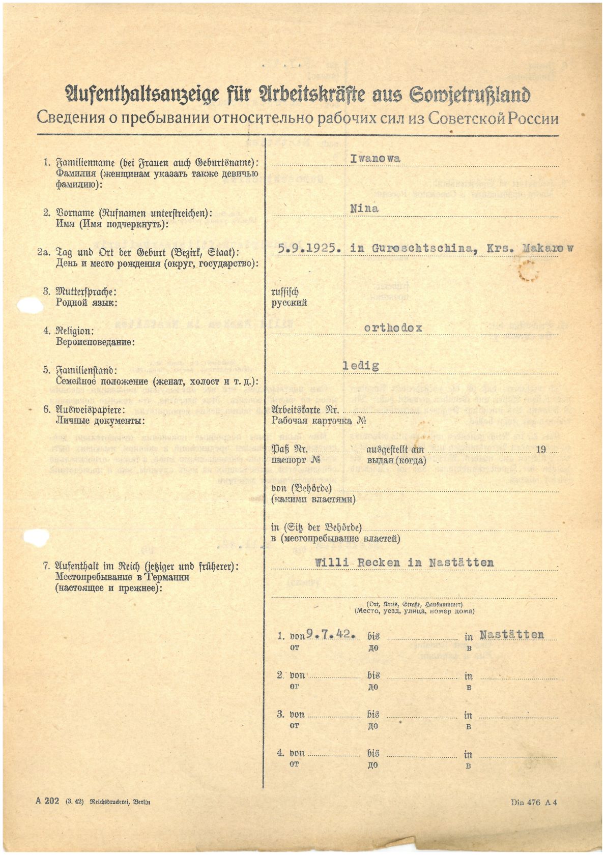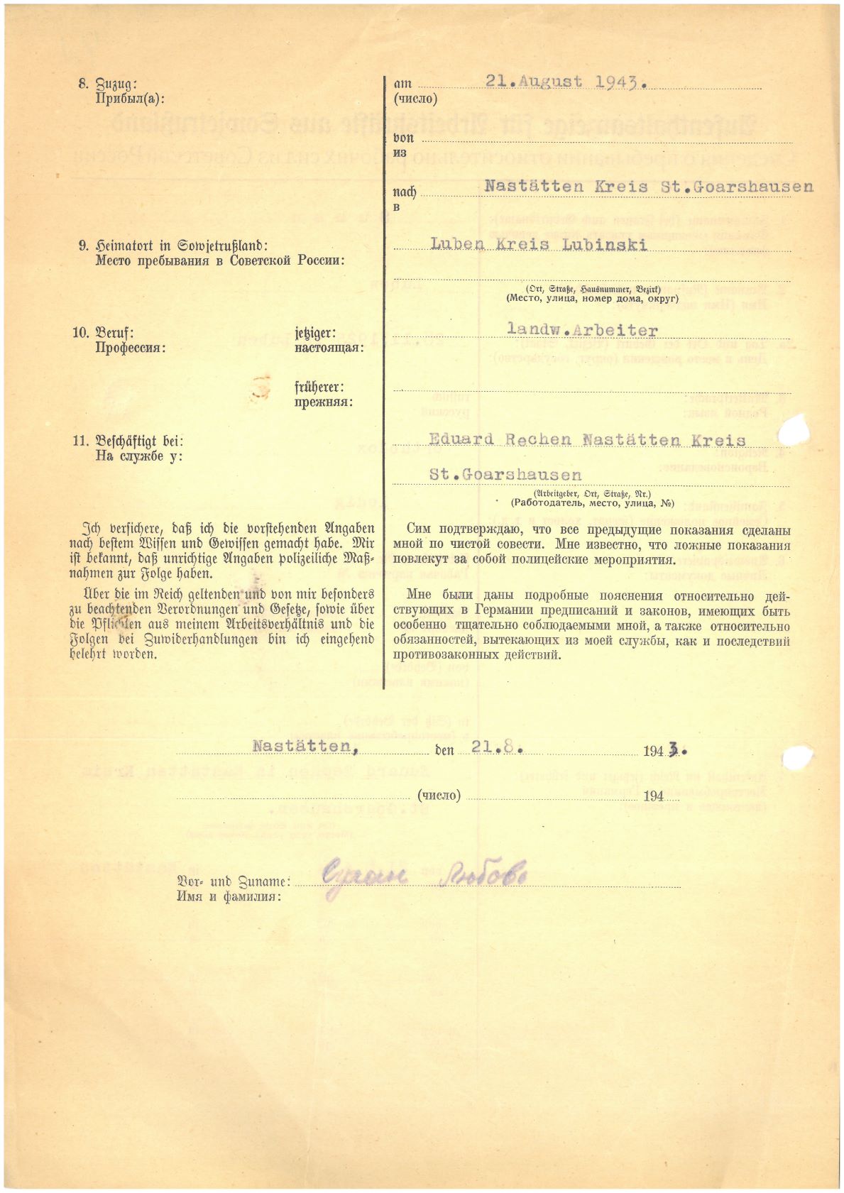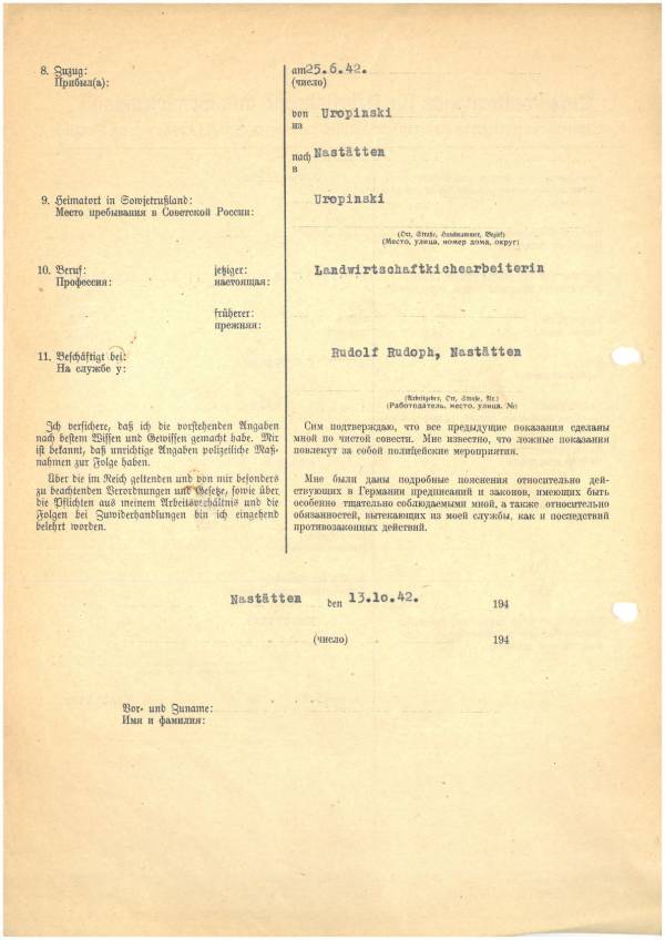 Im Oktober 1939 wurde die Einführung der Arbeitspflicht für Polen zwischen dem 18. und 60. Lebensjahr verordnet. Ab Sommer 1941 wurden die Zwangsarbeitsmaßnahmen auch auf den sowjetisch besetzen Teil Polens übertragen. Mehr und mehr wurden auch Jugendliche und selbst Kinder zur Zwangsarbeit herangezogen. Im Oktober 1940 arbeiteten in der deutschen Landwirtschaft etwa 400.000, in der Industrie rund 140.000 sogenannte Zivilarbeiter aus Polen und Sowjetrussland. Auch in Nastätten wurden Zivilarbeiter überwiegend in der Landwirtschaft eingesetzt. Finden sie Aufenthaltsbescheinigungen und Ausweise der in Nastätten eingesetzten Zivilarbeiter.