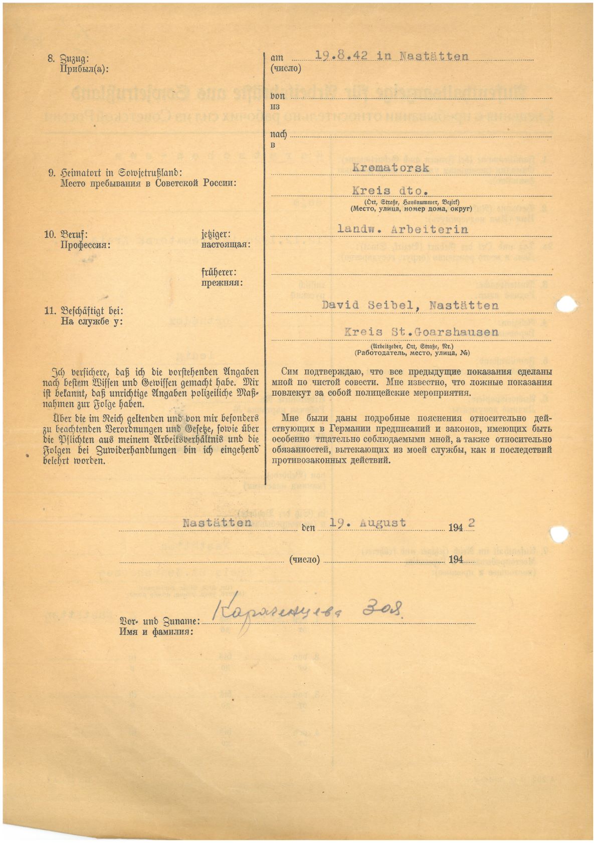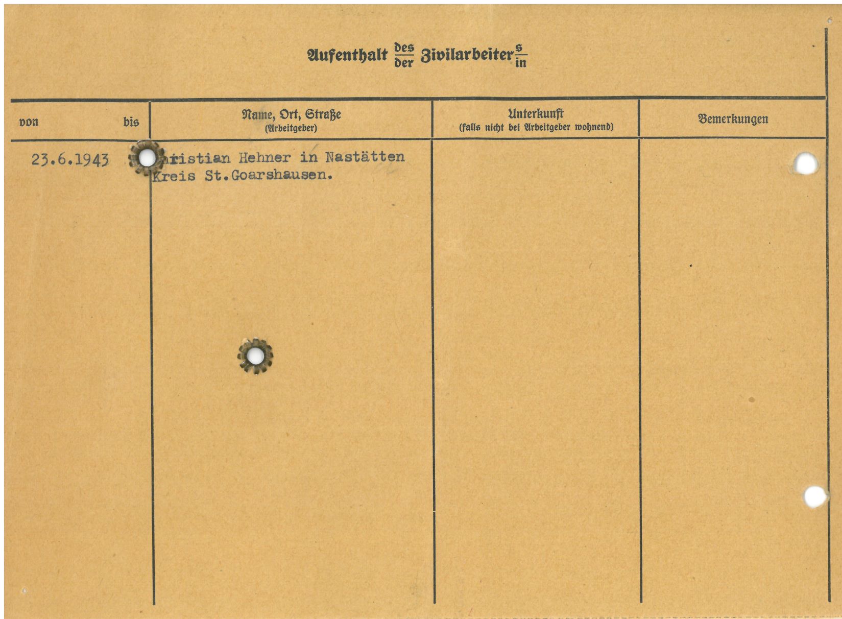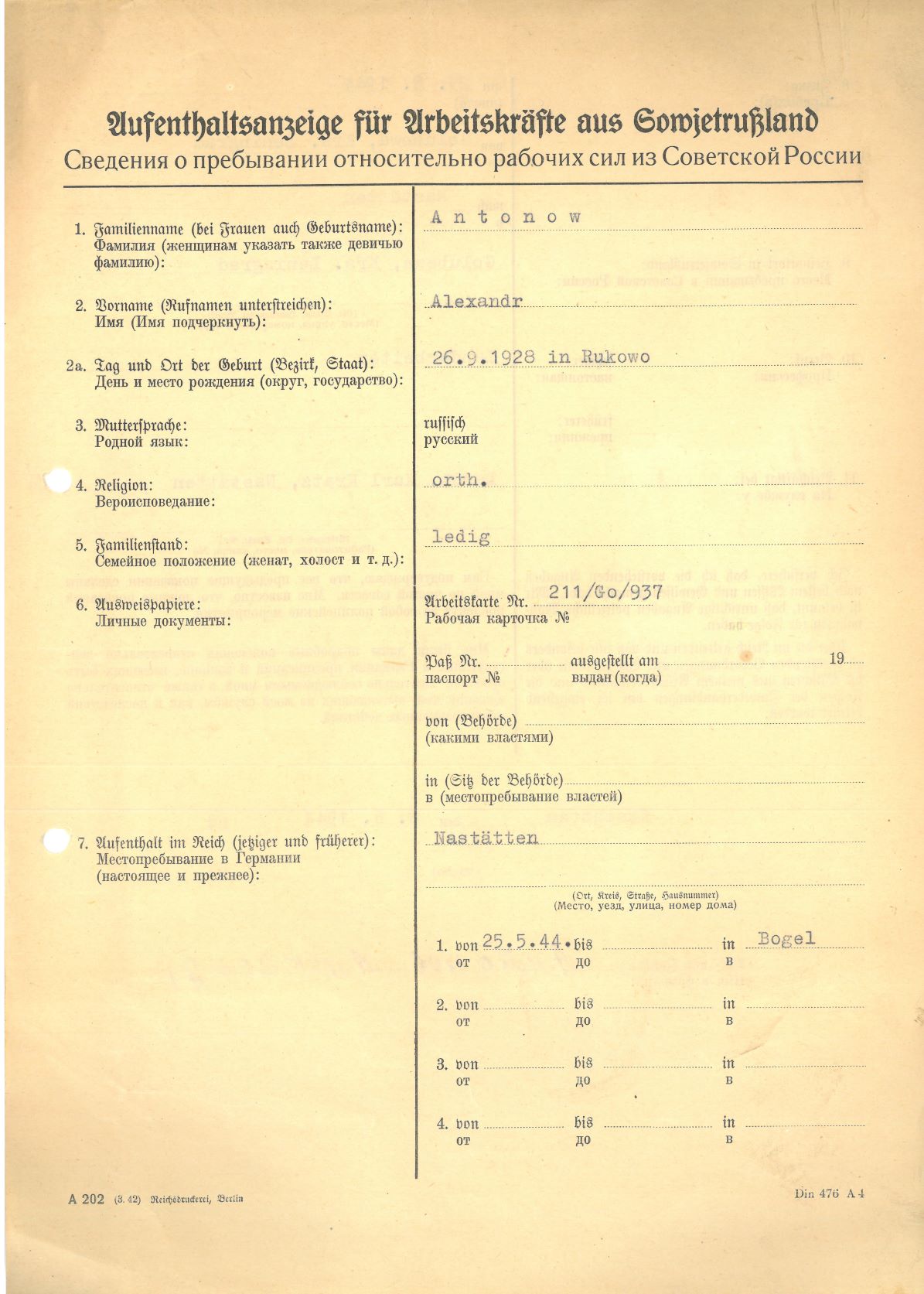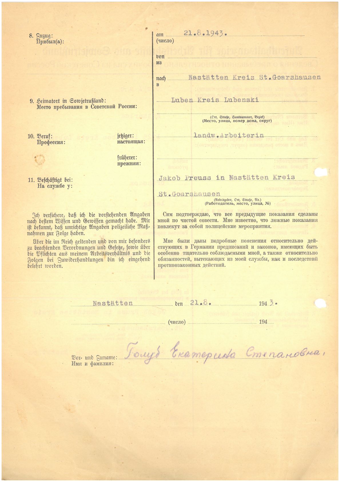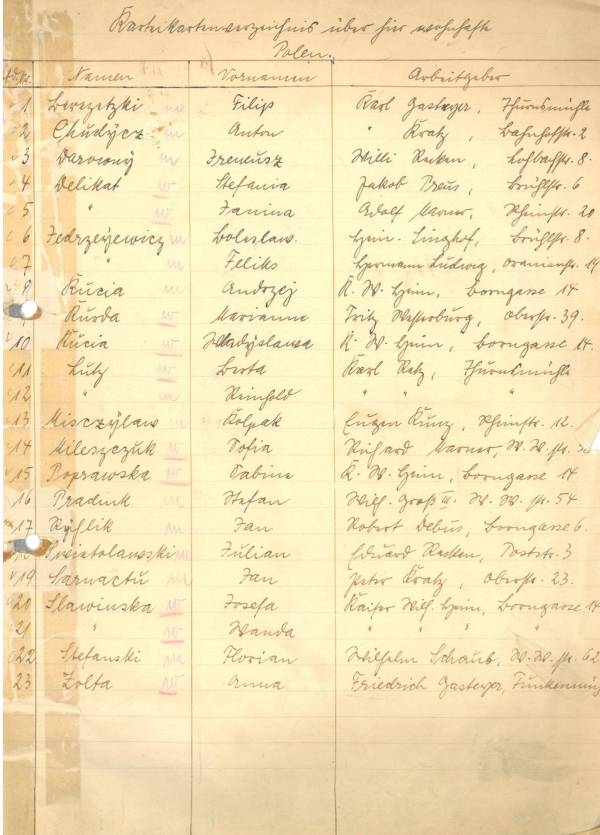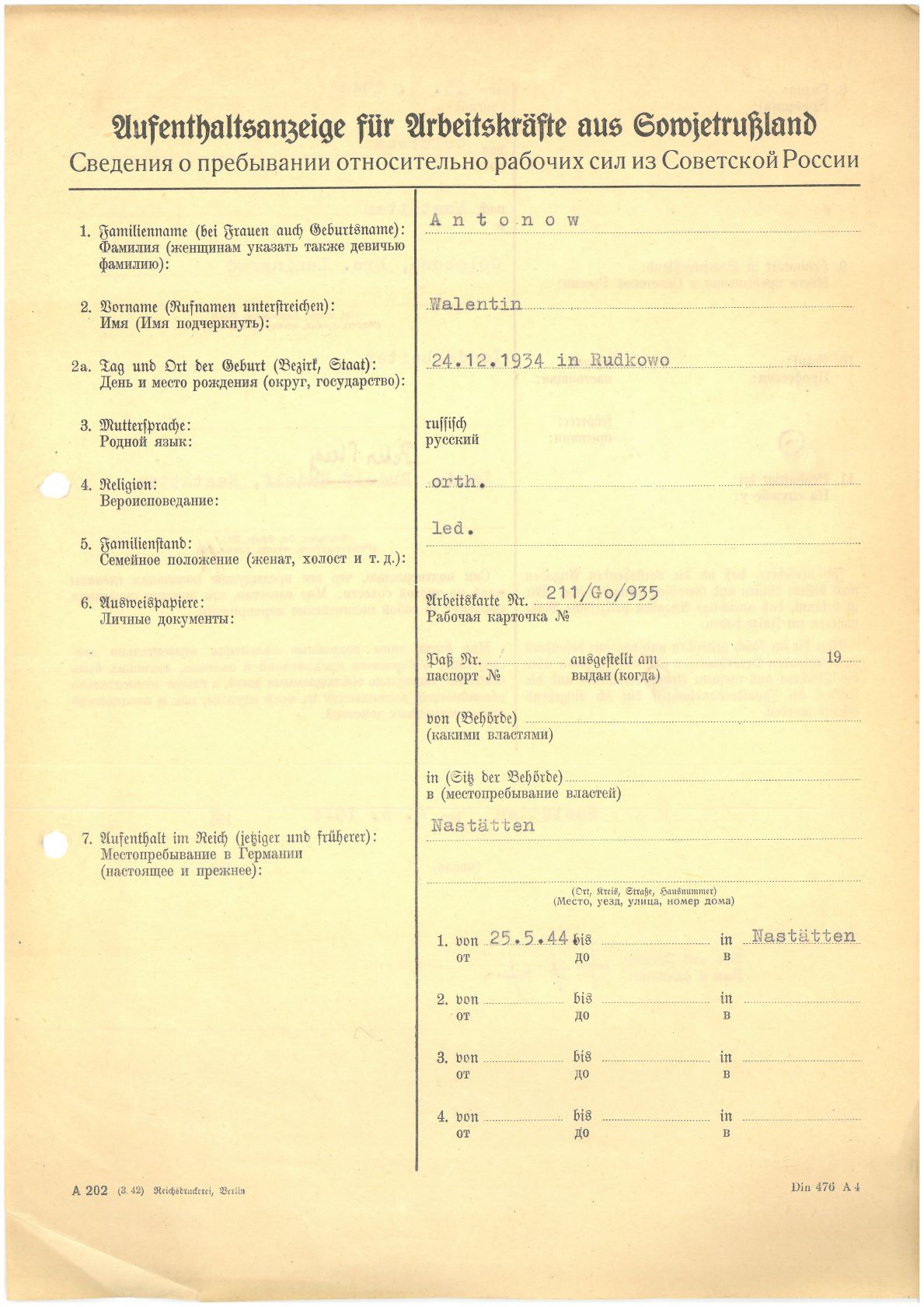 Im Oktober 1939 wurde die Einführung der Arbeitspflicht für Polen zwischen dem 18. und 60. Lebensjahr verordnet. Ab Sommer 1941 wurden die Zwangsarbeitsmaßnahmen auch auf den sowjetisch besetzen Teil Polens übertragen. Mehr und mehr wurden auch Jugendliche und selbst Kinder zur Zwangsarbeit herangezogen. Im Oktober 1940 arbeiteten in der deutschen Landwirtschaft etwa 400.000, in der Industrie rund 140.000 sogenannte Zivilarbeiter aus Polen und Sowjetrussland. Auch in Nastätten wurden Zivilarbeiter überwiegend in der Landwirtschaft eingesetzt. Finden sie Aufenthaltsbescheinigungen und Ausweise der in Nastätten eingesetzten Zivilarbeiter.