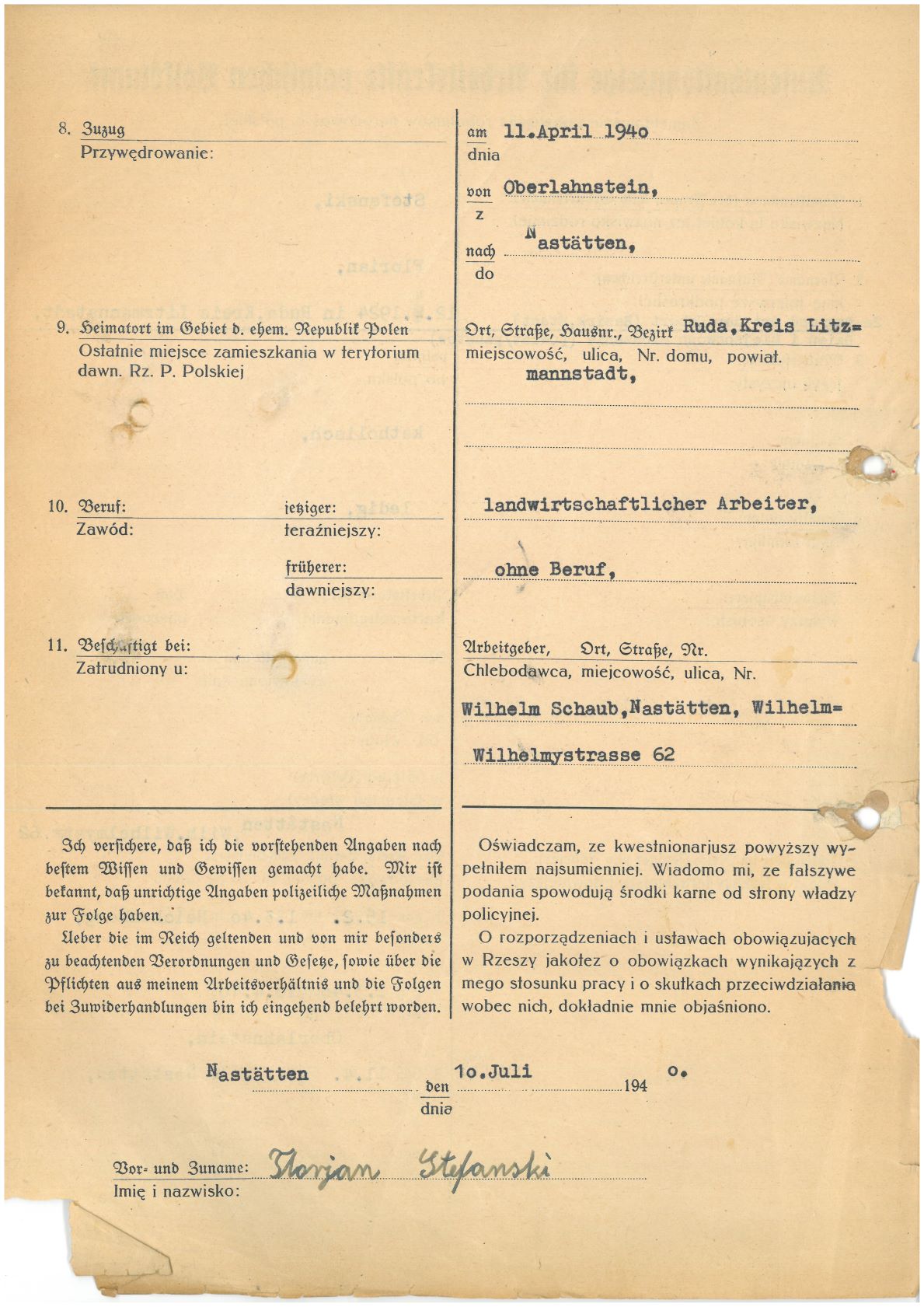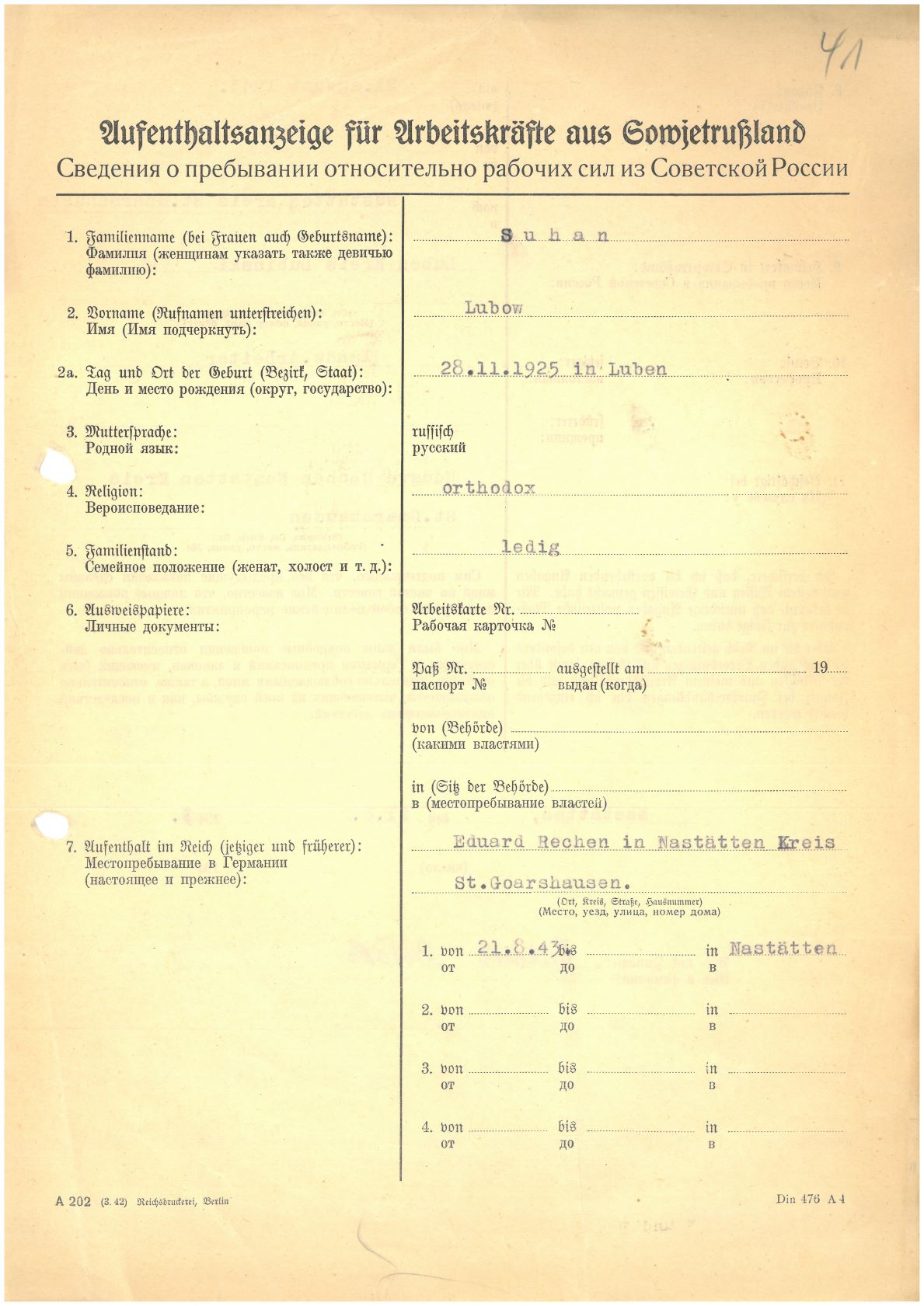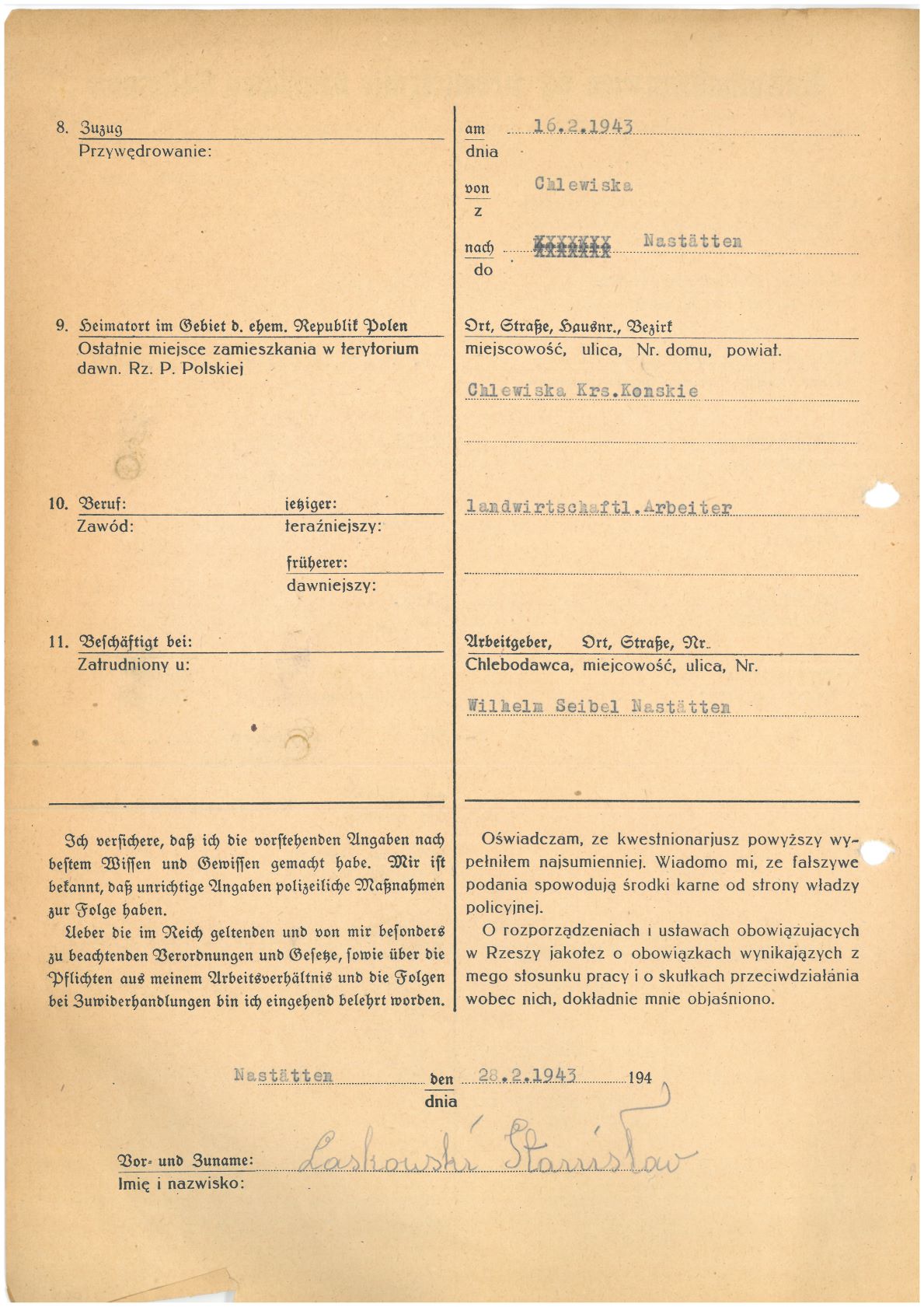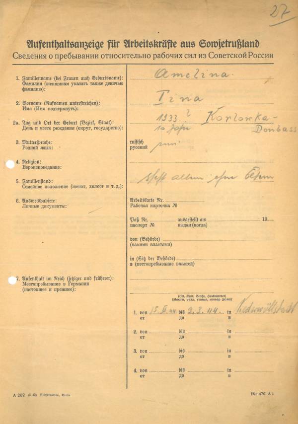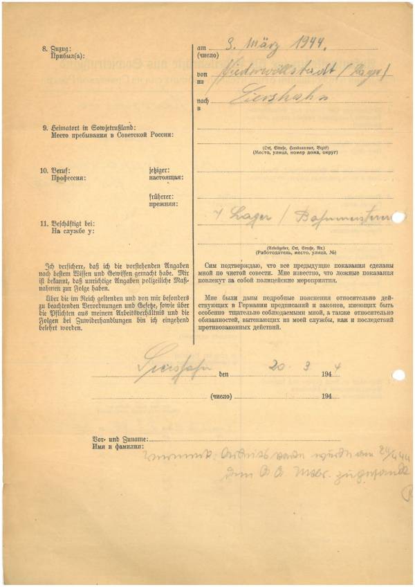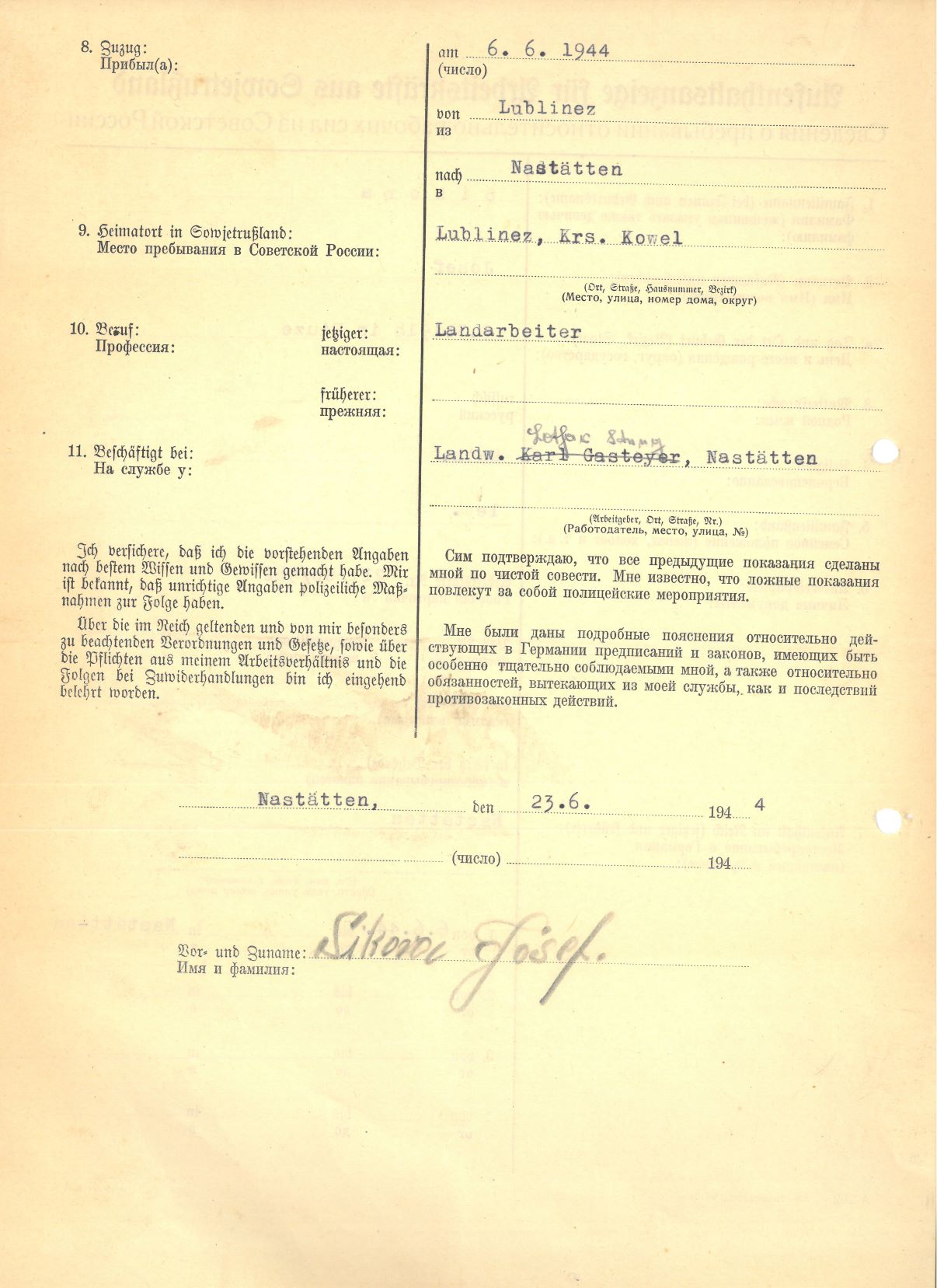 Im Oktober 1939 wurde die Einführung der Arbeitspflicht für Polen zwischen dem 18. und 60. Lebensjahr verordnet. Ab Sommer 1941 wurden die Zwangsarbeitsmaßnahmen auch auf den sowjetisch besetzen Teil Polens übertragen. Mehr und mehr wurden auch Jugendliche und selbst Kinder zur Zwangsarbeit herangezogen. Im Oktober 1940 arbeiteten in der deutschen Landwirtschaft etwa 400.000, in der Industrie rund 140.000 sogenannte Zivilarbeiter aus Polen und Sowjetrussland. Auch in Nastätten wurden Zivilarbeiter überwiegend in der Landwirtschaft eingesetzt. Finden sie Aufenthaltsbescheinigungen und Ausweise der in Nastätten eingesetzten Zivilarbeiter.