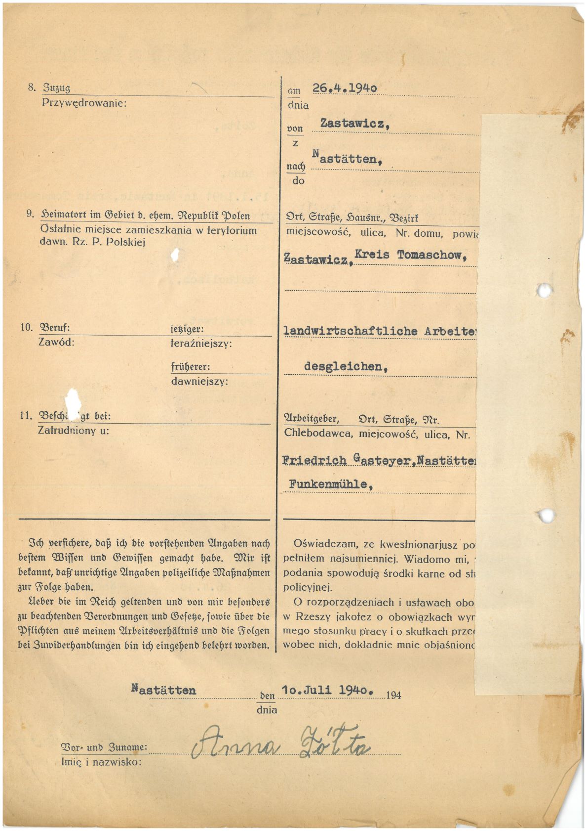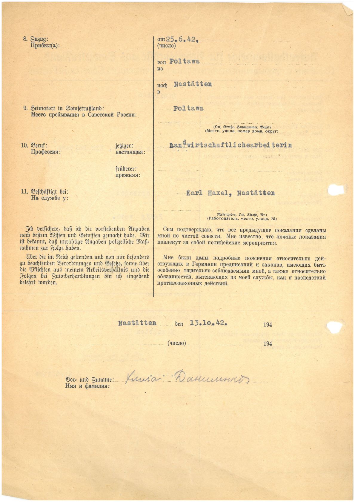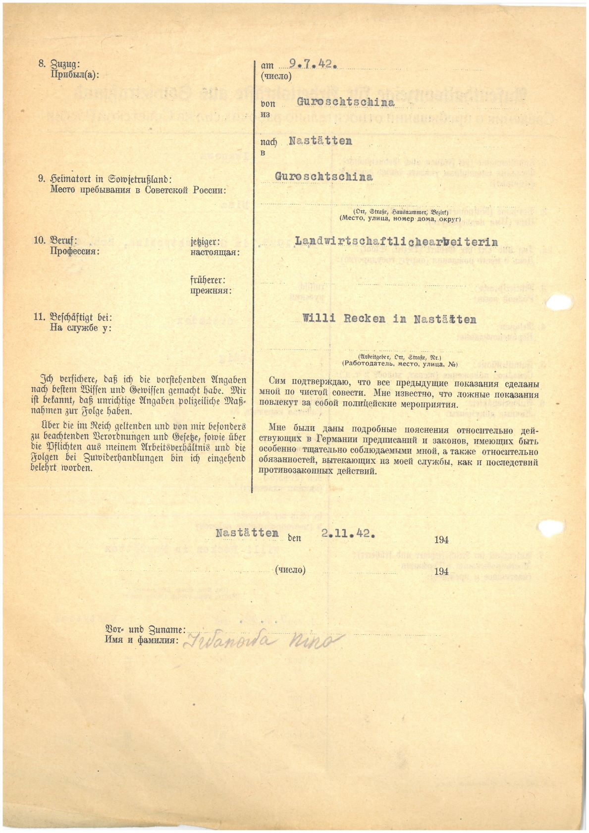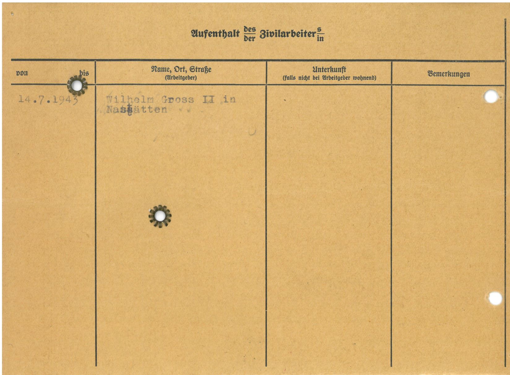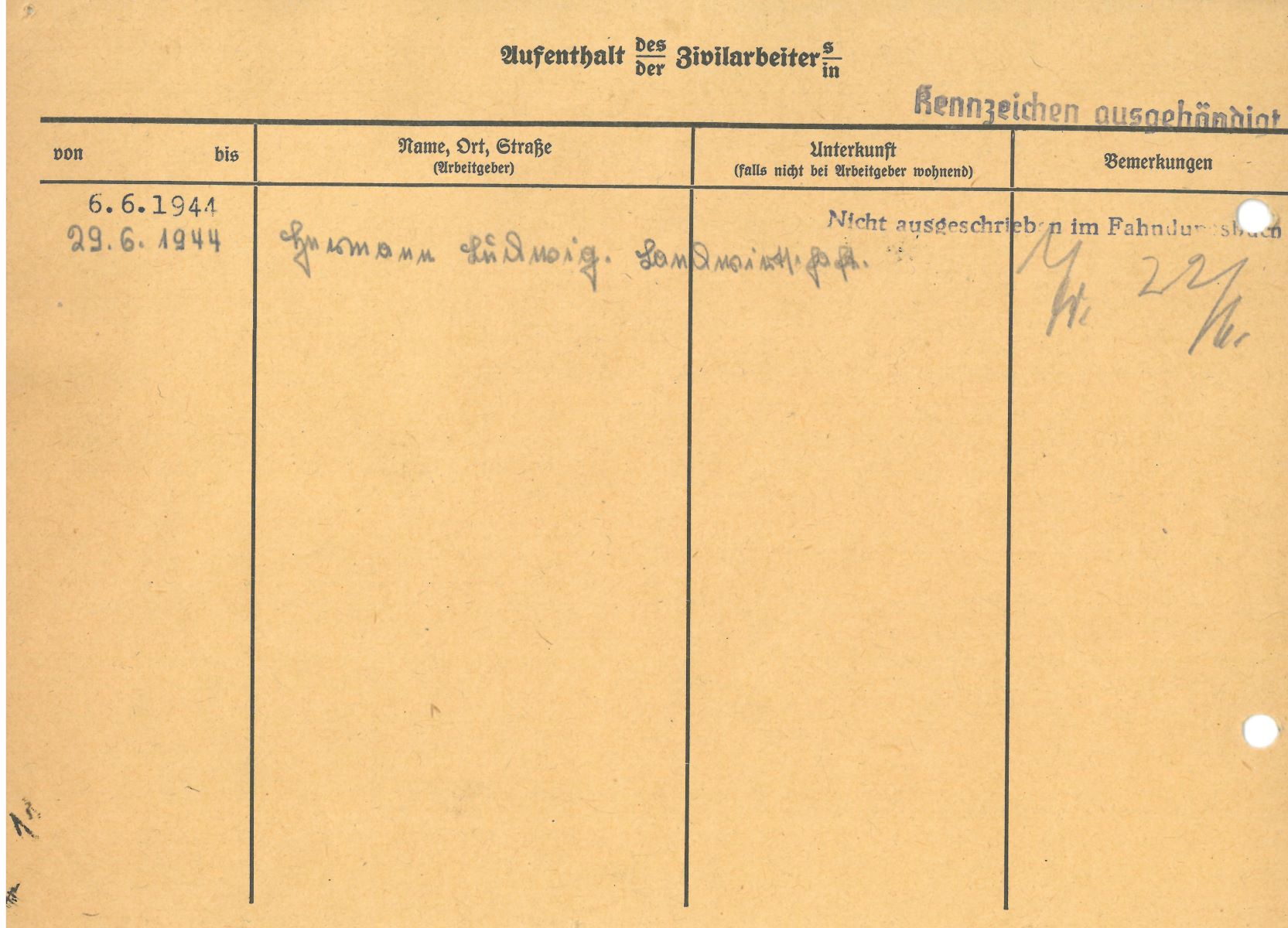 Im Oktober 1939 wurde die Einführung der Arbeitspflicht für Polen zwischen dem 18. und 60. Lebensjahr verordnet. Ab Sommer 1941 wurden die Zwangsarbeitsmaßnahmen auch auf den sowjetisch besetzen Teil Polens übertragen. Mehr und mehr wurden auch Jugendliche und selbst Kinder zur Zwangsarbeit herangezogen. Im Oktober 1940 arbeiteten in der deutschen Landwirtschaft etwa 400.000, in der Industrie rund 140.000 sogenannte Zivilarbeiter aus Polen und Sowjetrussland. Auch in Nastätten wurden Zivilarbeiter überwiegend in der Landwirtschaft eingesetzt. Finden sie Aufenthaltsbescheinigungen und Ausweise der in Nastätten eingesetzten Zivilarbeiter.