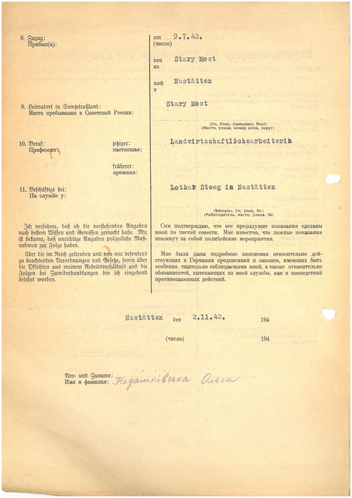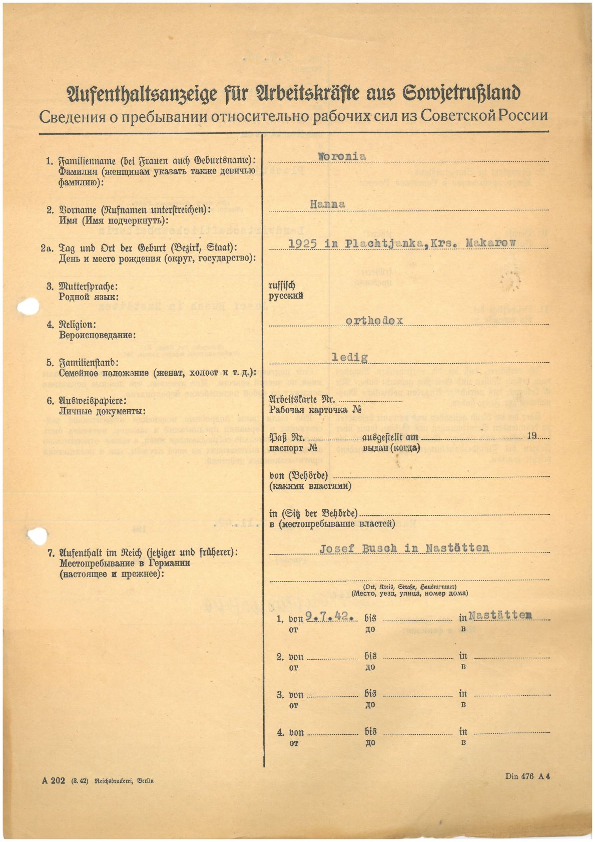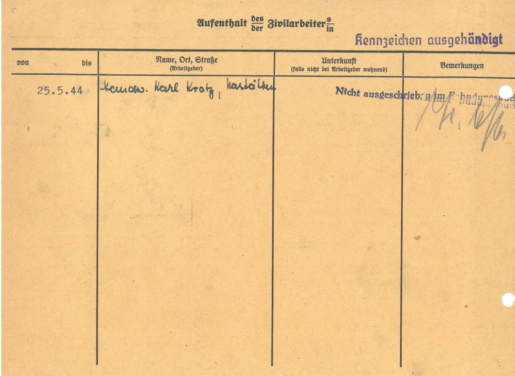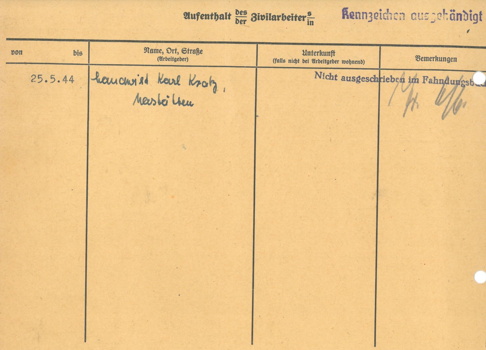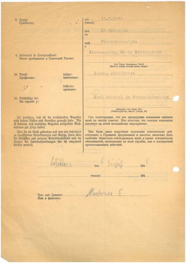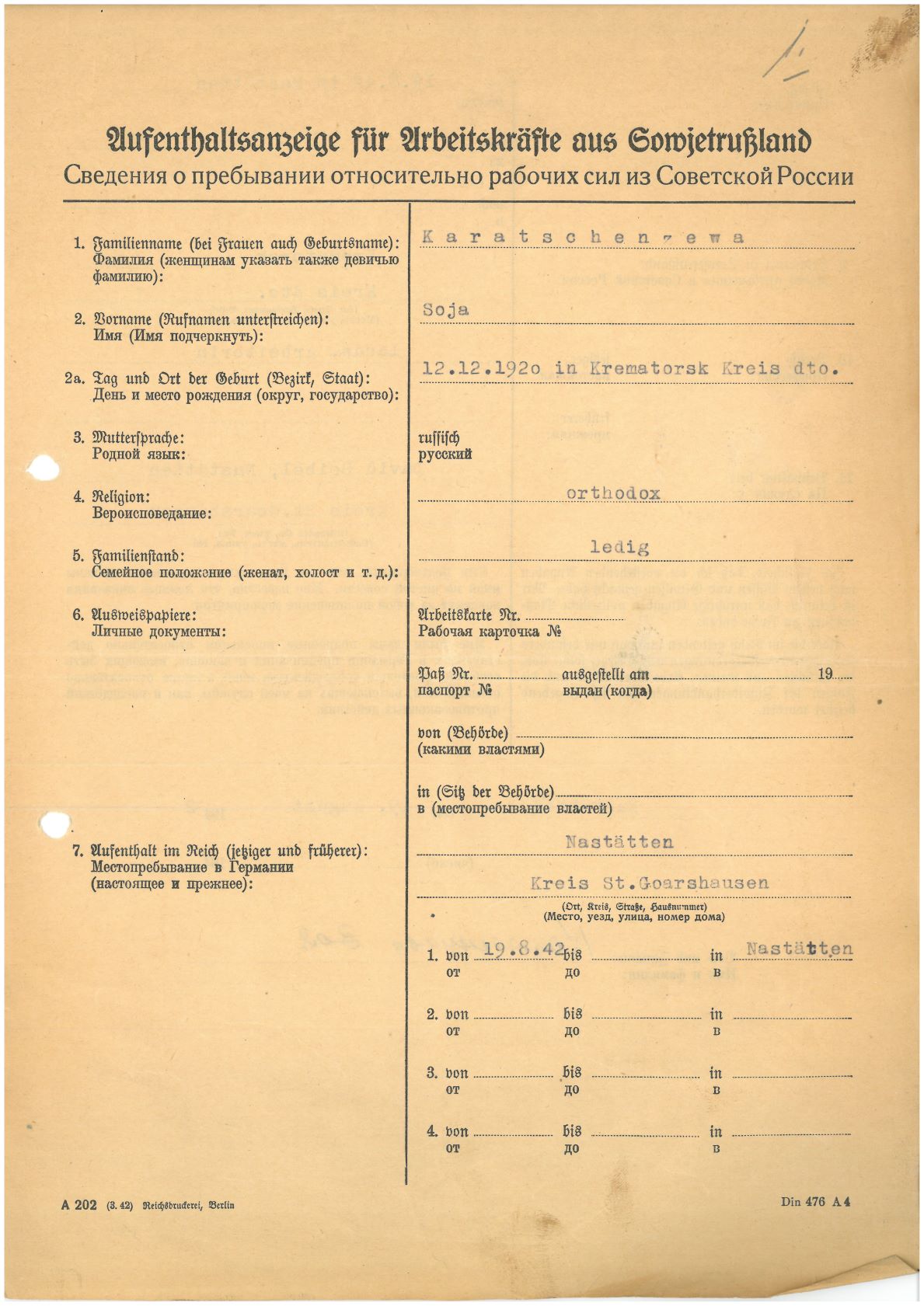Im Oktober 1939 wurde die Einführung der Arbeitspflicht für Polen zwischen dem 18. und 60. Lebensjahr verordnet. Ab Sommer 1941 wurden die Zwangsarbeitsmaßnahmen auch auf den sowjetisch besetzen Teil Polens übertragen. Mehr und mehr wurden auch Jugendliche und selbst Kinder zur Zwangsarbeit herangezogen. Im Oktober 1940 arbeiteten in der deutschen Landwirtschaft etwa 400.000, in der Industrie rund 140.000 sogenannte Zivilarbeiter aus Polen und Sowjetrussland. Auch in Nastätten wurden Zivilarbeiter überwiegend in der Landwirtschaft eingesetzt. Finden sie Aufenthaltsbescheinigungen und Ausweise der in Nastätten eingesetzten Zivilarbeiter.