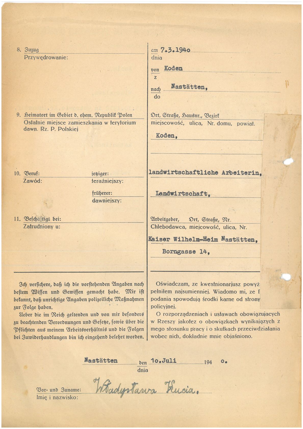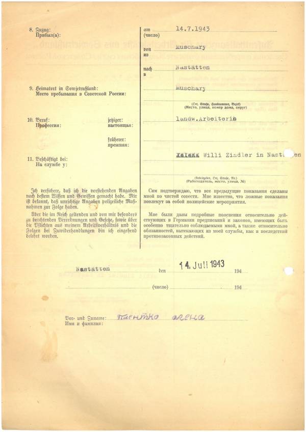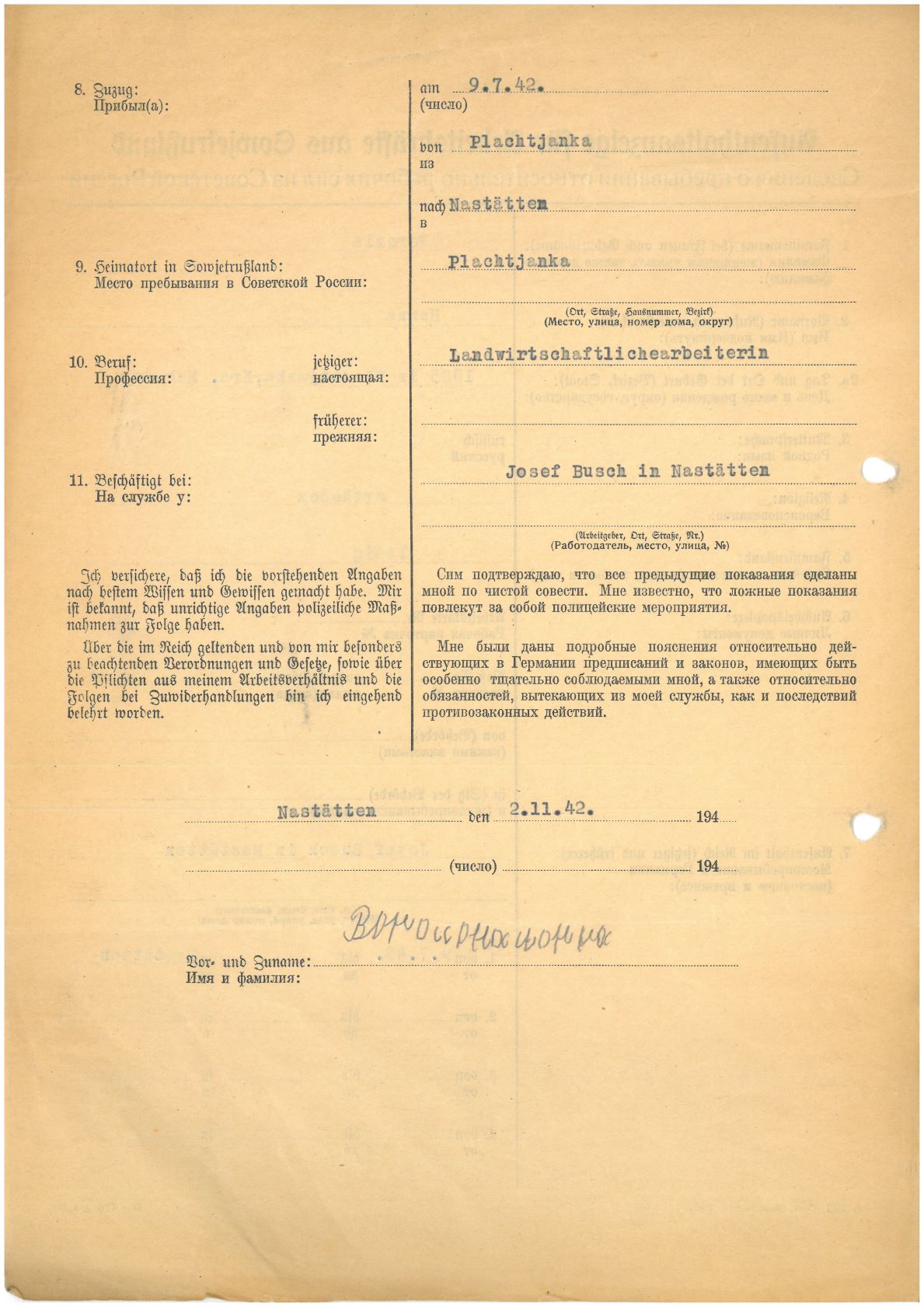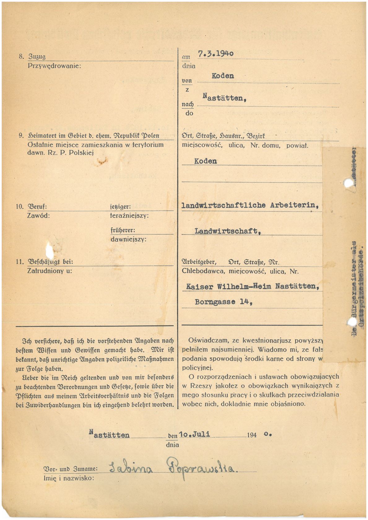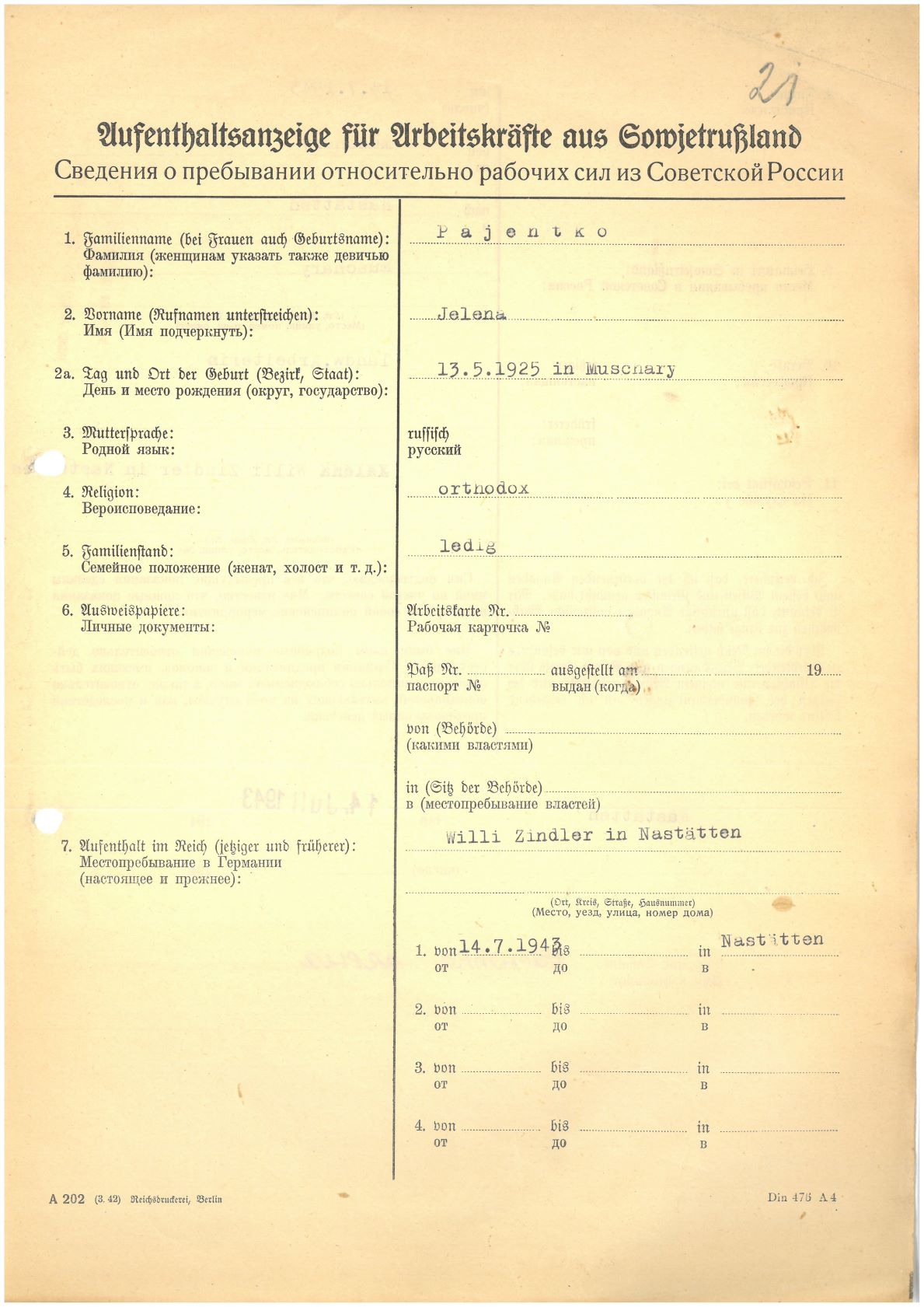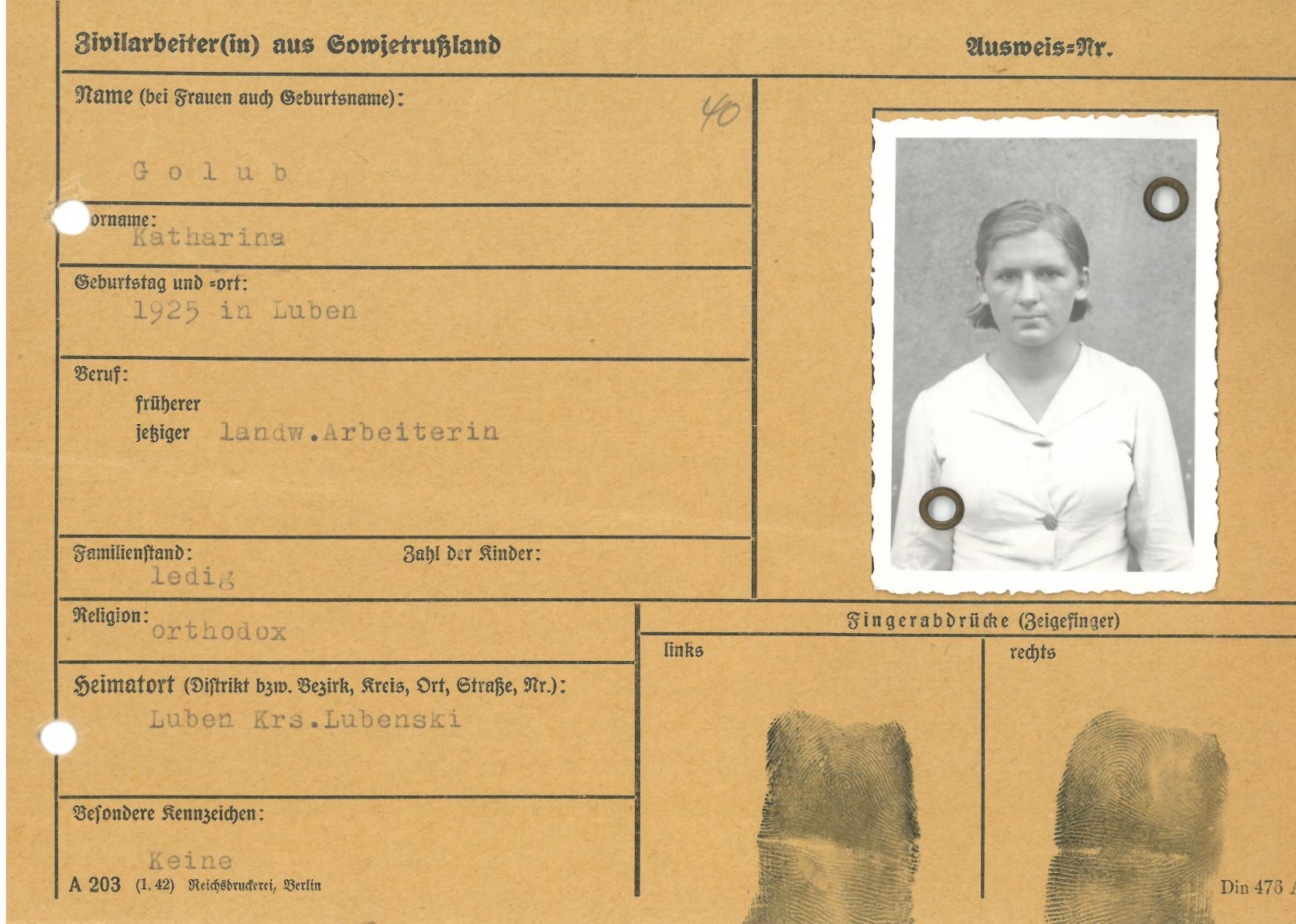 Im Oktober 1939 wurde die Einführung der Arbeitspflicht für Polen zwischen dem 18. und 60. Lebensjahr verordnet. Ab Sommer 1941 wurden die Zwangsarbeitsmaßnahmen auch auf den sowjetisch besetzen Teil Polens übertragen. Mehr und mehr wurden auch Jugendliche und selbst Kinder zur Zwangsarbeit herangezogen. Im Oktober 1940 arbeiteten in der deutschen Landwirtschaft etwa 400.000, in der Industrie rund 140.000 sogenannte Zivilarbeiter aus Polen und Sowjetrussland. Auch in Nastätten wurden Zivilarbeiter überwiegend in der Landwirtschaft eingesetzt. Finden sie Aufenthaltsbescheinigungen und Ausweise der in Nastätten eingesetzten Zivilarbeiter.