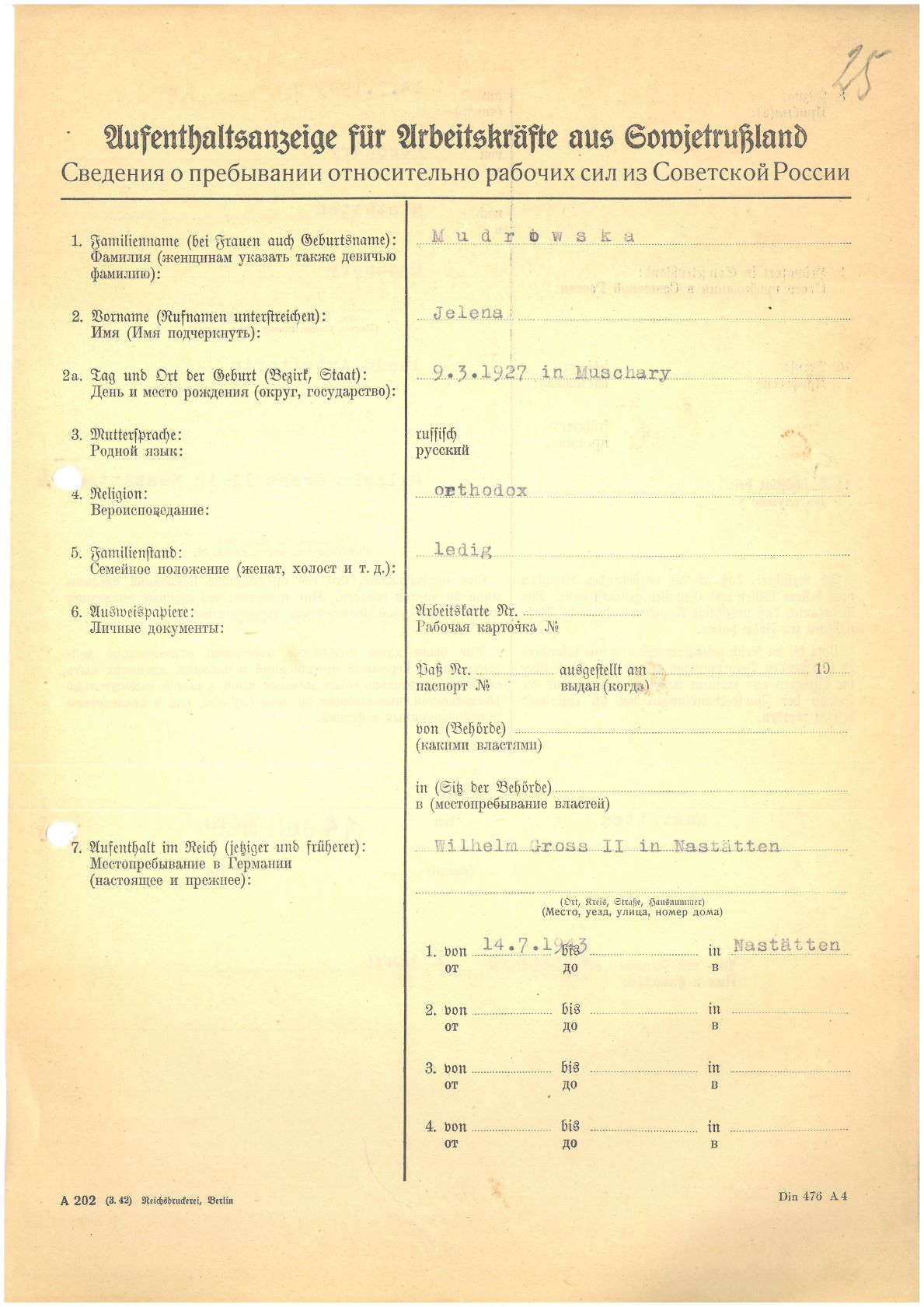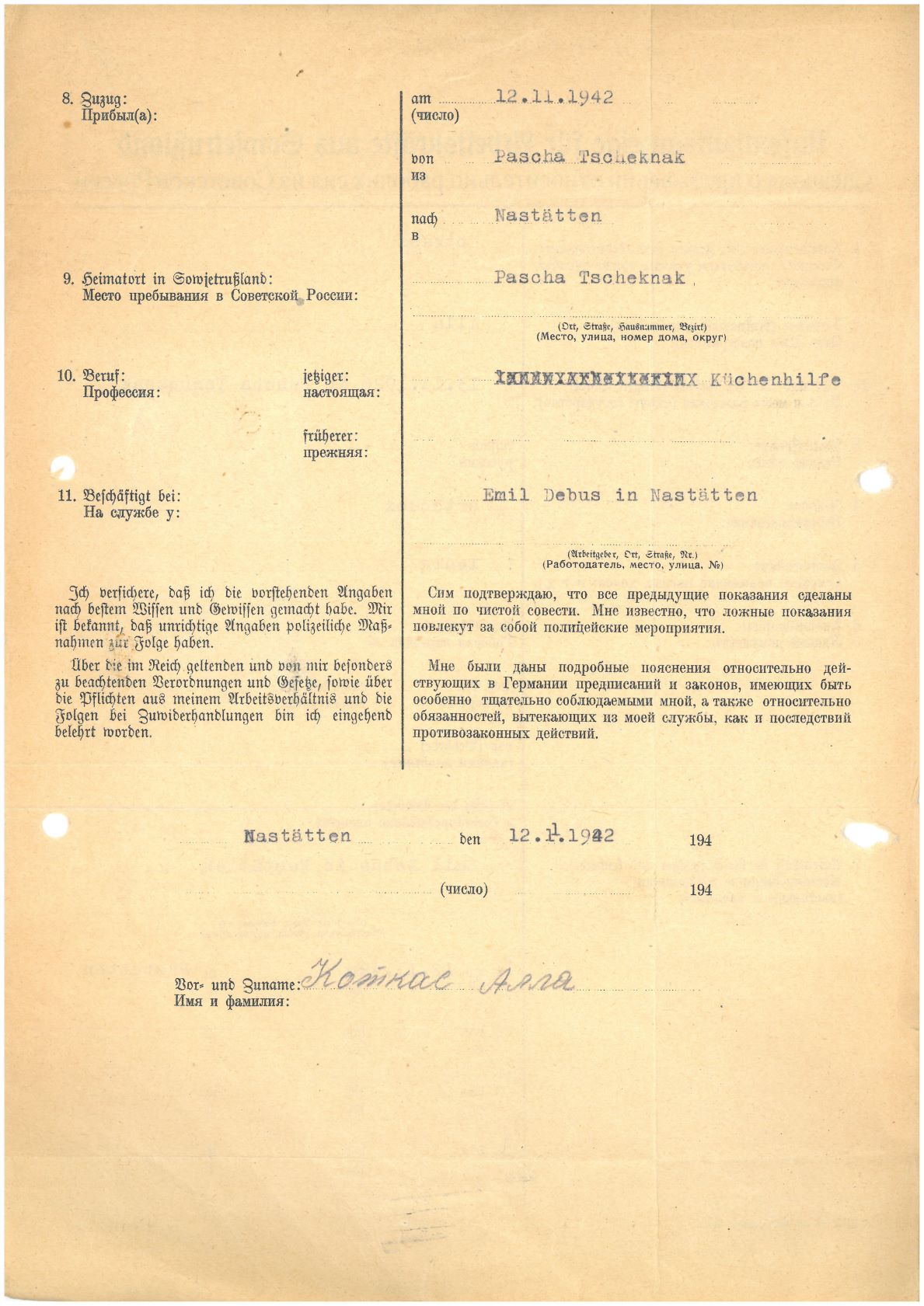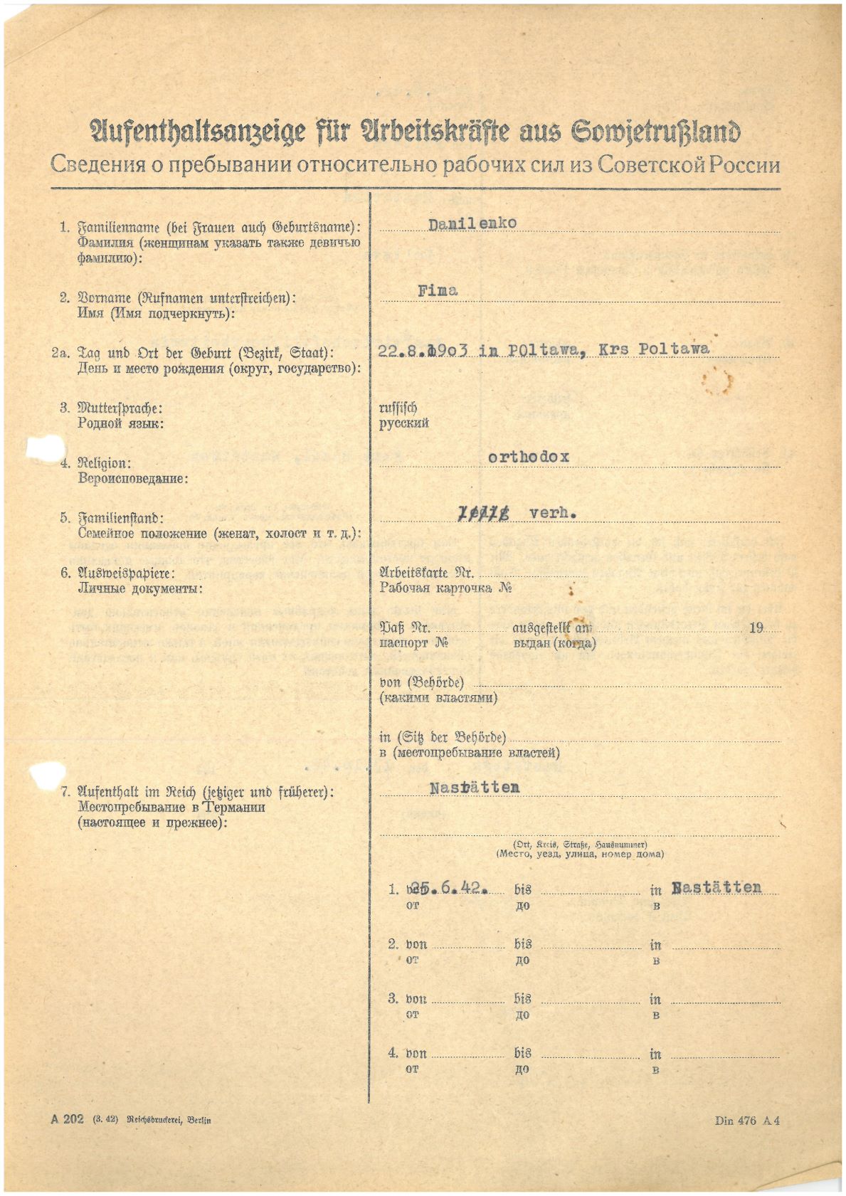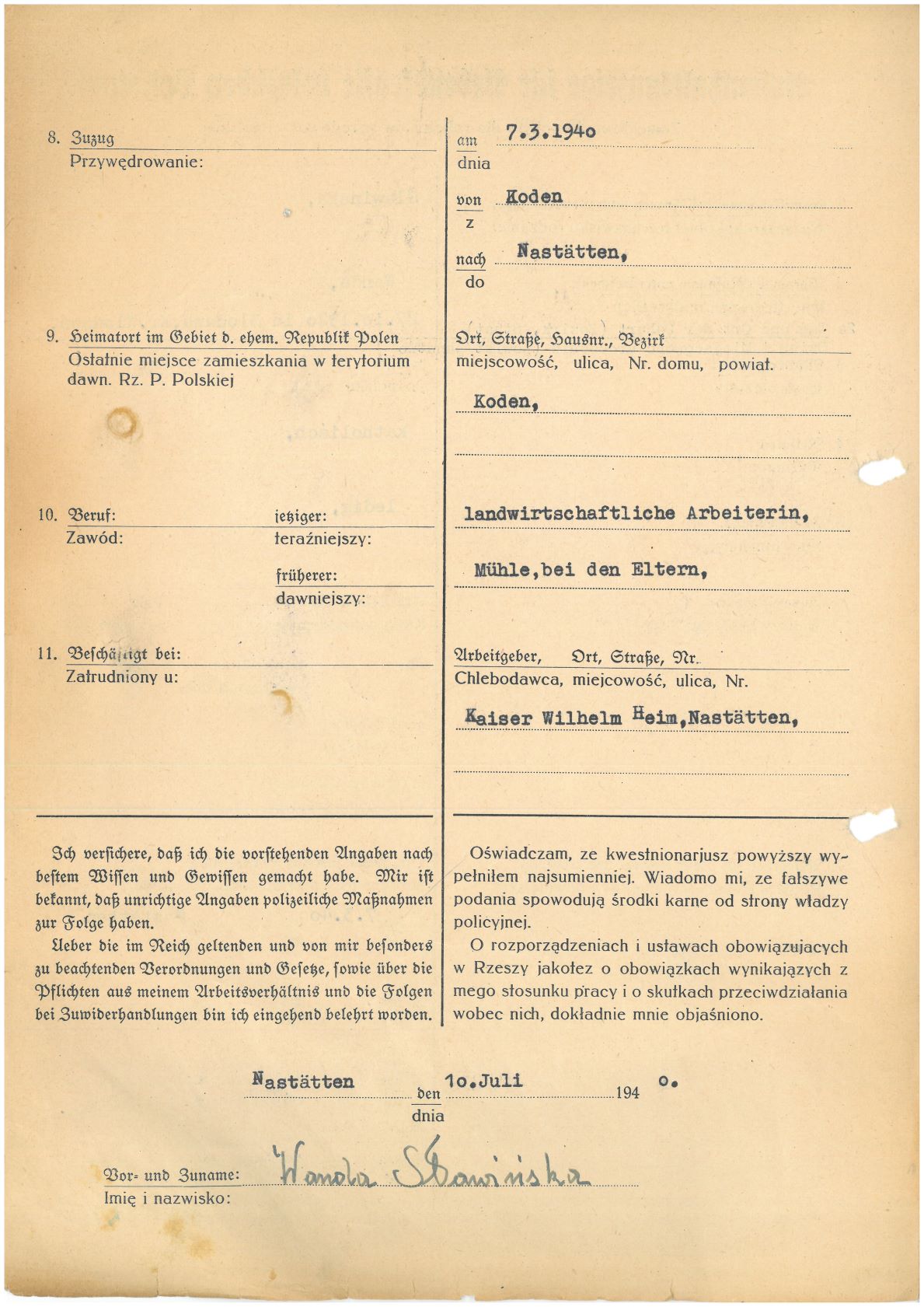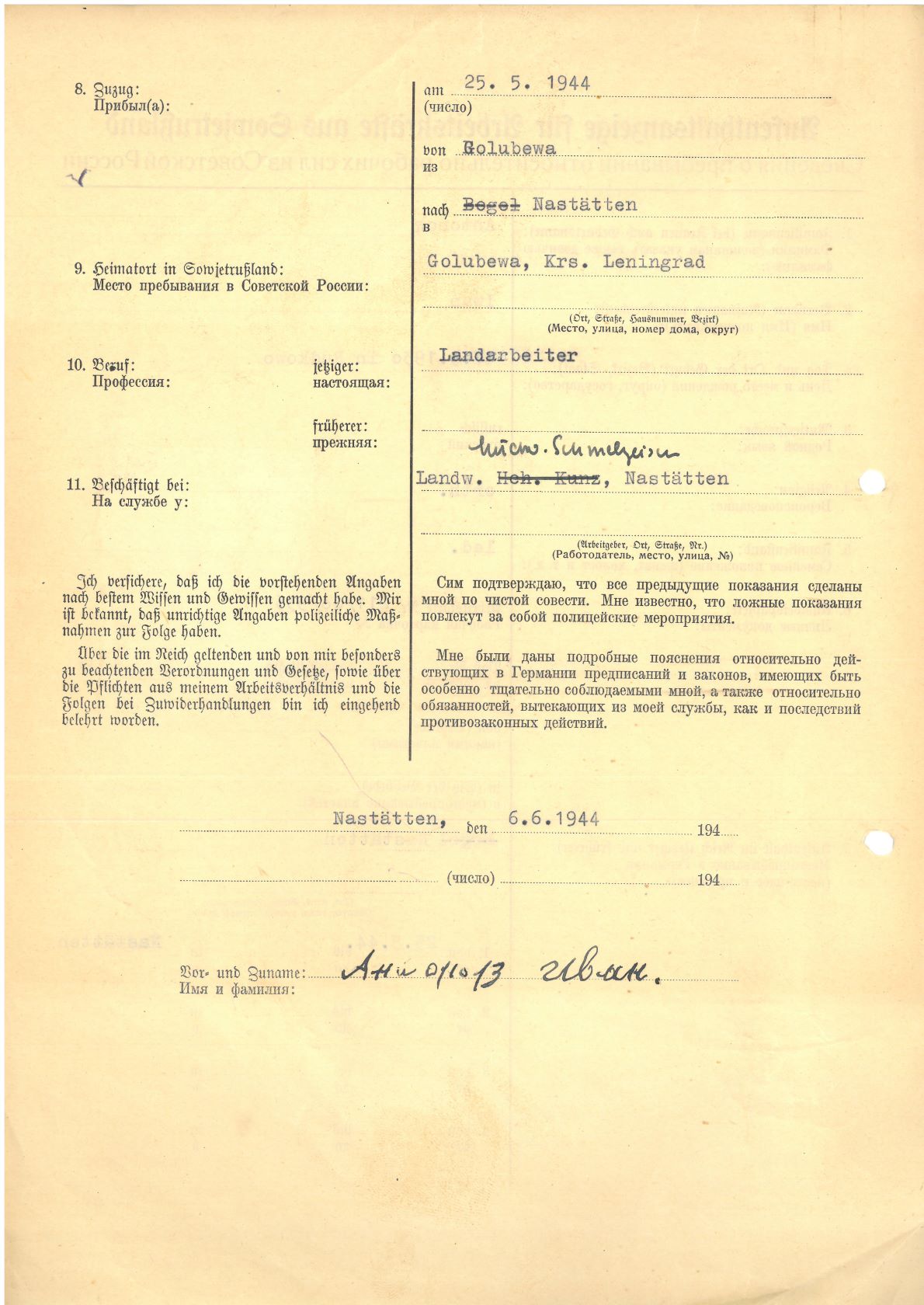 Im Oktober 1939 wurde die Einführung der Arbeitspflicht für Polen zwischen dem 18. und 60. Lebensjahr verordnet. Ab Sommer 1941 wurden die Zwangsarbeitsmaßnahmen auch auf den sowjetisch besetzen Teil Polens übertragen. Mehr und mehr wurden auch Jugendliche und selbst Kinder zur Zwangsarbeit herangezogen. Im Oktober 1940 arbeiteten in der deutschen Landwirtschaft etwa 400.000, in der Industrie rund 140.000 sogenannte Zivilarbeiter aus Polen und Sowjetrussland. Auch in Nastätten wurden Zivilarbeiter überwiegend in der Landwirtschaft eingesetzt. Finden sie Aufenthaltsbescheinigungen und Ausweise der in Nastätten eingesetzten Zivilarbeiter.