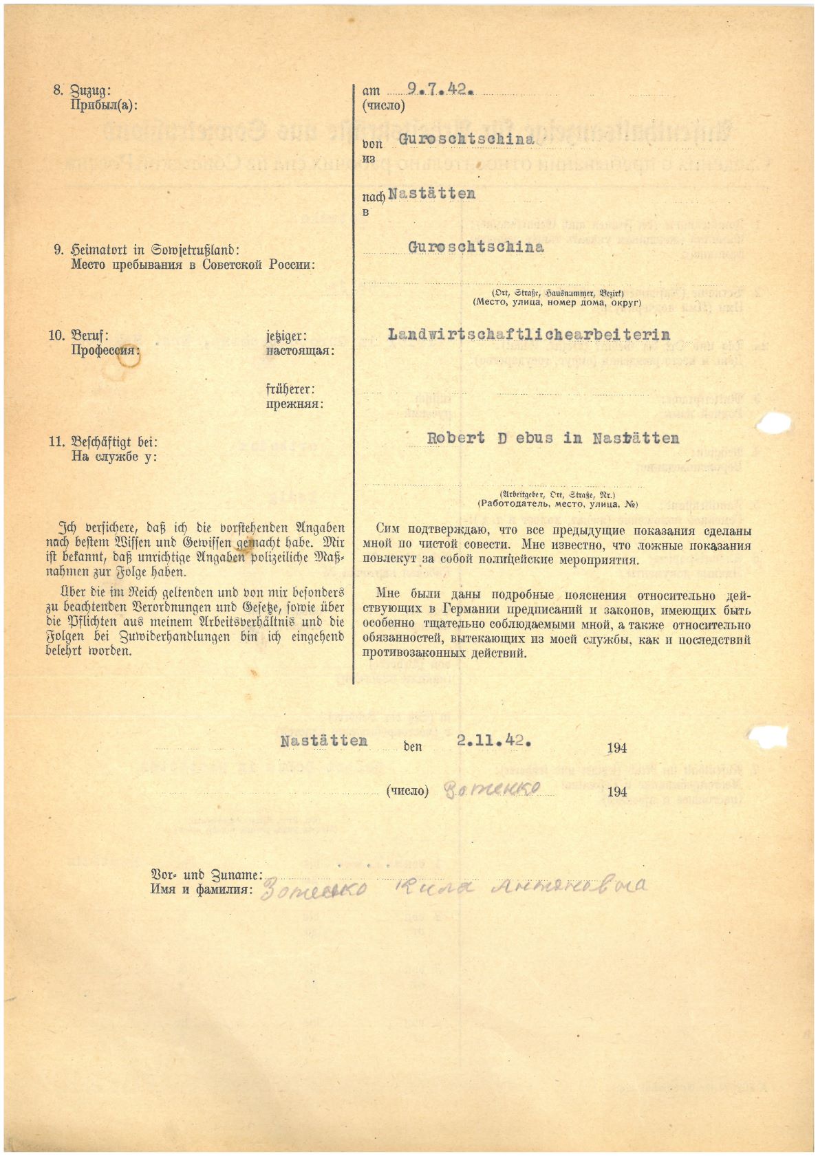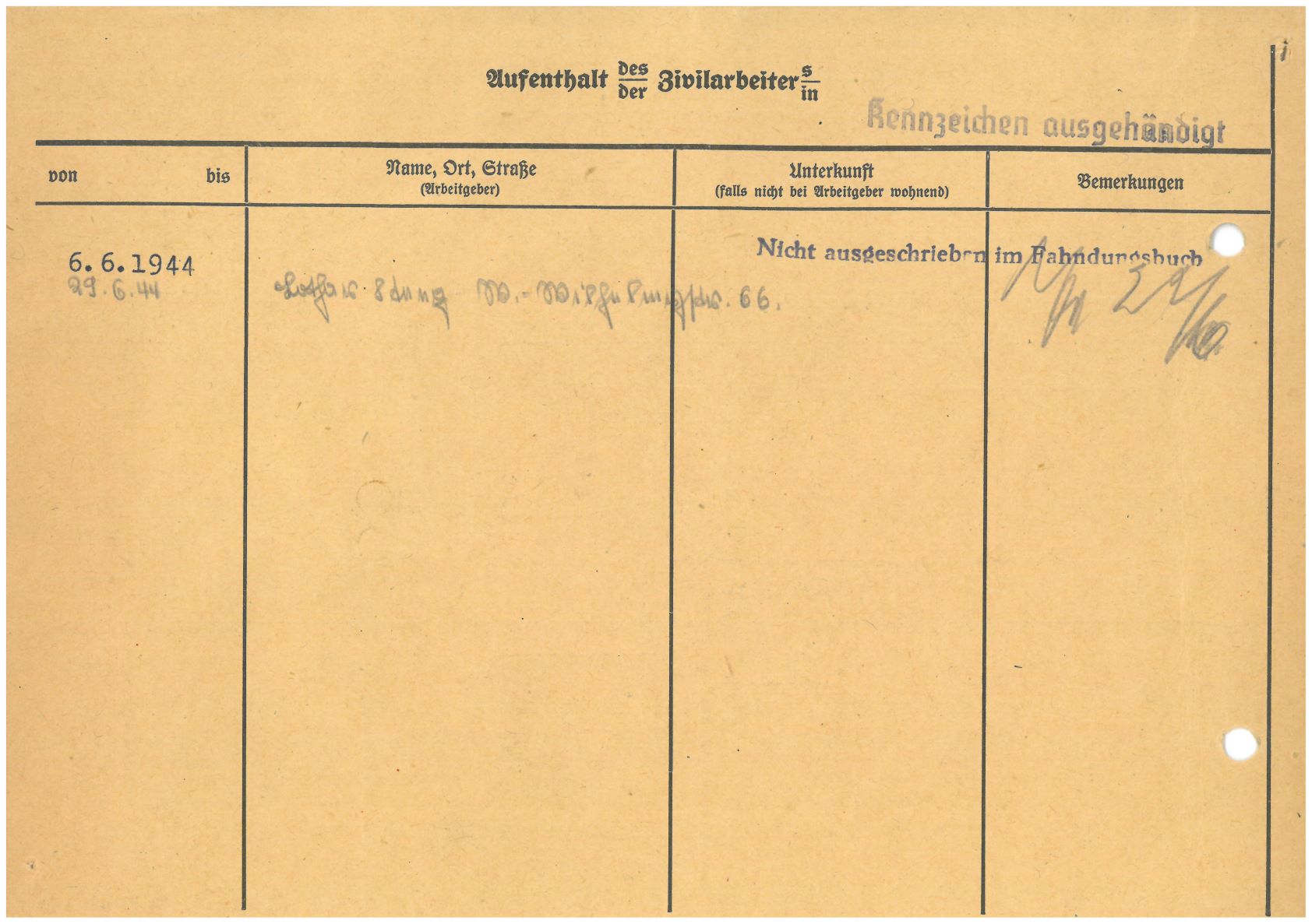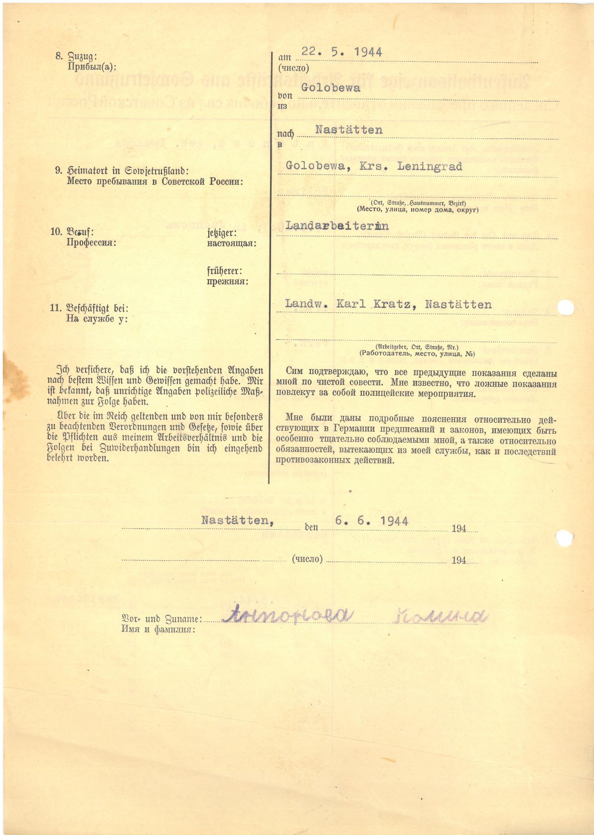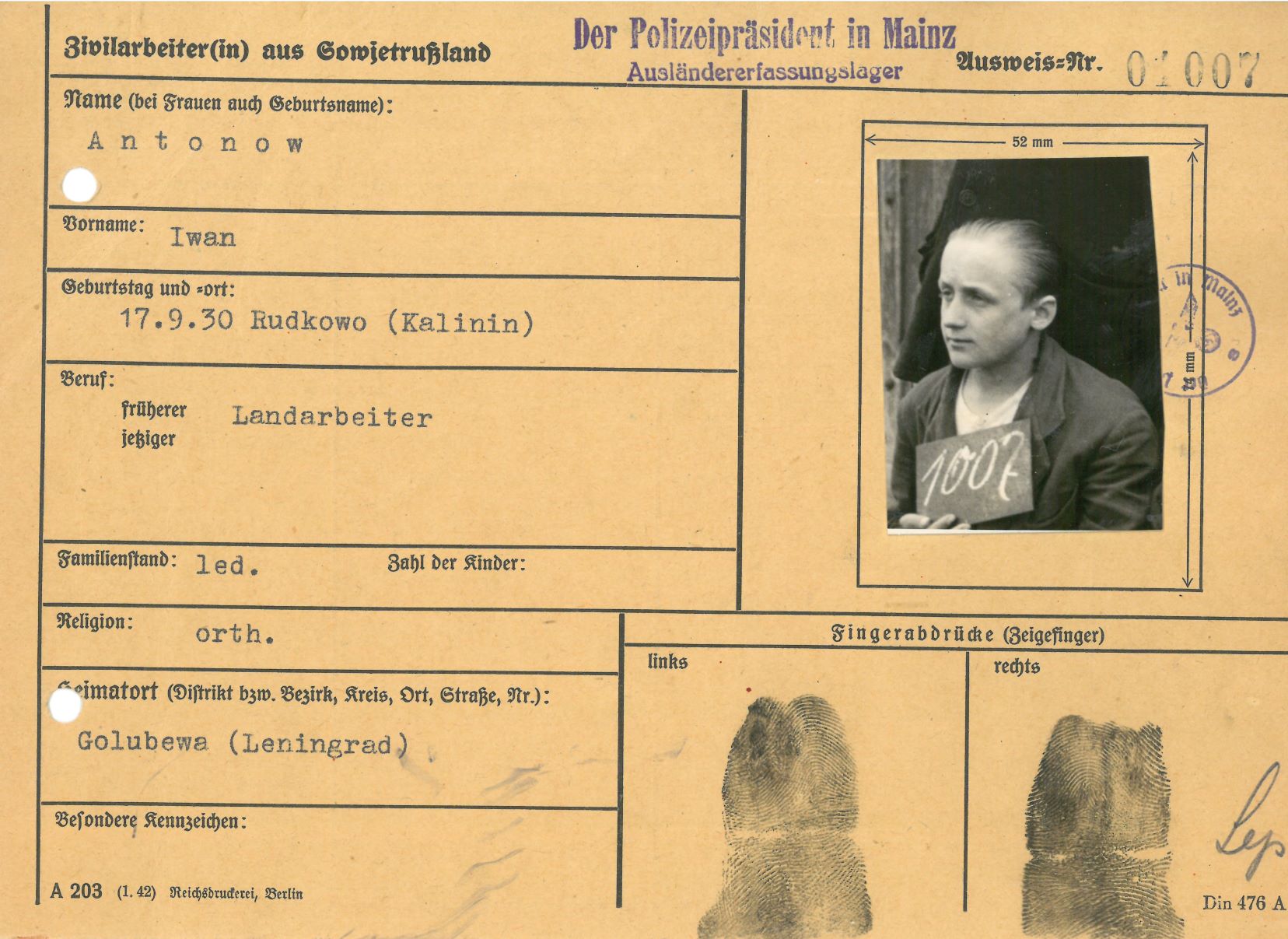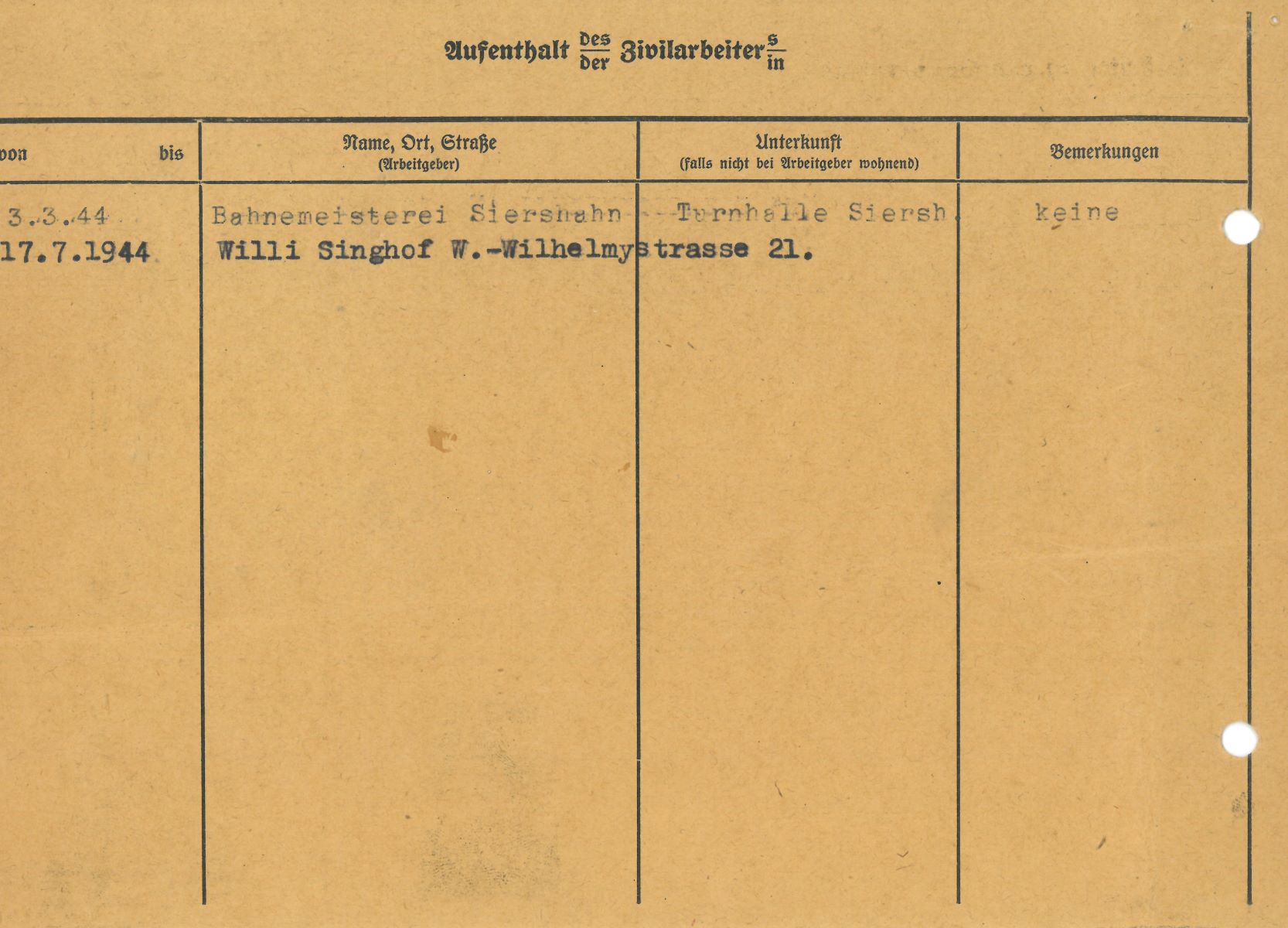 Im Oktober 1939 wurde die Einführung der Arbeitspflicht für Polen zwischen dem 18. und 60. Lebensjahr verordnet. Ab Sommer 1941 wurden die Zwangsarbeitsmaßnahmen auch auf den sowjetisch besetzen Teil Polens übertragen. Mehr und mehr wurden auch Jugendliche und selbst Kinder zur Zwangsarbeit herangezogen. Im Oktober 1940 arbeiteten in der deutschen Landwirtschaft etwa 400.000, in der Industrie rund 140.000 sogenannte Zivilarbeiter aus Polen und Sowjetrussland. Auch in Nastätten wurden Zivilarbeiter überwiegend in der Landwirtschaft eingesetzt. Finden sie Aufenthaltsbescheinigungen und Ausweise der in Nastätten eingesetzten Zivilarbeiter.