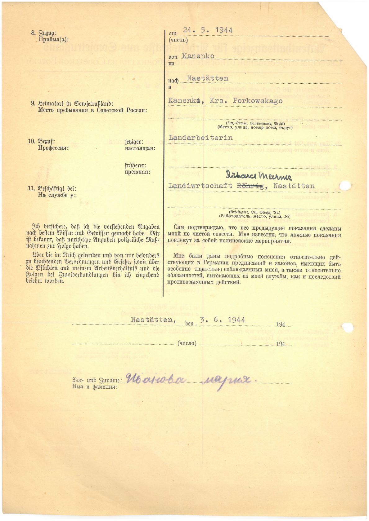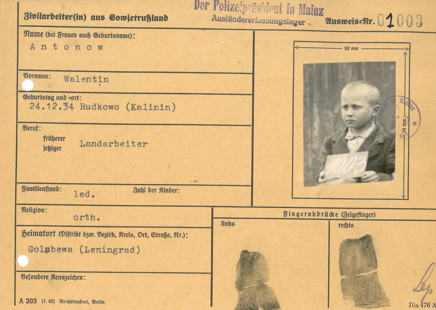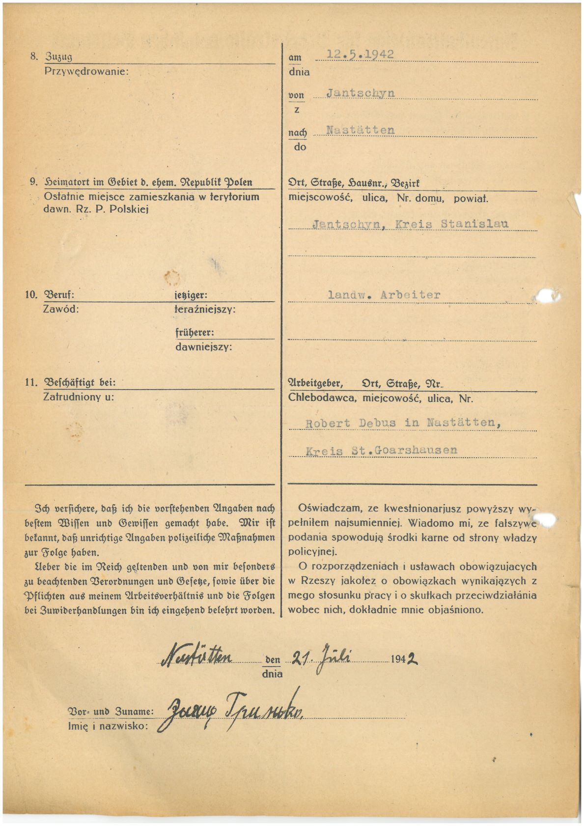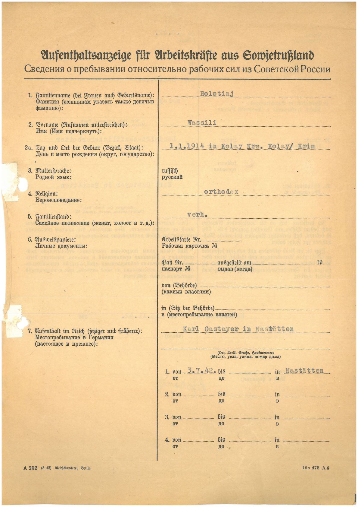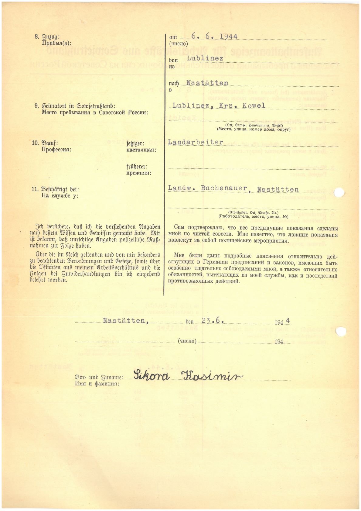 Im Oktober 1939 wurde die Einführung der Arbeitspflicht für Polen zwischen dem 18. und 60. Lebensjahr verordnet. Ab Sommer 1941 wurden die Zwangsarbeitsmaßnahmen auch auf den sowjetisch besetzen Teil Polens übertragen. Mehr und mehr wurden auch Jugendliche und selbst Kinder zur Zwangsarbeit herangezogen. Im Oktober 1940 arbeiteten in der deutschen Landwirtschaft etwa 400.000, in der Industrie rund 140.000 sogenannte Zivilarbeiter aus Polen und Sowjetrussland. Auch in Nastätten wurden Zivilarbeiter überwiegend in der Landwirtschaft eingesetzt. Finden sie Aufenthaltsbescheinigungen und Ausweise der in Nastätten eingesetzten Zivilarbeiter.