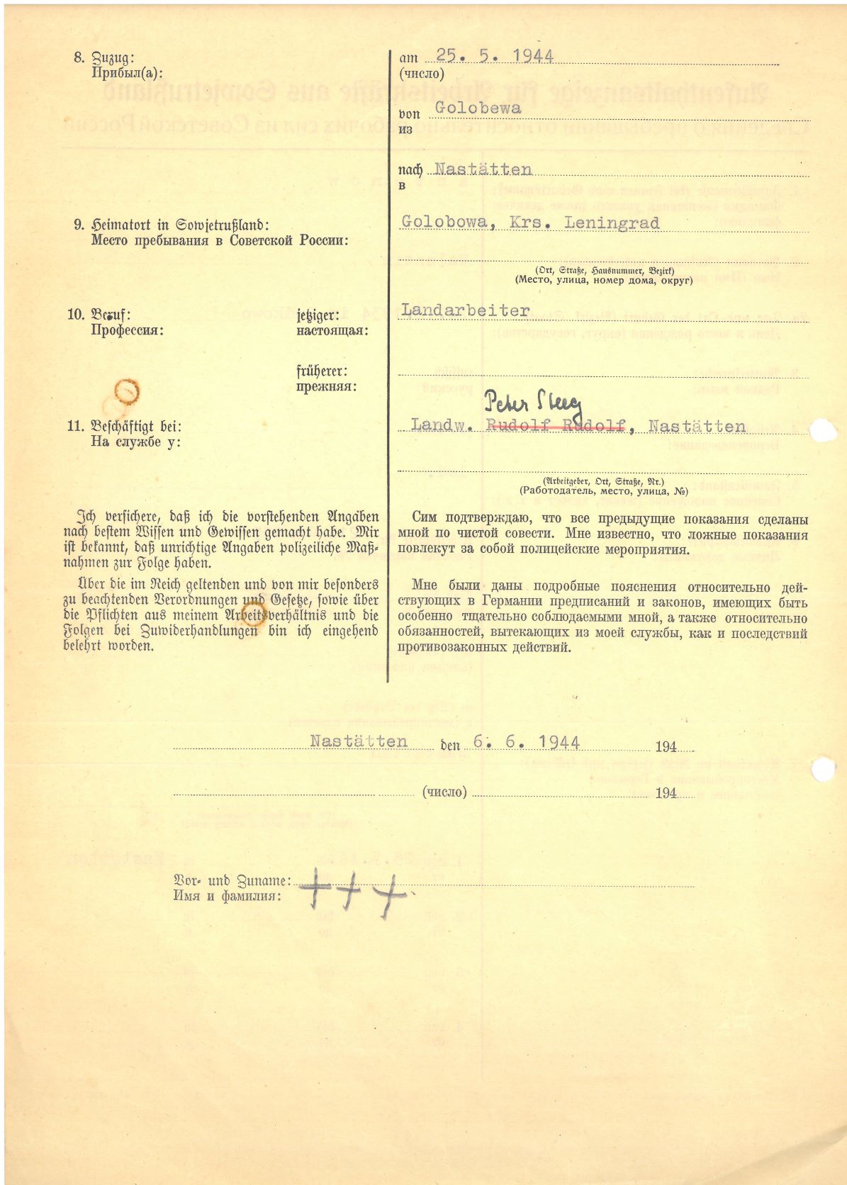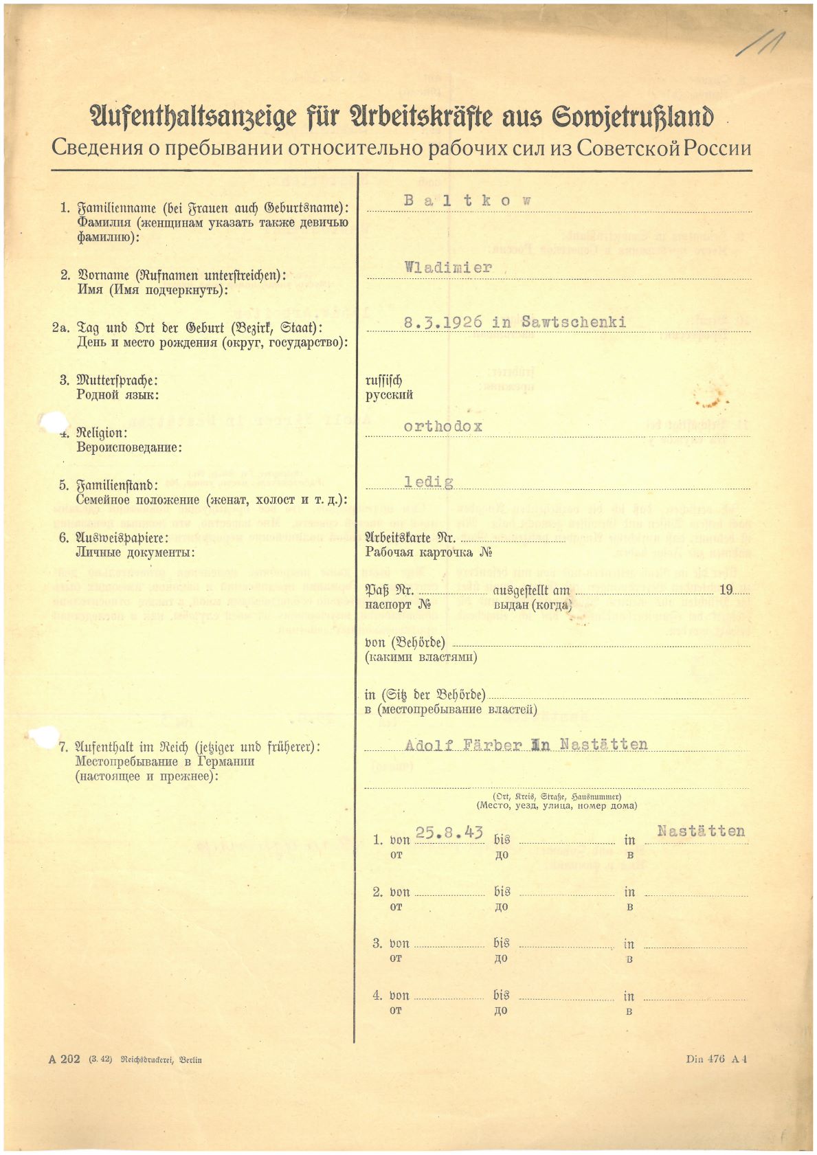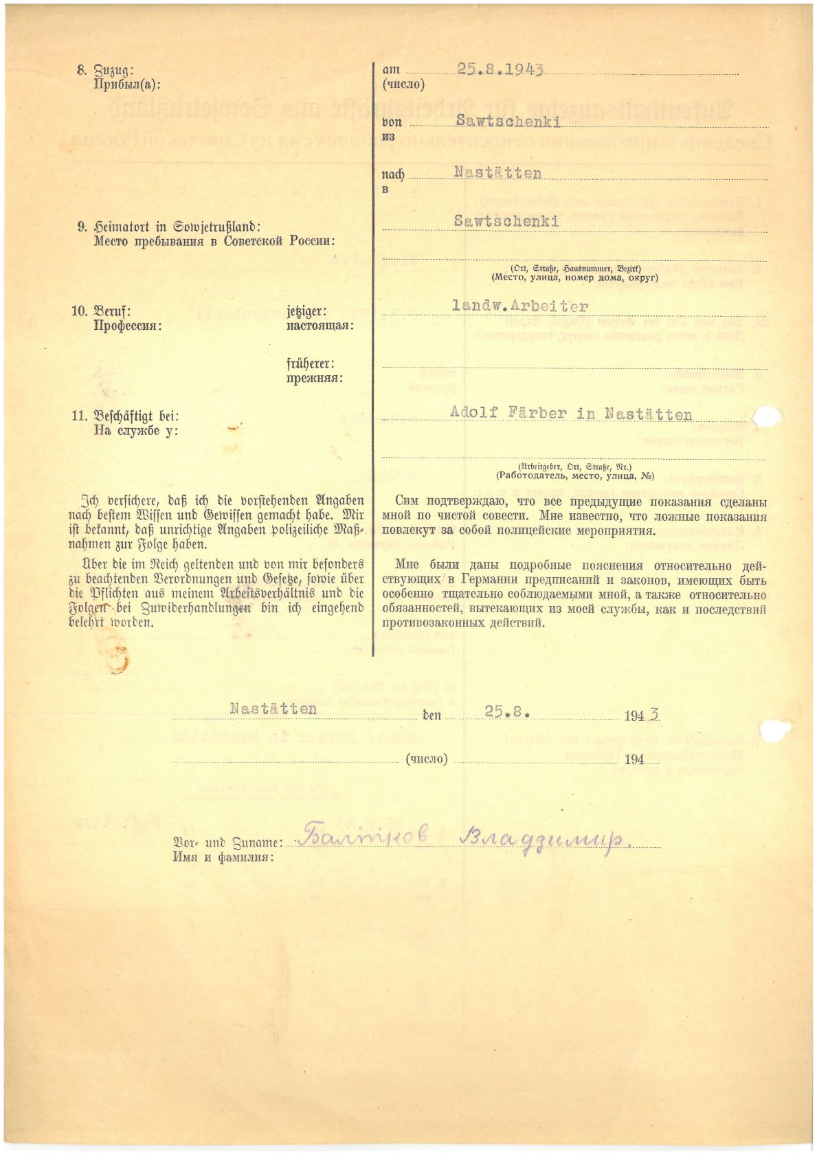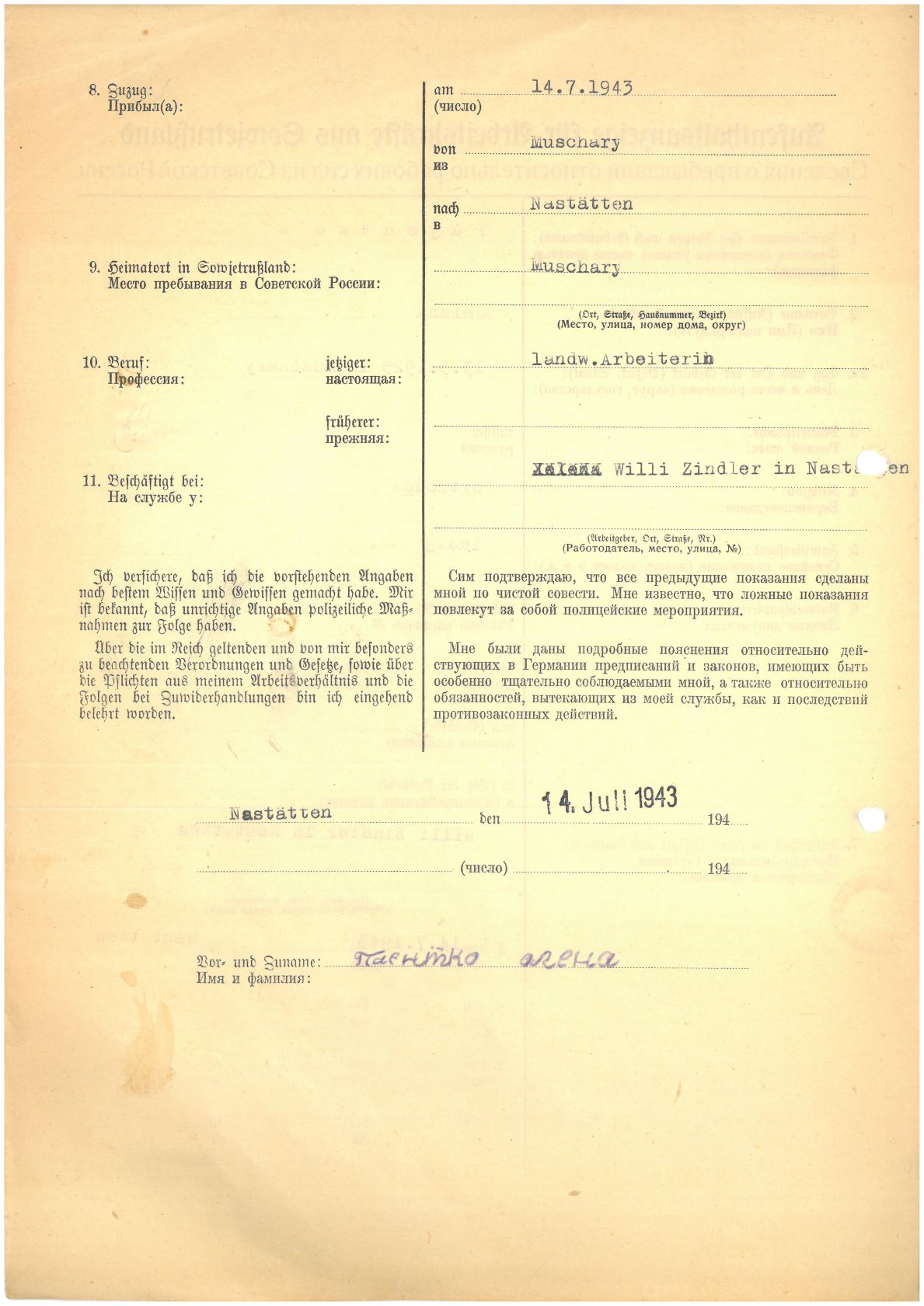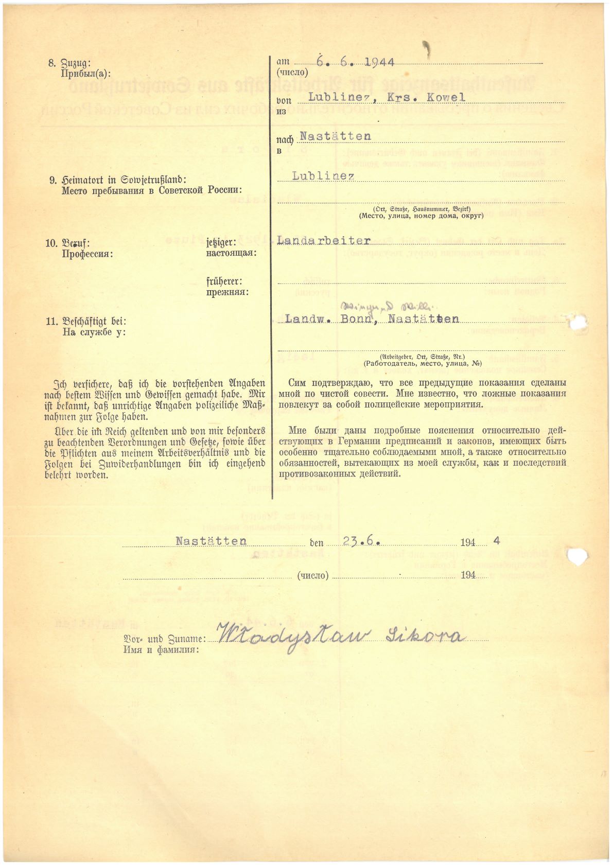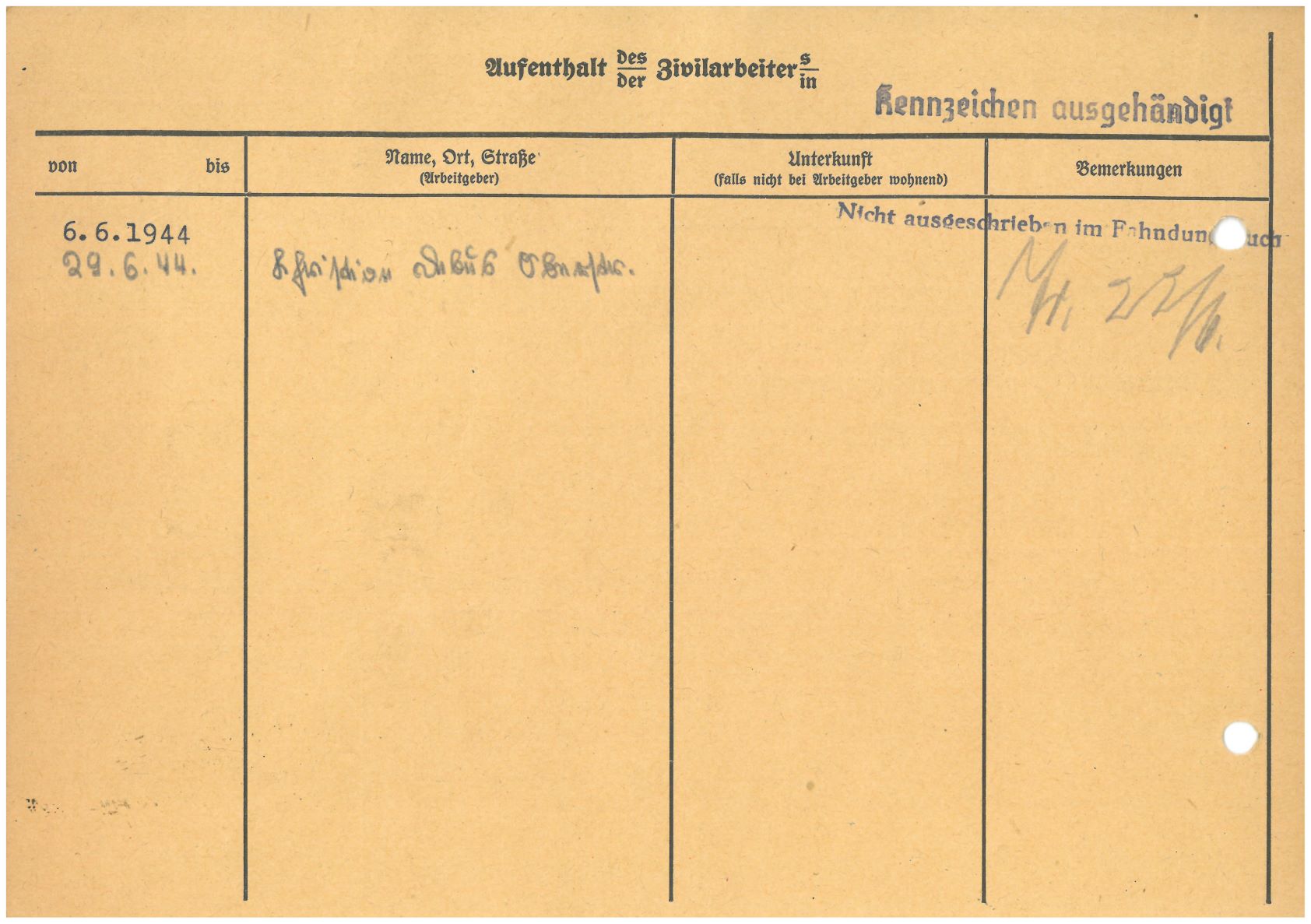 Im Oktober 1939 wurde die Einführung der Arbeitspflicht für Polen zwischen dem 18. und 60. Lebensjahr verordnet. Ab Sommer 1941 wurden die Zwangsarbeitsmaßnahmen auch auf den sowjetisch besetzen Teil Polens übertragen. Mehr und mehr wurden auch Jugendliche und selbst Kinder zur Zwangsarbeit herangezogen. Im Oktober 1940 arbeiteten in der deutschen Landwirtschaft etwa 400.000, in der Industrie rund 140.000 sogenannte Zivilarbeiter aus Polen und Sowjetrussland. Auch in Nastätten wurden Zivilarbeiter überwiegend in der Landwirtschaft eingesetzt. Finden sie Aufenthaltsbescheinigungen und Ausweise der in Nastätten eingesetzten Zivilarbeiter.