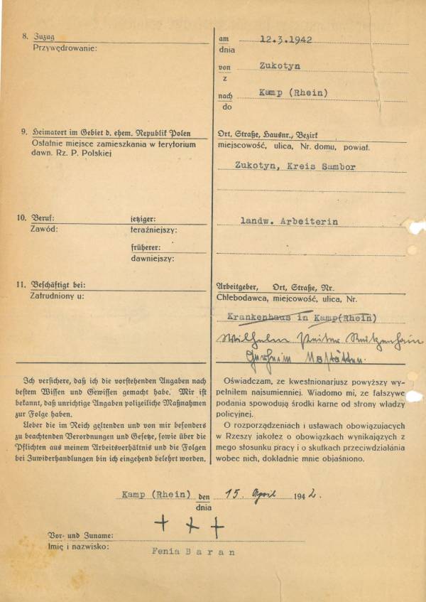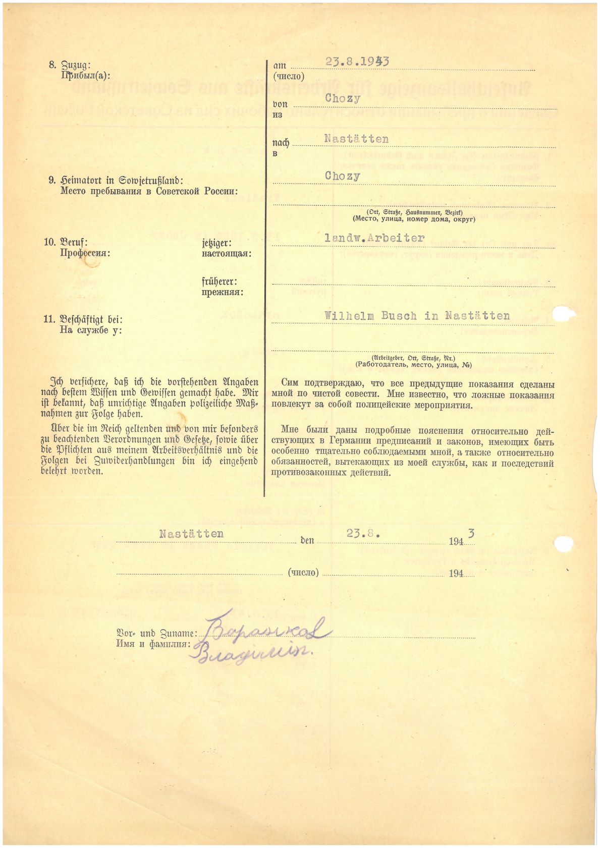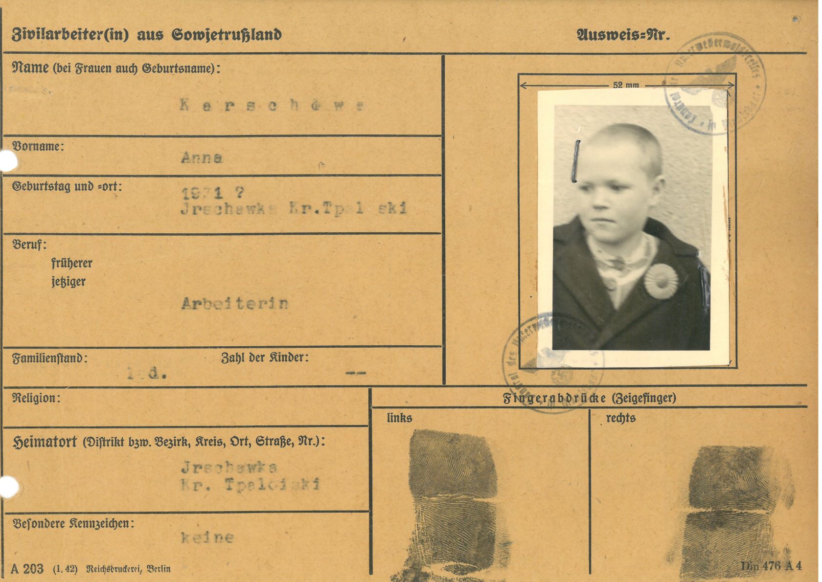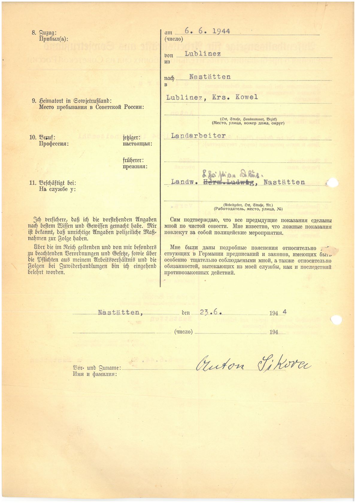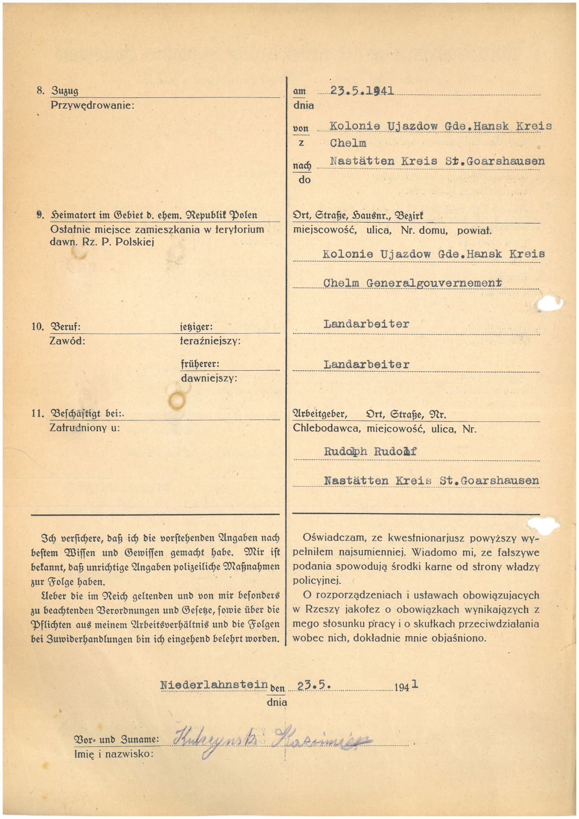 Im Oktober 1939 wurde die Einführung der Arbeitspflicht für Polen zwischen dem 18. und 60. Lebensjahr verordnet. Ab Sommer 1941 wurden die Zwangsarbeitsmaßnahmen auch auf den sowjetisch besetzen Teil Polens übertragen. Mehr und mehr wurden auch Jugendliche und selbst Kinder zur Zwangsarbeit herangezogen. Im Oktober 1940 arbeiteten in der deutschen Landwirtschaft etwa 400.000, in der Industrie rund 140.000 sogenannte Zivilarbeiter aus Polen und Sowjetrussland. Auch in Nastätten wurden Zivilarbeiter überwiegend in der Landwirtschaft eingesetzt. Finden sie Aufenthaltsbescheinigungen und Ausweise der in Nastätten eingesetzten Zivilarbeiter.