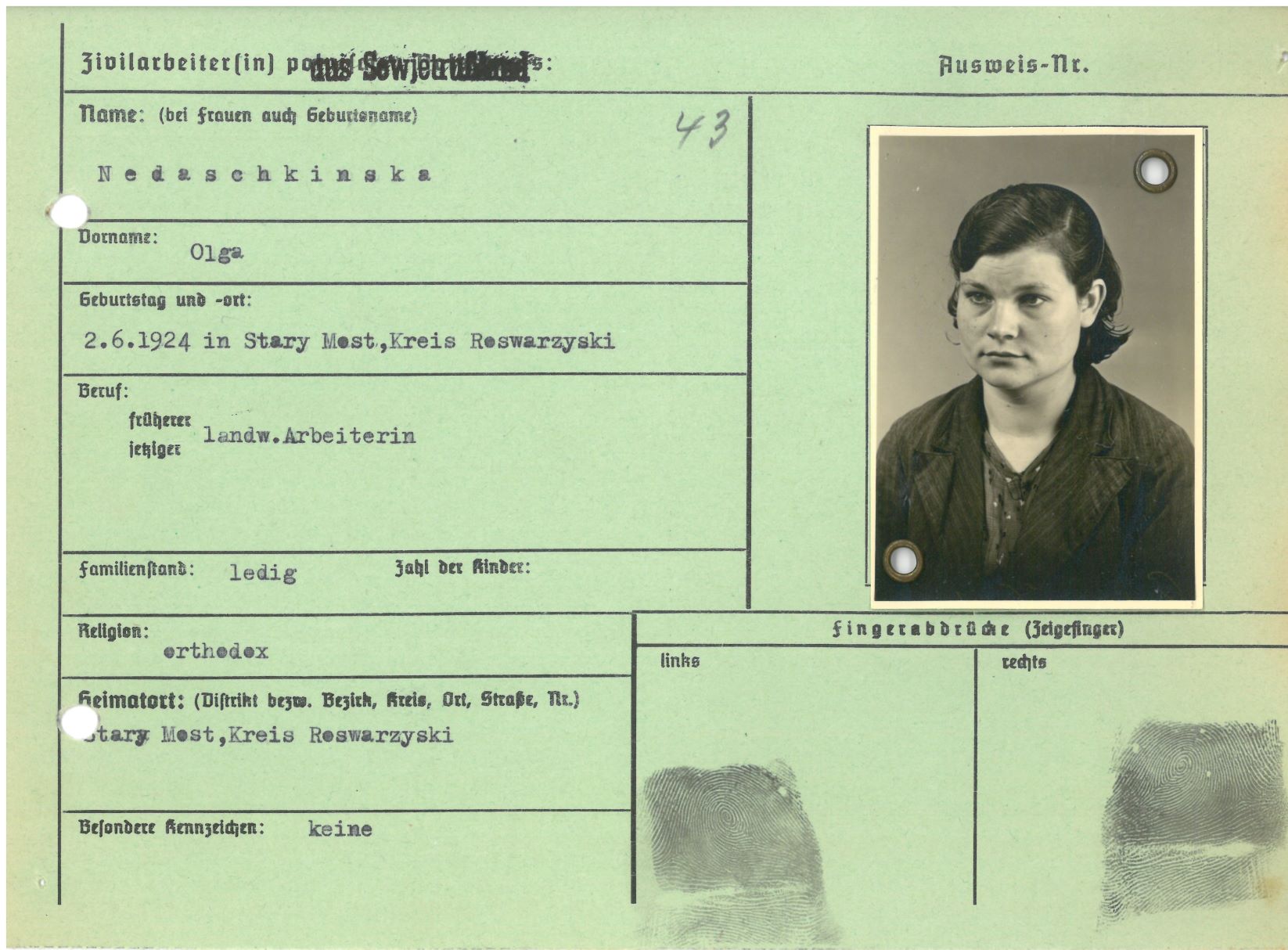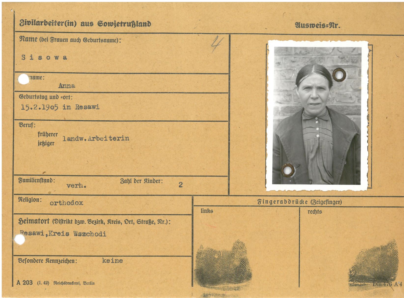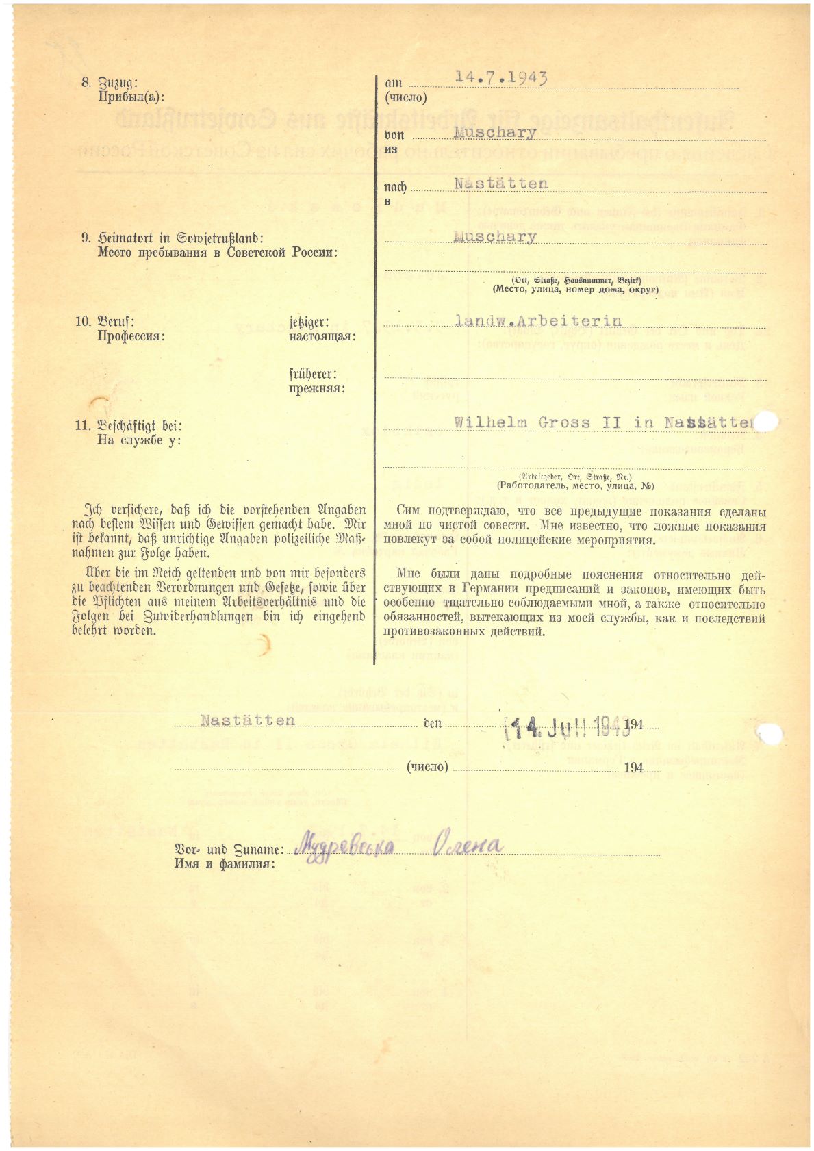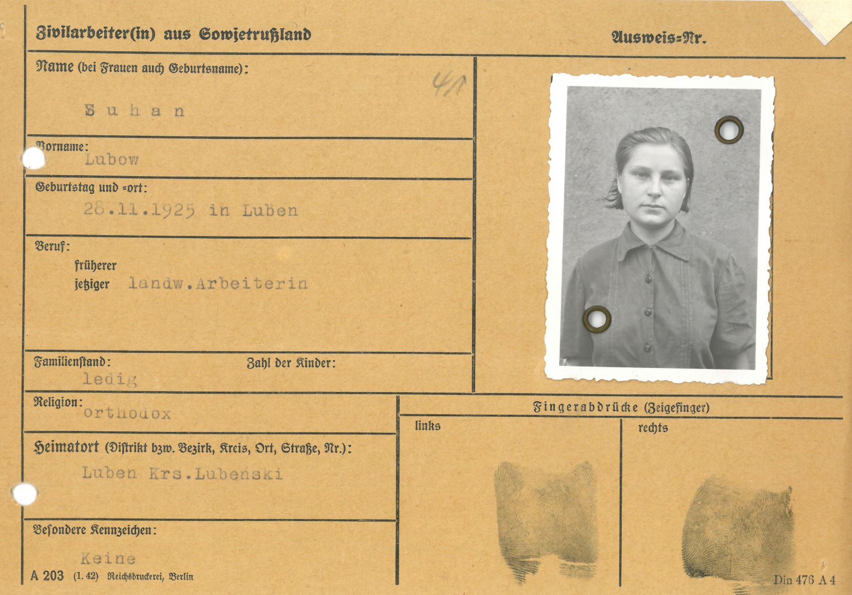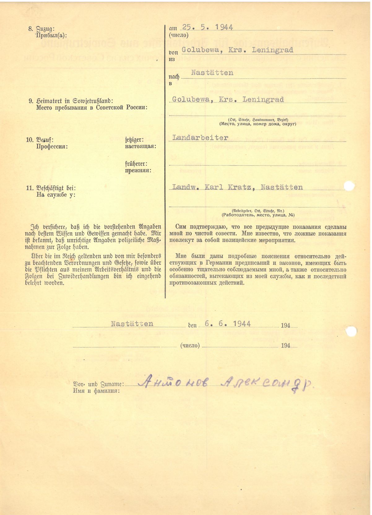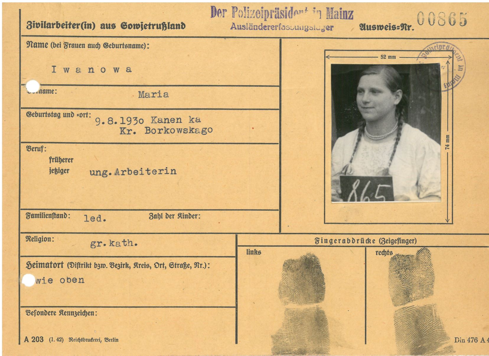 Im Oktober 1939 wurde die Einführung der Arbeitspflicht für Polen zwischen dem 18. und 60. Lebensjahr verordnet. Ab Sommer 1941 wurden die Zwangsarbeitsmaßnahmen auch auf den sowjetisch besetzen Teil Polens übertragen. Mehr und mehr wurden auch Jugendliche und selbst Kinder zur Zwangsarbeit herangezogen. Im Oktober 1940 arbeiteten in der deutschen Landwirtschaft etwa 400.000, in der Industrie rund 140.000 sogenannte Zivilarbeiter aus Polen und Sowjetrussland. Auch in Nastätten wurden Zivilarbeiter überwiegend in der Landwirtschaft eingesetzt. Finden sie Aufenthaltsbescheinigungen und Ausweise der in Nastätten eingesetzten Zivilarbeiter.
