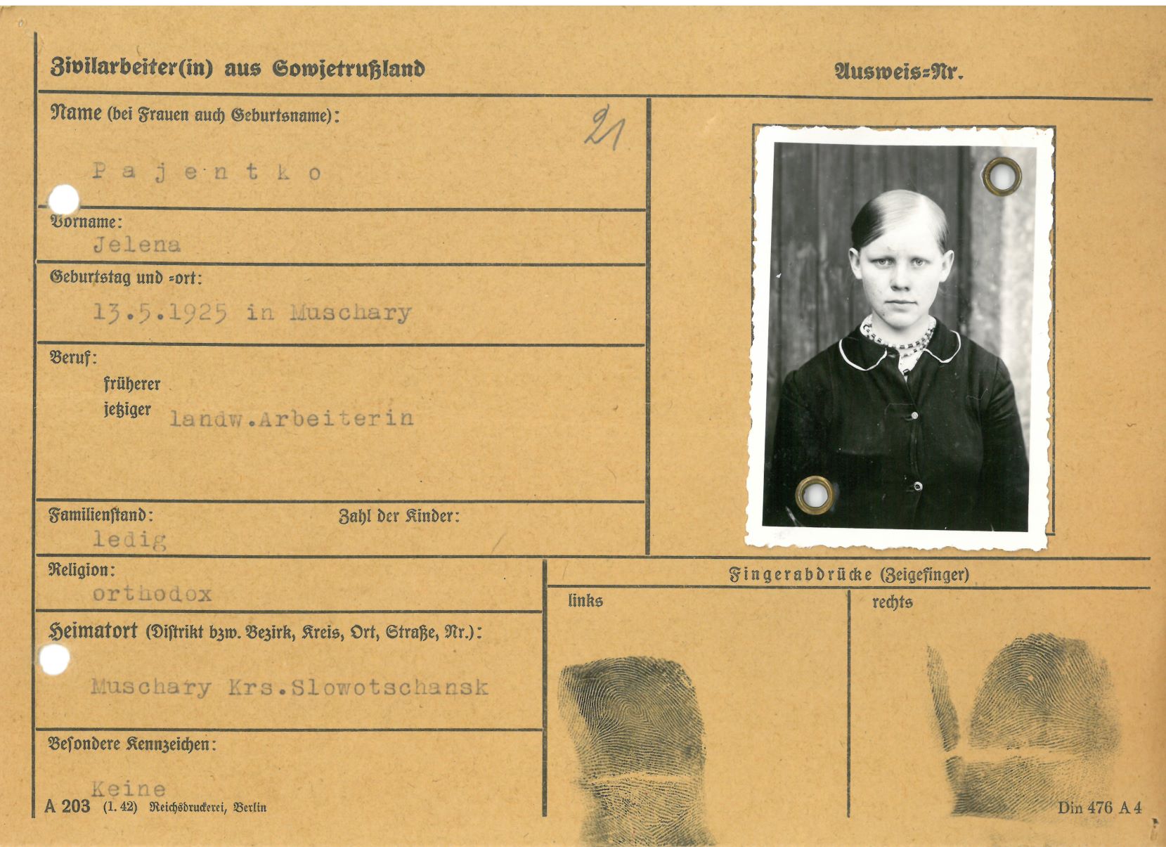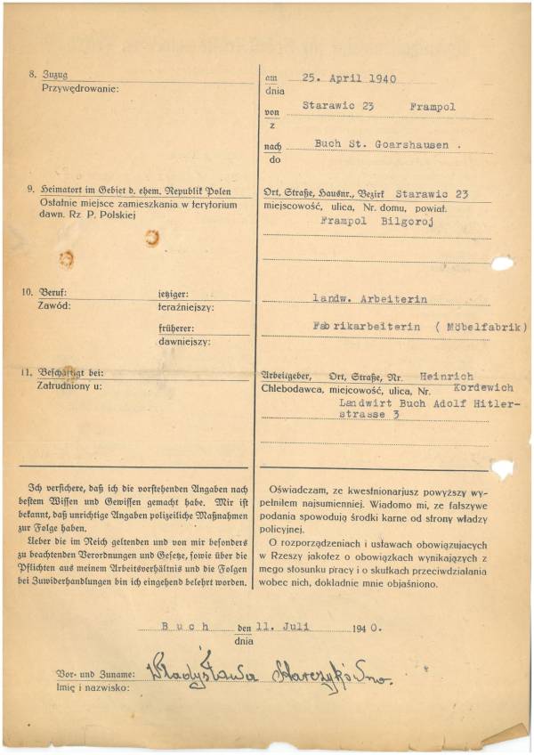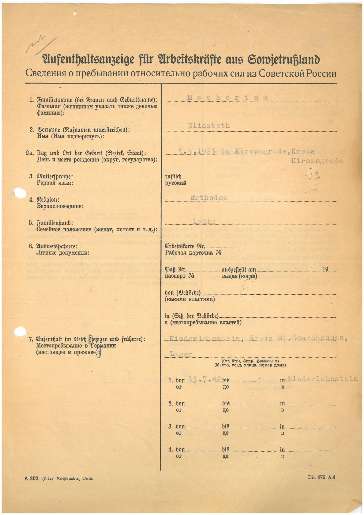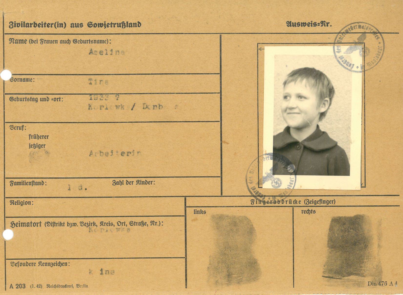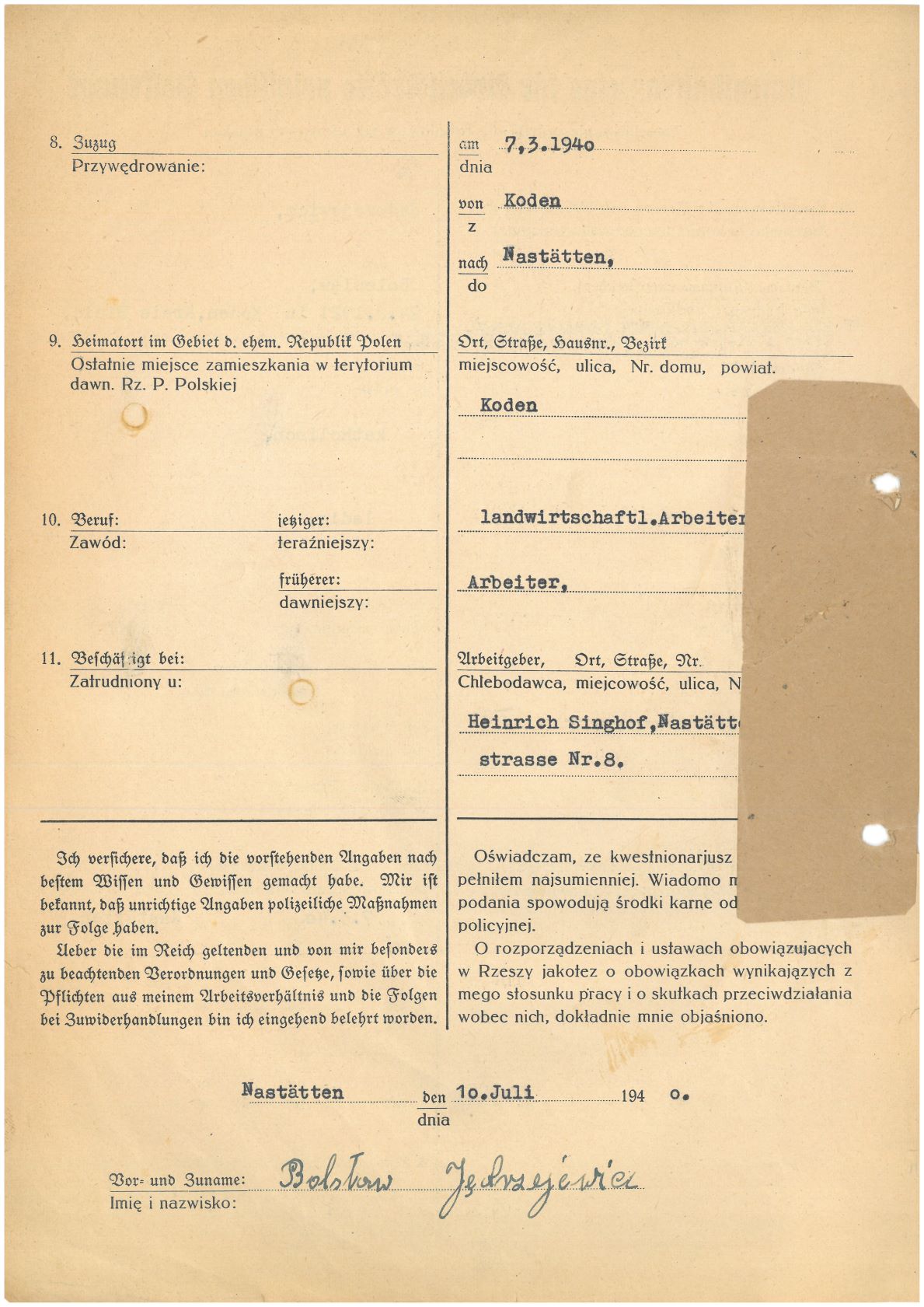 Im Oktober 1939 wurde die Einführung der Arbeitspflicht für Polen zwischen dem 18. und 60. Lebensjahr verordnet. Ab Sommer 1941 wurden die Zwangsarbeitsmaßnahmen auch auf den sowjetisch besetzen Teil Polens übertragen. Mehr und mehr wurden auch Jugendliche und selbst Kinder zur Zwangsarbeit herangezogen. Im Oktober 1940 arbeiteten in der deutschen Landwirtschaft etwa 400.000, in der Industrie rund 140.000 sogenannte Zivilarbeiter aus Polen und Sowjetrussland. Auch in Nastätten wurden Zivilarbeiter überwiegend in der Landwirtschaft eingesetzt. Finden sie Aufenthaltsbescheinigungen und Ausweise der in Nastätten eingesetzten Zivilarbeiter.