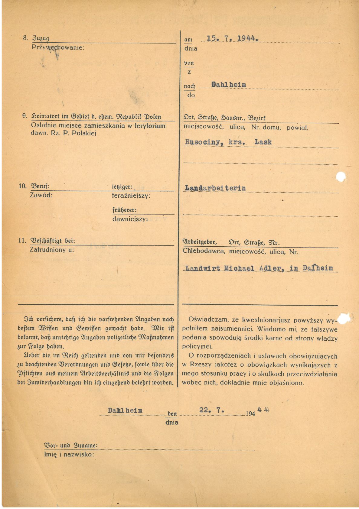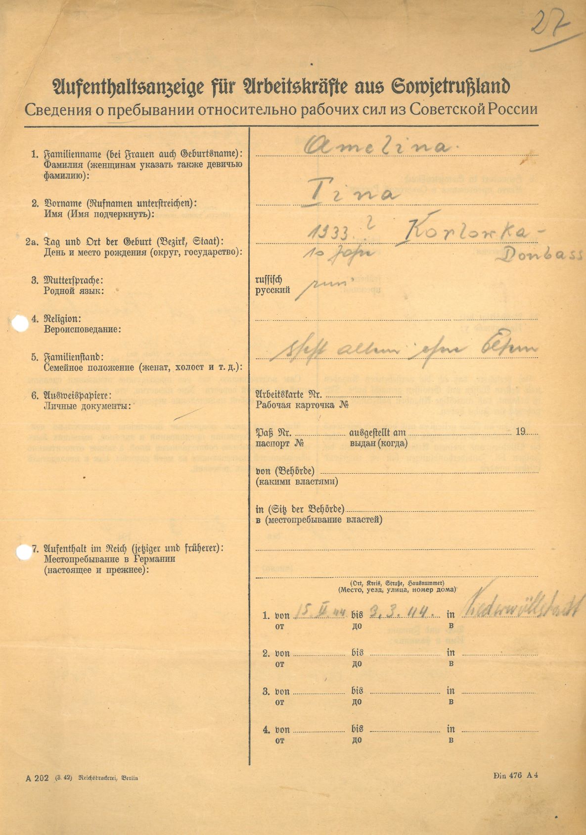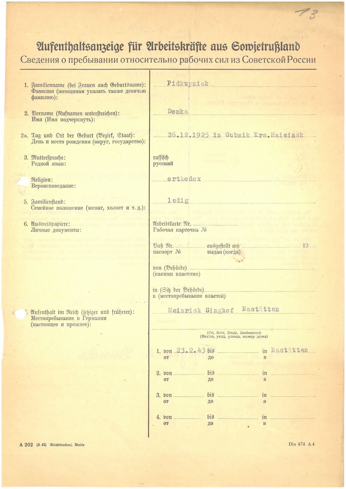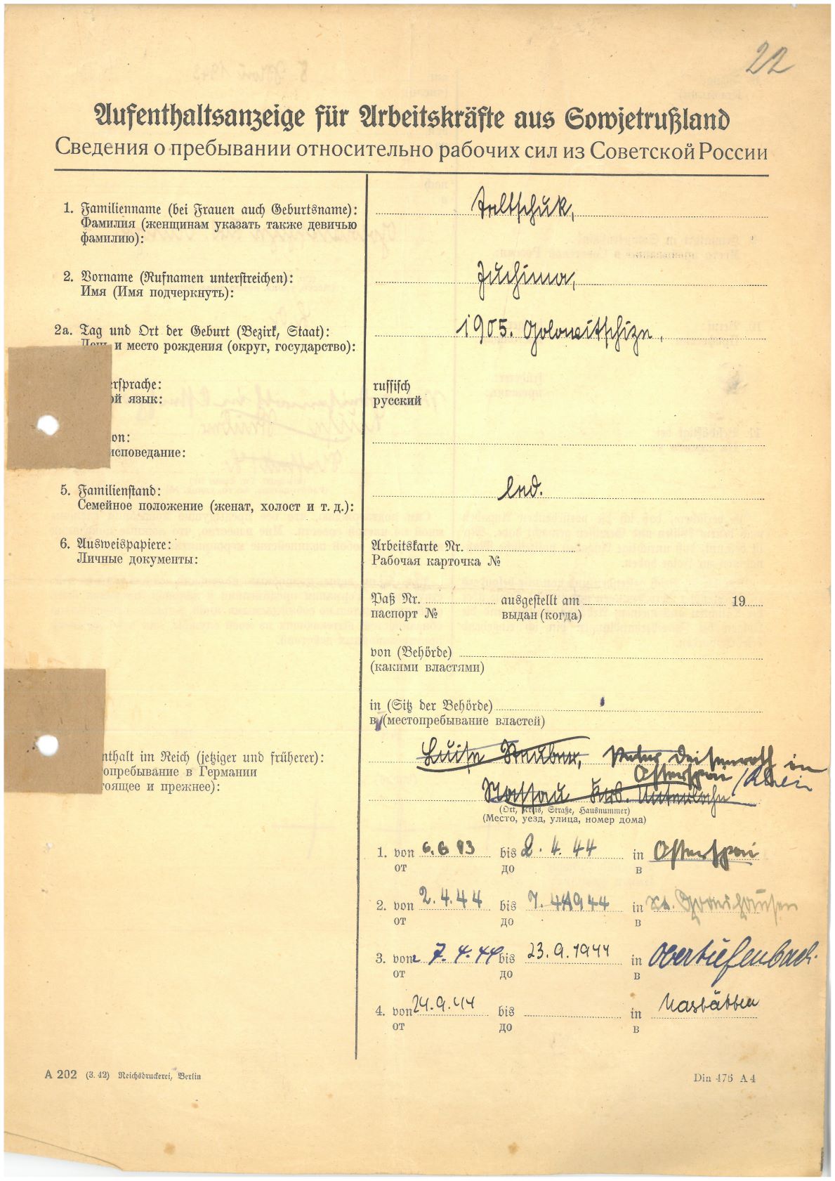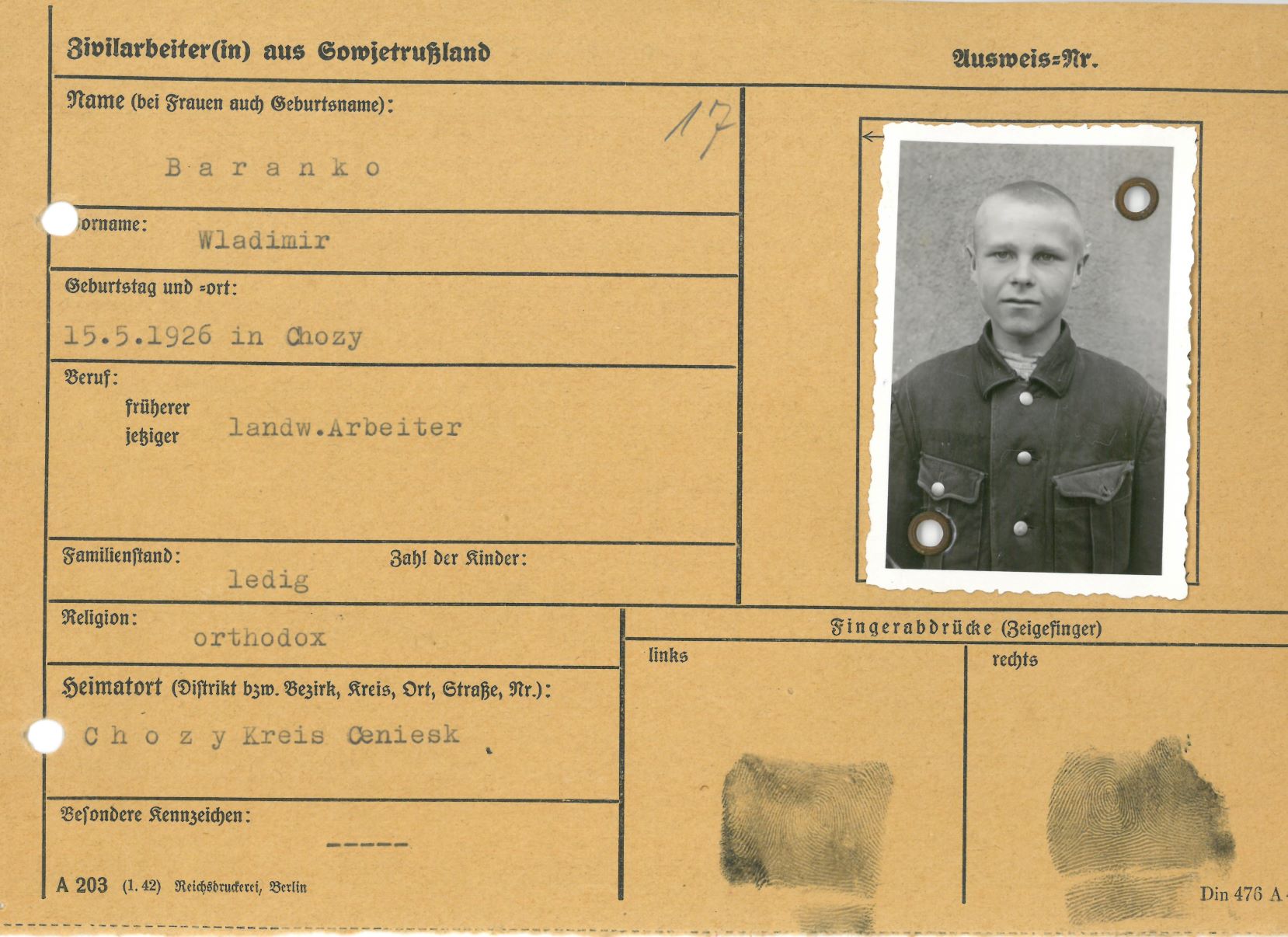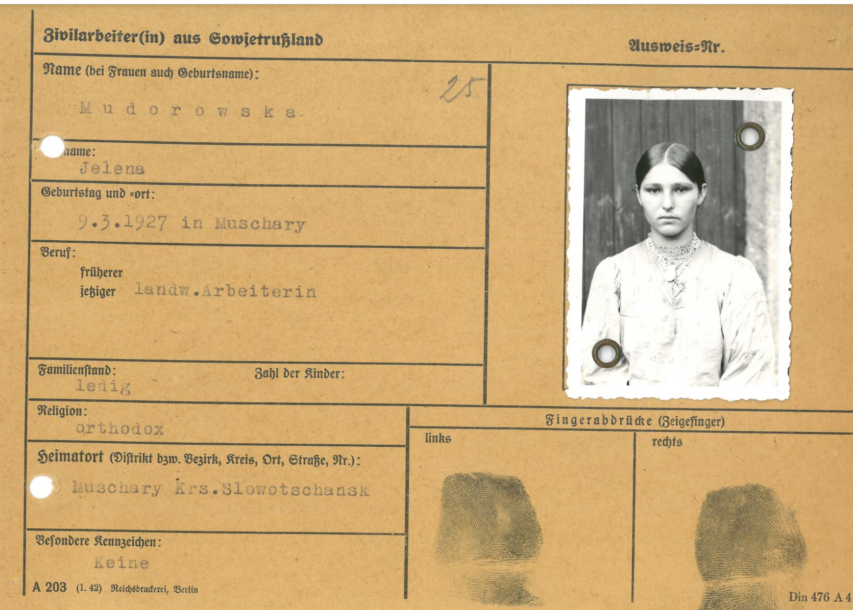 Im Oktober 1939 wurde die Einführung der Arbeitspflicht für Polen zwischen dem 18. und 60. Lebensjahr verordnet. Ab Sommer 1941 wurden die Zwangsarbeitsmaßnahmen auch auf den sowjetisch besetzen Teil Polens übertragen. Mehr und mehr wurden auch Jugendliche und selbst Kinder zur Zwangsarbeit herangezogen. Im Oktober 1940 arbeiteten in der deutschen Landwirtschaft etwa 400.000, in der Industrie rund 140.000 sogenannte Zivilarbeiter aus Polen und Sowjetrussland. Auch in Nastätten wurden Zivilarbeiter überwiegend in der Landwirtschaft eingesetzt. Finden sie Aufenthaltsbescheinigungen und Ausweise der in Nastätten eingesetzten Zivilarbeiter.