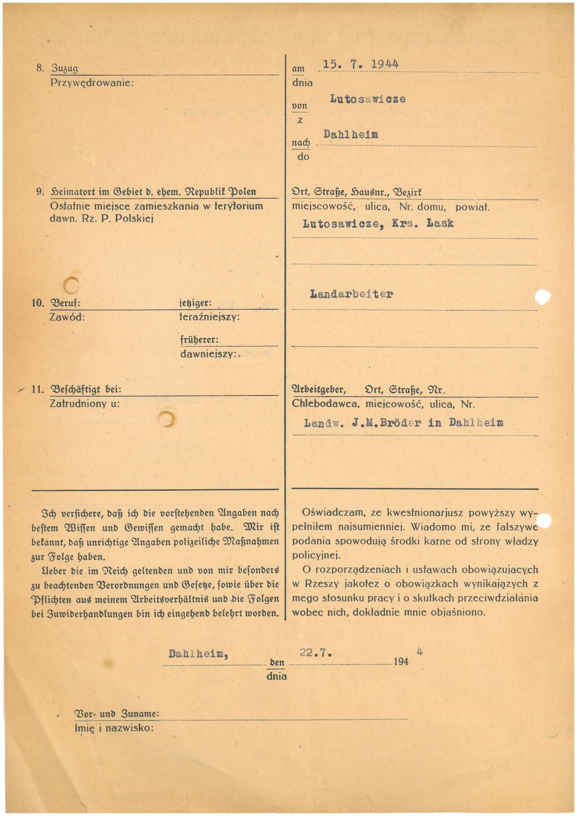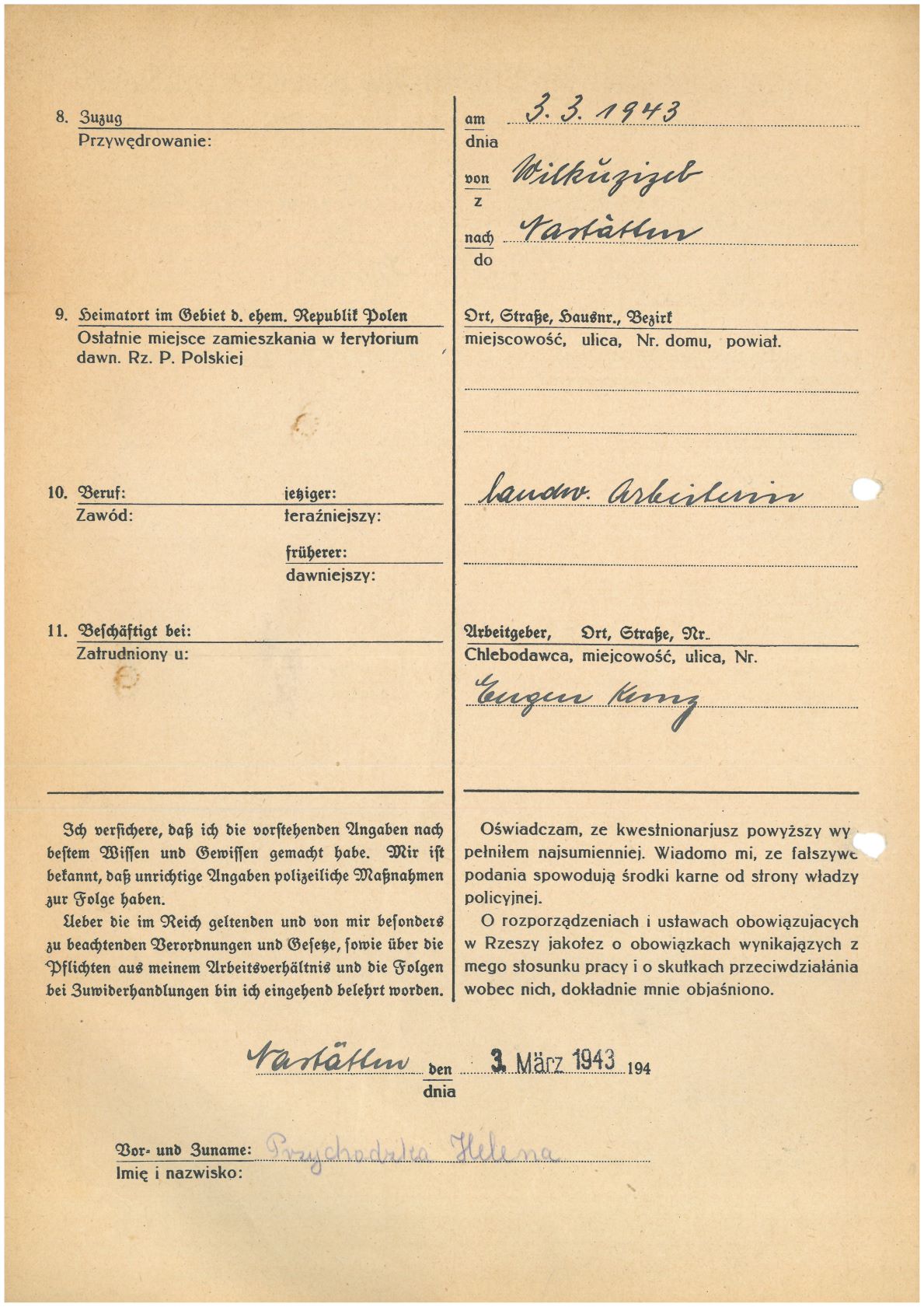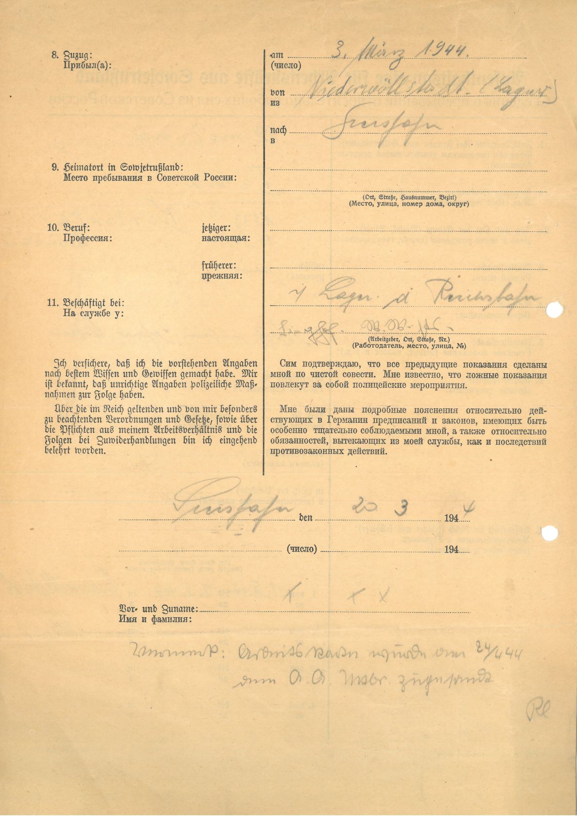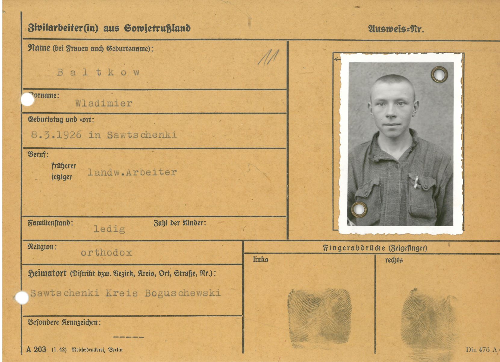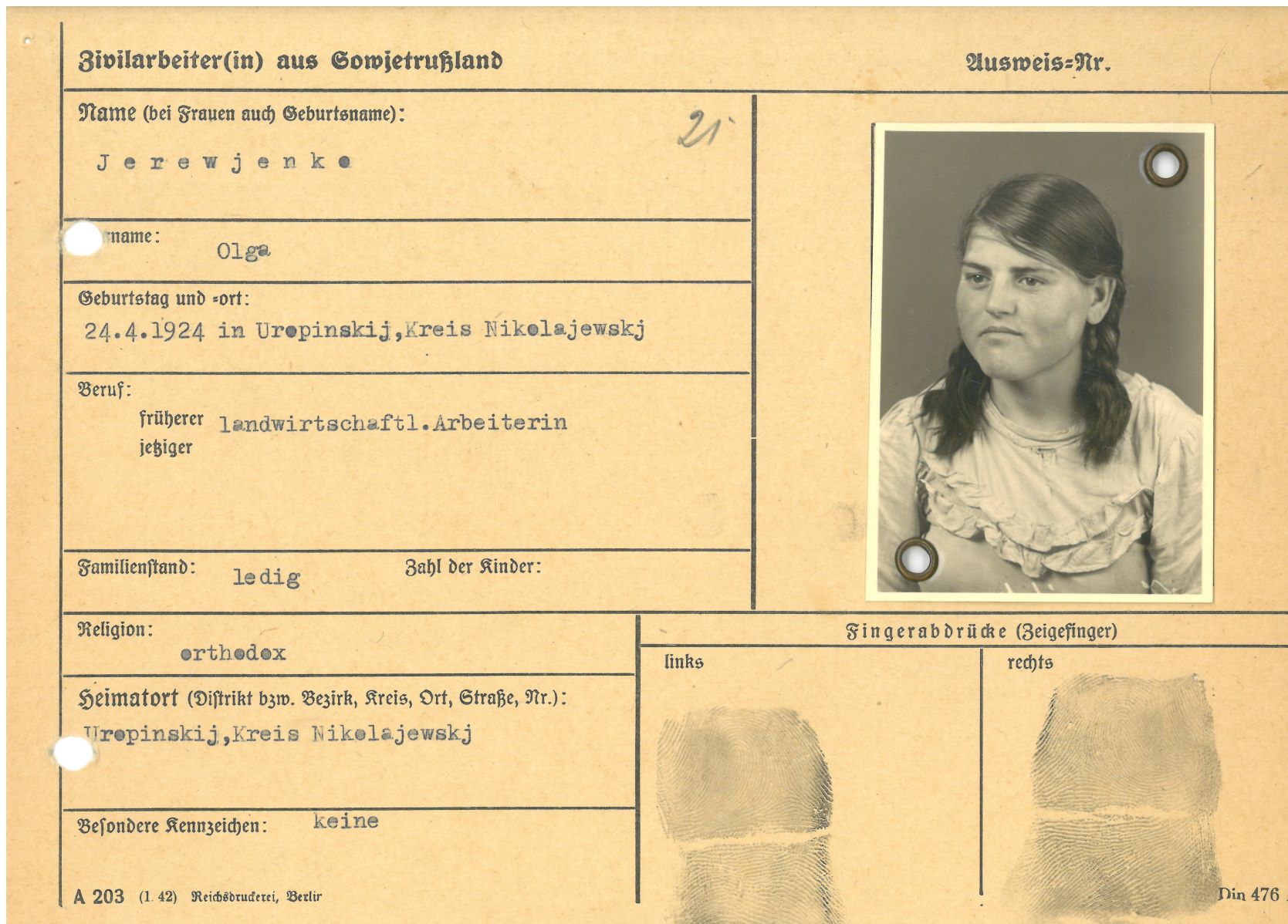 Im Oktober 1939 wurde die Einführung der Arbeitspflicht für Polen zwischen dem 18. und 60. Lebensjahr verordnet. Ab Sommer 1941 wurden die Zwangsarbeitsmaßnahmen auch auf den sowjetisch besetzen Teil Polens übertragen. Mehr und mehr wurden auch Jugendliche und selbst Kinder zur Zwangsarbeit herangezogen. Im Oktober 1940 arbeiteten in der deutschen Landwirtschaft etwa 400.000, in der Industrie rund 140.000 sogenannte Zivilarbeiter aus Polen und Sowjetrussland. Auch in Nastätten wurden Zivilarbeiter überwiegend in der Landwirtschaft eingesetzt. Finden sie Aufenthaltsbescheinigungen und Ausweise der in Nastätten eingesetzten Zivilarbeiter.
