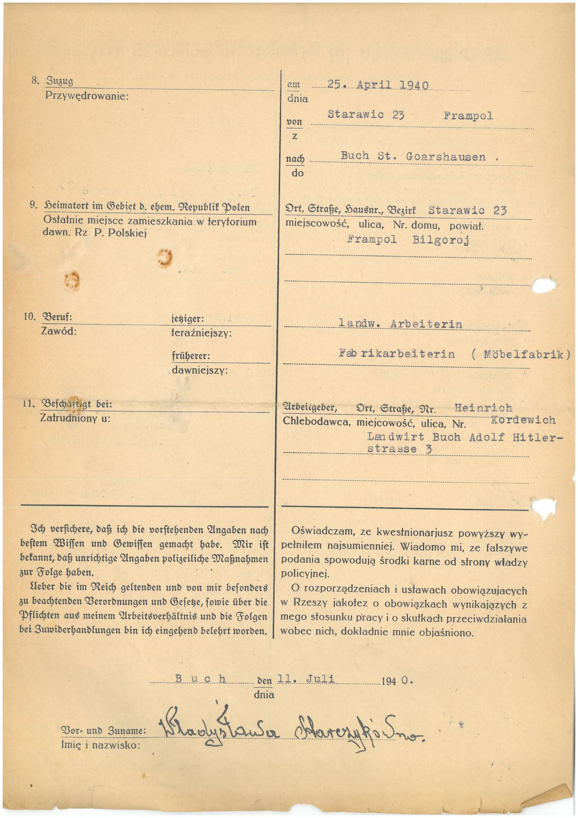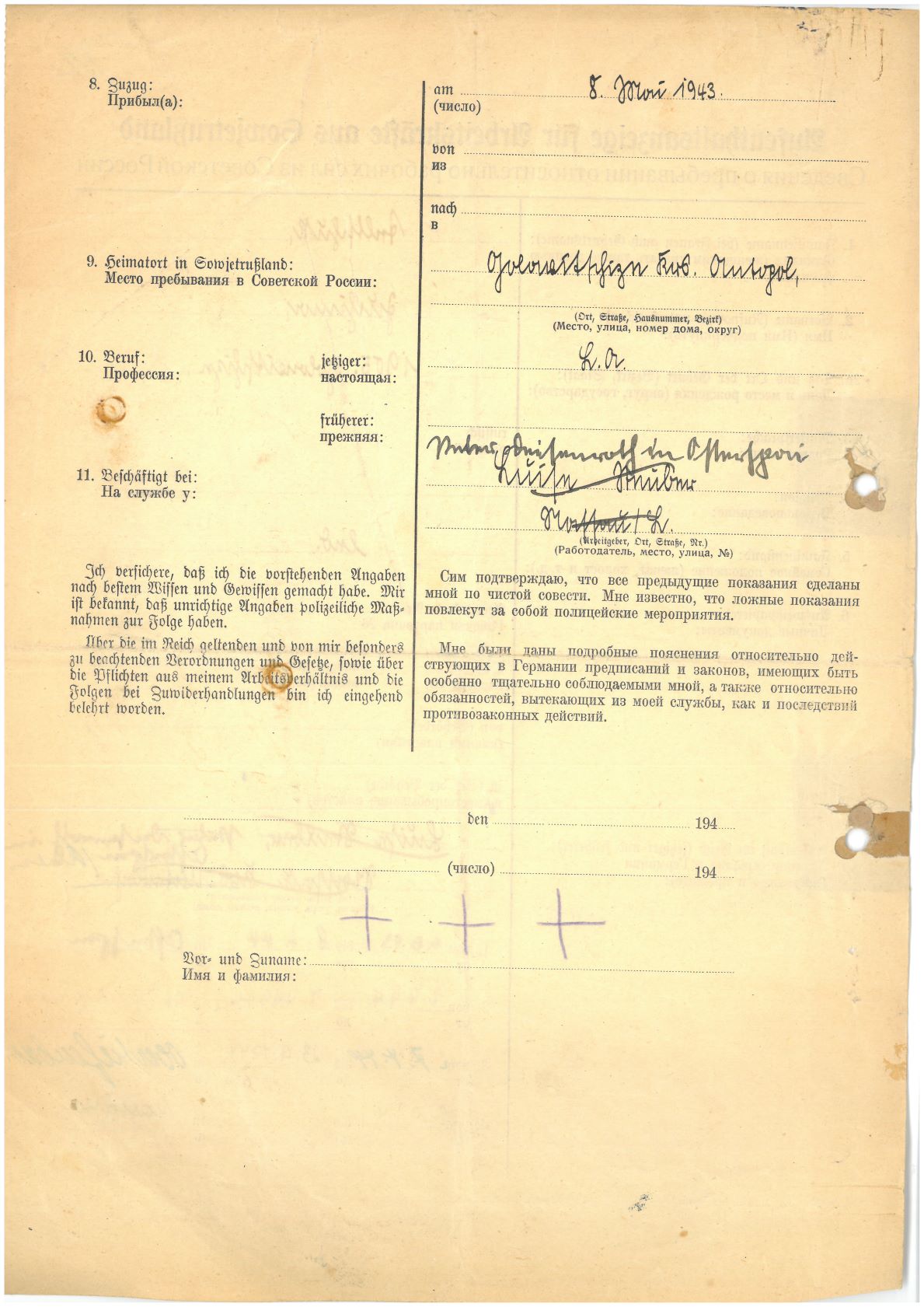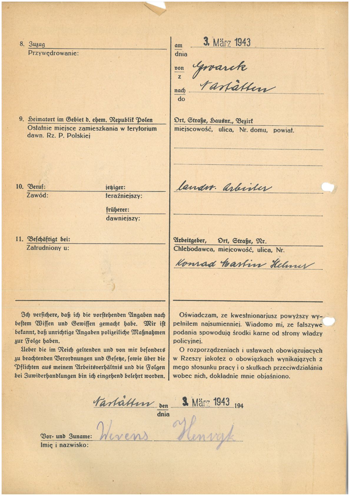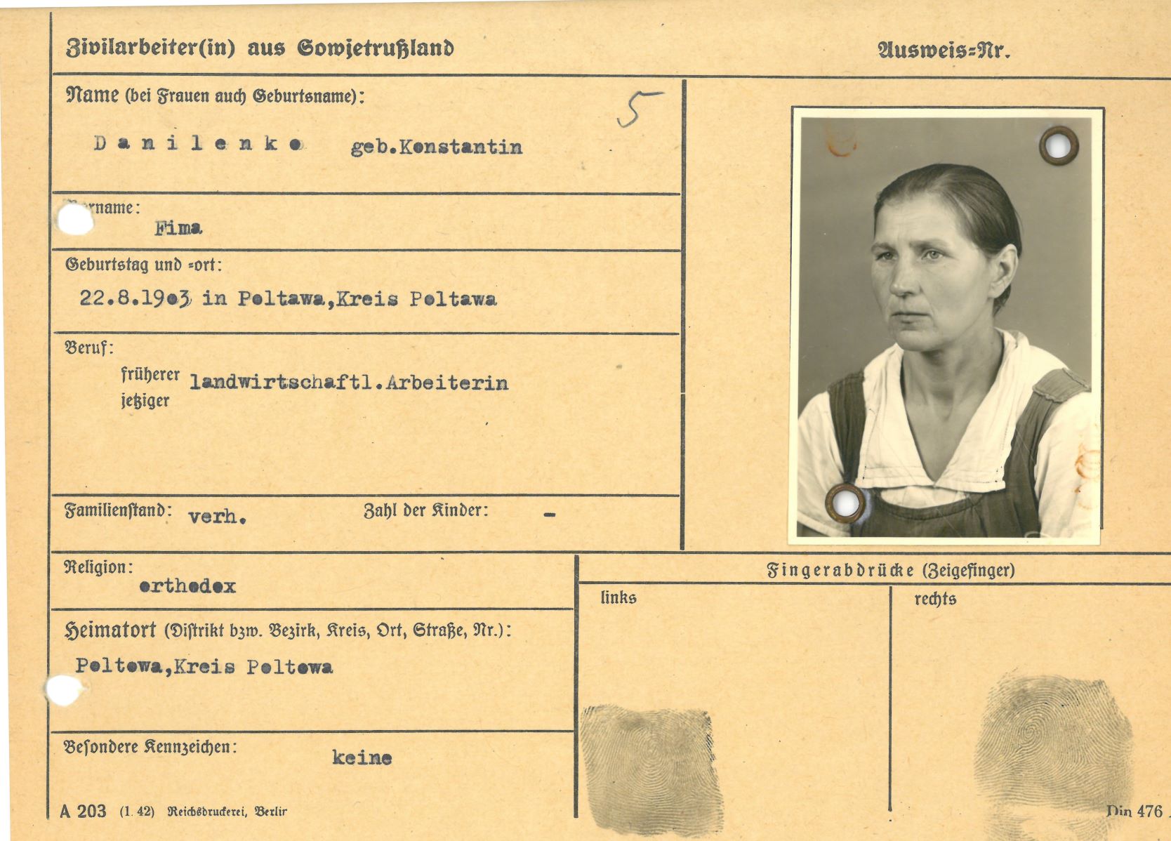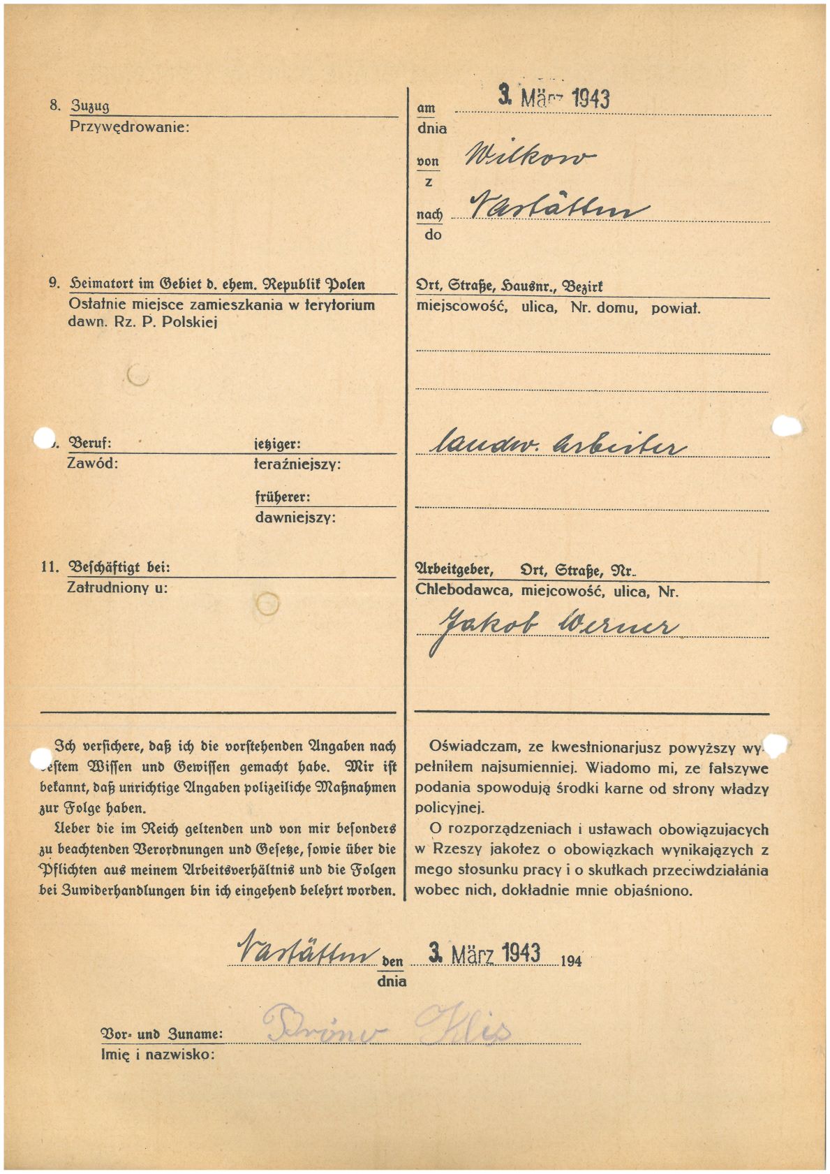Im Oktober 1939 wurde die Einführung der Arbeitspflicht für Polen zwischen dem 18. und 60. Lebensjahr verordnet. Ab Sommer 1941 wurden die Zwangsarbeitsmaßnahmen auch auf den sowjetisch besetzen Teil Polens übertragen. Mehr und mehr wurden auch Jugendliche und selbst Kinder zur Zwangsarbeit herangezogen. Im Oktober 1940 arbeiteten in der deutschen Landwirtschaft etwa 400.000, in der Industrie rund 140.000 sogenannte Zivilarbeiter aus Polen und Sowjetrussland. Auch in Nastätten wurden Zivilarbeiter überwiegend in der Landwirtschaft eingesetzt. Finden sie Aufenthaltsbescheinigungen und Ausweise der in Nastätten eingesetzten Zivilarbeiter.