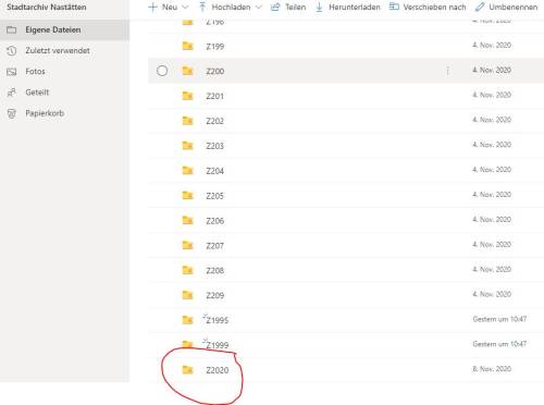 Unsere Archivdatenbank öffnet sich. In unserem Beispiel im Hauptordner Zeitungen. Scrollen sie zum Ordner Z2020 und öffnen sie den Ordner.
