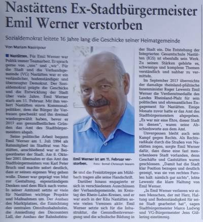 Mit tiefer Trauer nehmen wir Abschied von unserem Altbürgermeister Emil Werner, der am 11. Februar 2026 verstorben ist. Mit ihm verliert unsere Stadt einen verlässlichen, bodenständigen und überzeugten Demokraten, der über viele Jahre hinweg die Entwicklung unserer Stadt geprägt und begleitet hat. Am 8. Oktober 2001 übernahm Emil Werner das Amt des Bürgermeisters von Karl Peter Bruch. Bereits zu Beginn seiner Amtszeit machte er deutlich, wie er Politik verstand: „Ich bin nicht in die Fußstapfen eines anderen getreten, denn wer in irgendjemandes Fußstapfen tritt, dem bleibt ja nur die Bewegung rückwärts.“ Dieser Satz stand sinnbildlich für seinen eigenen Weg – geprägt von Mut zur Gestaltung, eigenständigem Denken und dem Blick nach vorne. Die Bürgerinnen und Bürger schenkten ihm wiederholt ihr Vertrauen und wählten ihn in den Jahren 2004, 2009 und 2014 erneut ins Amt. Während seiner Amtszeit wurden wichtige Projekte umgesetzt, die das Stadtbild und die Lebensqualität nachhaltig verbesserten: der Ausbau des Marktplatzes, die Einrichtung des zentralen Omnibusbahnhofs, die Ansiedlung von Lidl, der Ausbau der Bahnhofstraße sowie die Freisitztreppe am Mühlbach. Diese Maßnahmen tragen bis heute seine Handschrift. Aus gesundheitlichen Gründen trat Emil Werner im Juni 2016 von seinem Amt zurück. Auch diesen Schritt gestaltete er verantwortungsvoll – mit Weitblick und in dem Bemühen, einen geordneten Übergang zum Wohle der Stadt zu sichern. Emil Werner war ein selbstbewusster Sozialdemokrat und überzeugter Demokrat, der Politik nie als Einzelkampf verstand. Sympathisch und charakteristisch war, dass er stets von „uns“ und „wir“ sprach, denn für ihn war erfolgreiche Politik immer Teamarbeit. Seine Sprache war vom Dialekt geprägt, seine Reden nicht glänzend im rhetorischen Sinne – doch gerade darin lag seine Stärke: Er verstand es, schwierige und komplexe Themen verständlich und nahbar zu vermitteln. Mit Emil Werner verlieren wir einen Menschen, der mit Herz, Haltung und Bodenständigkeit für seine Stadt gearbeitet hat. Wir werden ihm ein ehrendes Andenken bewahren und sein Wirken in dankbarer Erinnerung behalten.