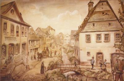 Das Gebäude wurde 1609 erbaut und zählt somit zu den ältesten Bauten in unserem Nastätten. Auf der Zeichnung sind die früheren Gegebenheiten um das Rathaus recht fantasievoll dargestellt. Das Gebäude stand direkt am Ufer des damals oberirdisch verlaufenden Lohbachs. Da zwischen dem Bachbett und der Rathausfront kein Gehweg möglich war, stand ein Teil des Rathauses höchst wahrscheinlich auf Stützpfeilern, die einen Durchgang Richtung Oberdorf ermöglichten. Erst 1840, nach Überwölbung des Lohbachs, wurden dann die Stützpfeiler ausgemauert. Es entstand auf der Ecke der „Bolles - eine Gefängniszelle -, in der aber auch wandernde Handwerksgesellen übernachten konnten. Bis 1970 war das „Alte Rathaus“ Sitz der Verwaltung von Nastätten. 1974 wurde es an einen Privatmann verkauft und wird seitdem als Restaurant genutzt.