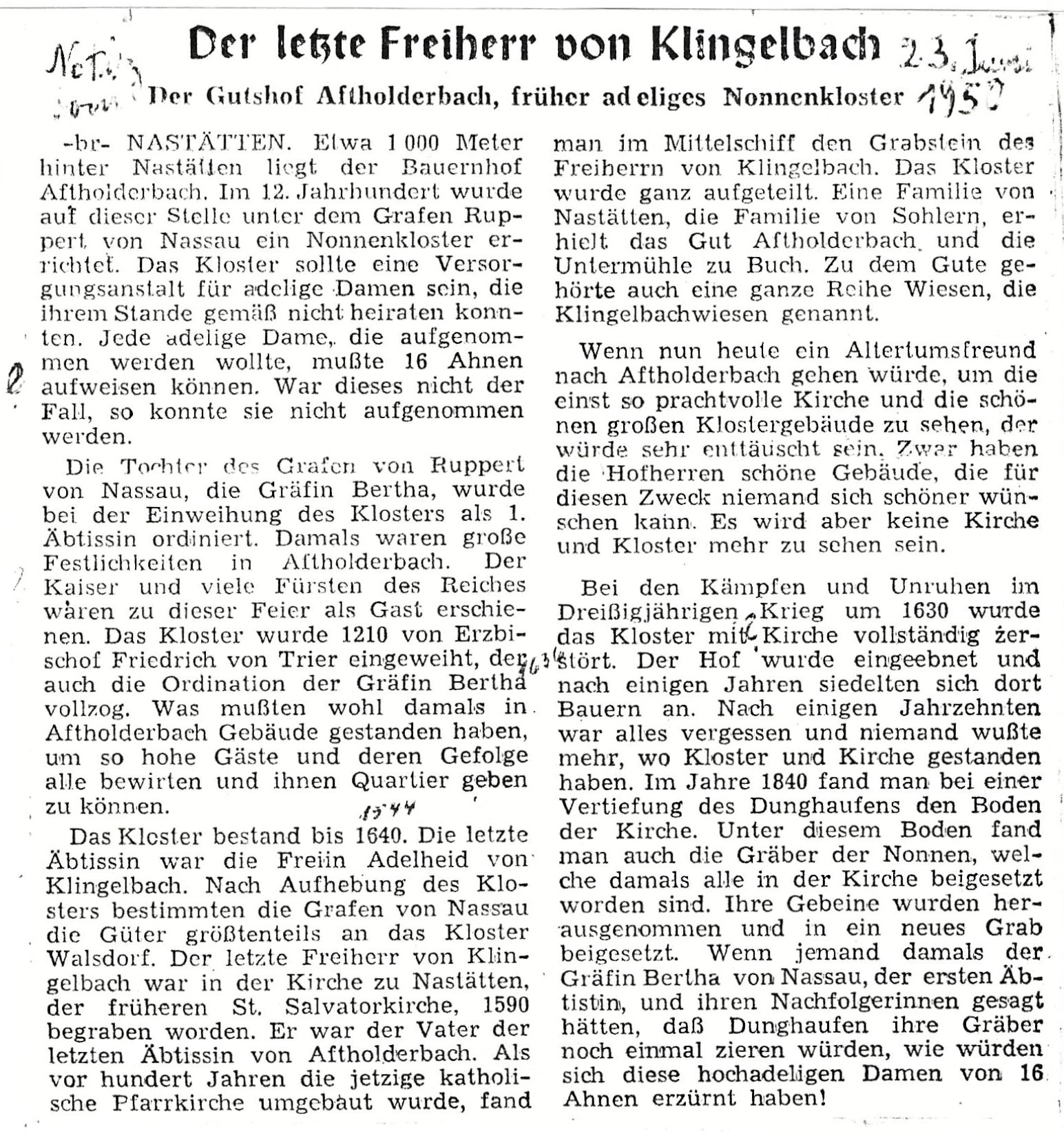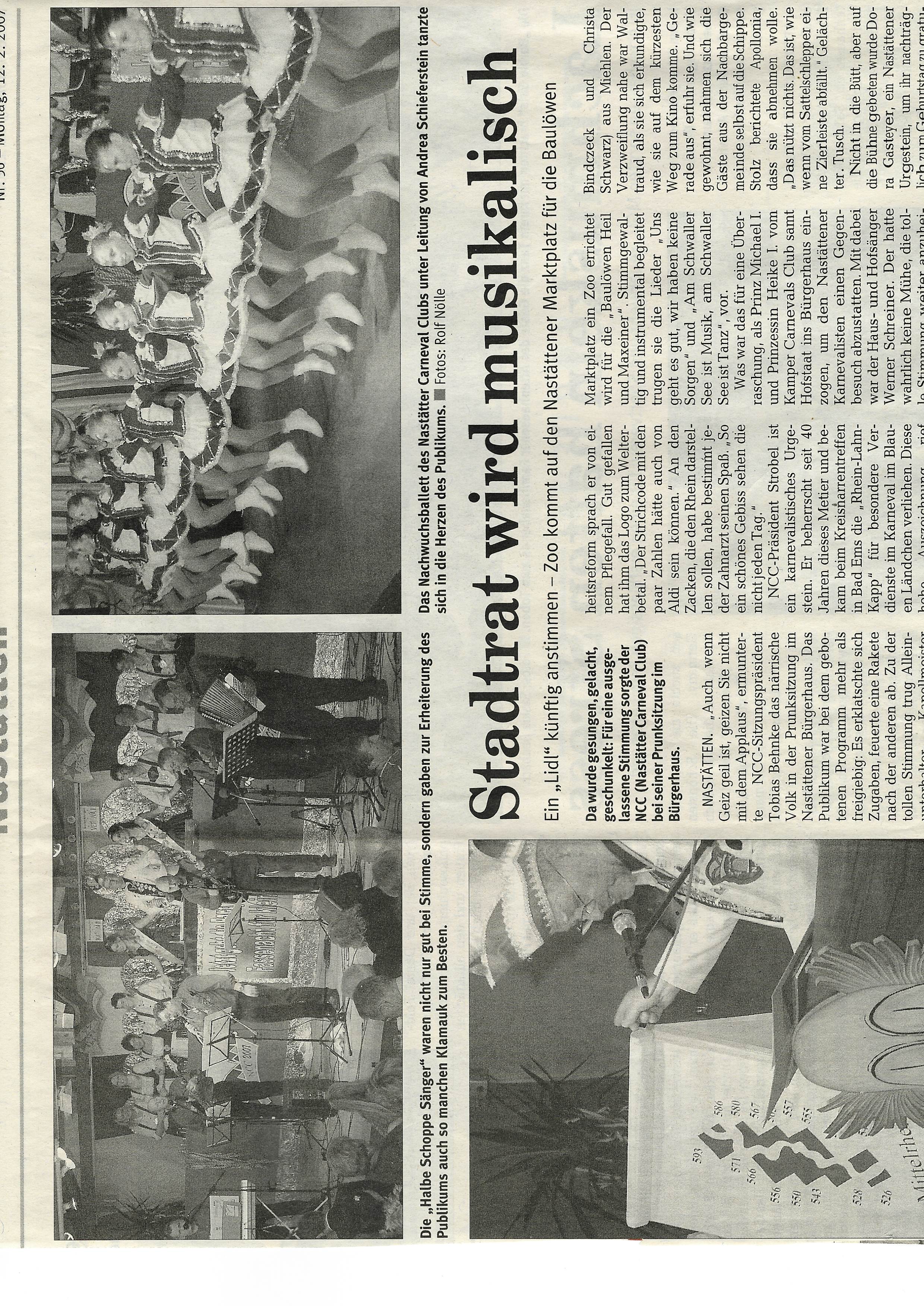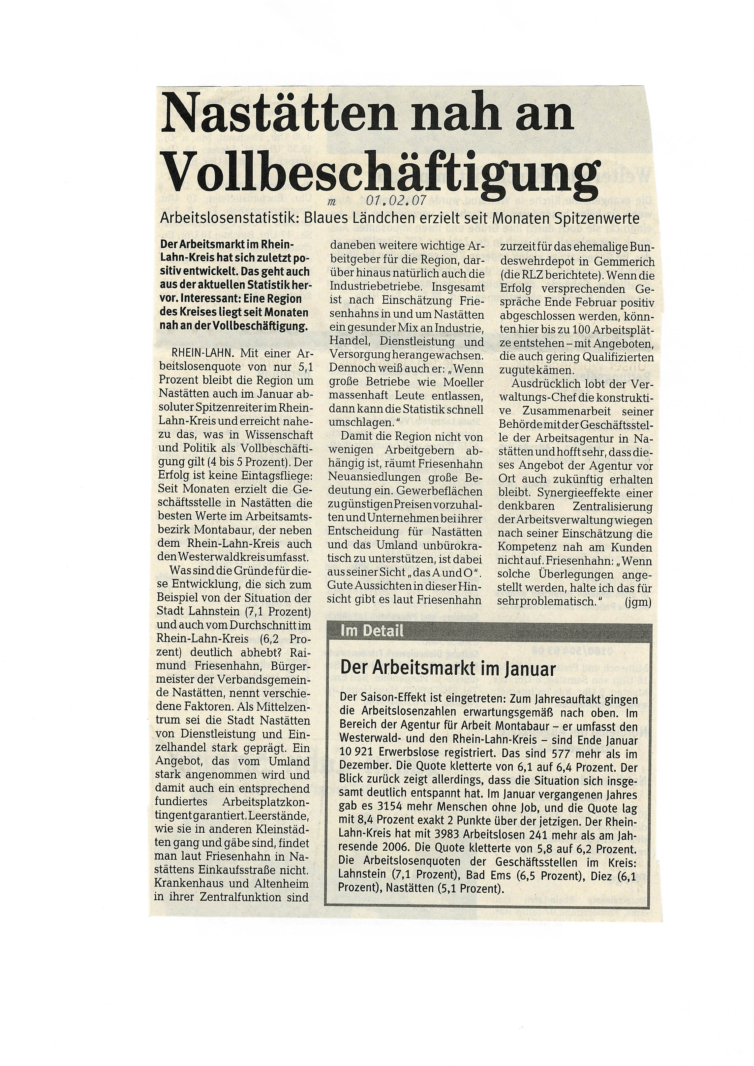 Zeitungsartikel Rhein-Lahn-Zeitung-Bad-Ems von und über Nastätten aus dem Jahre 2007.