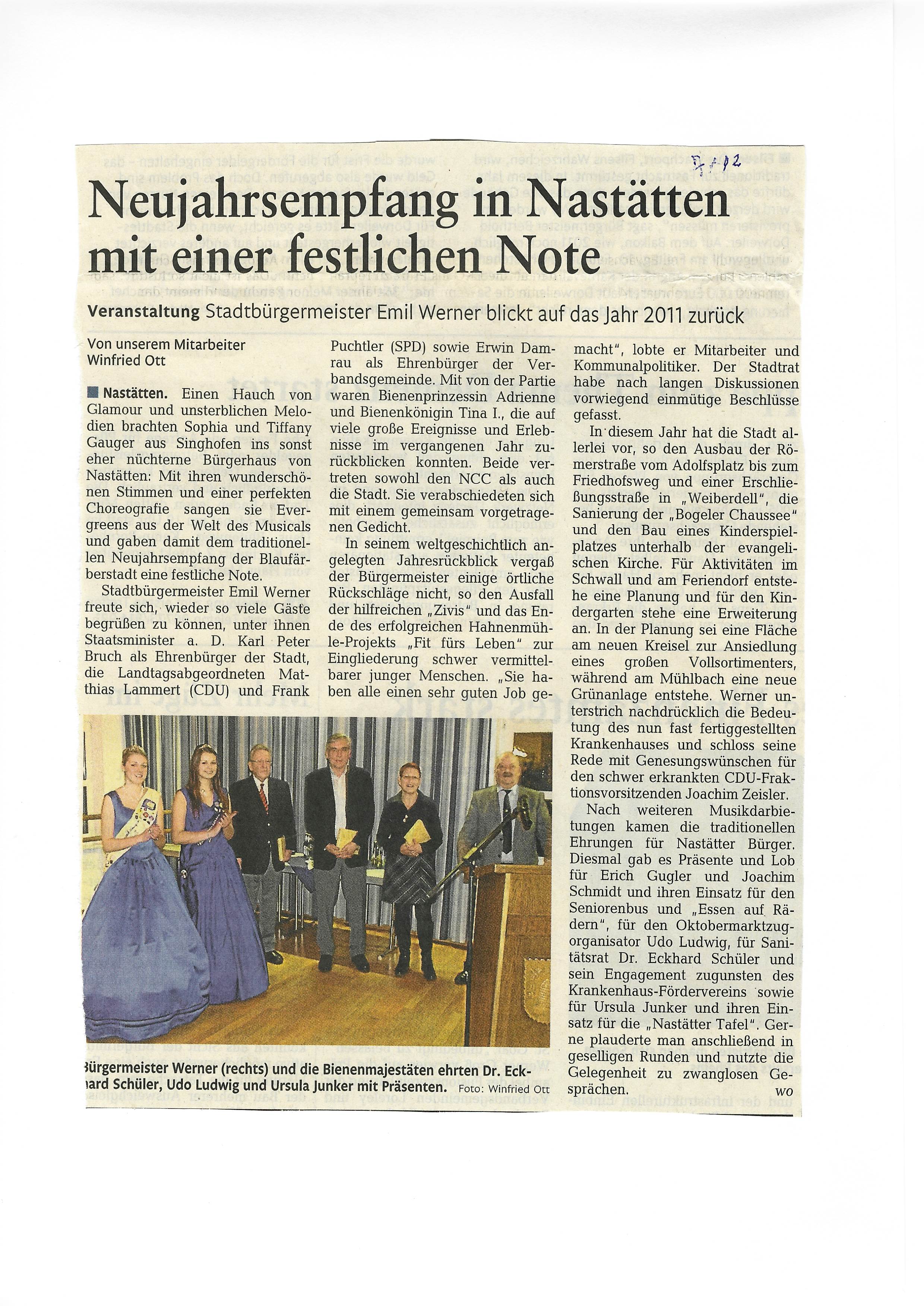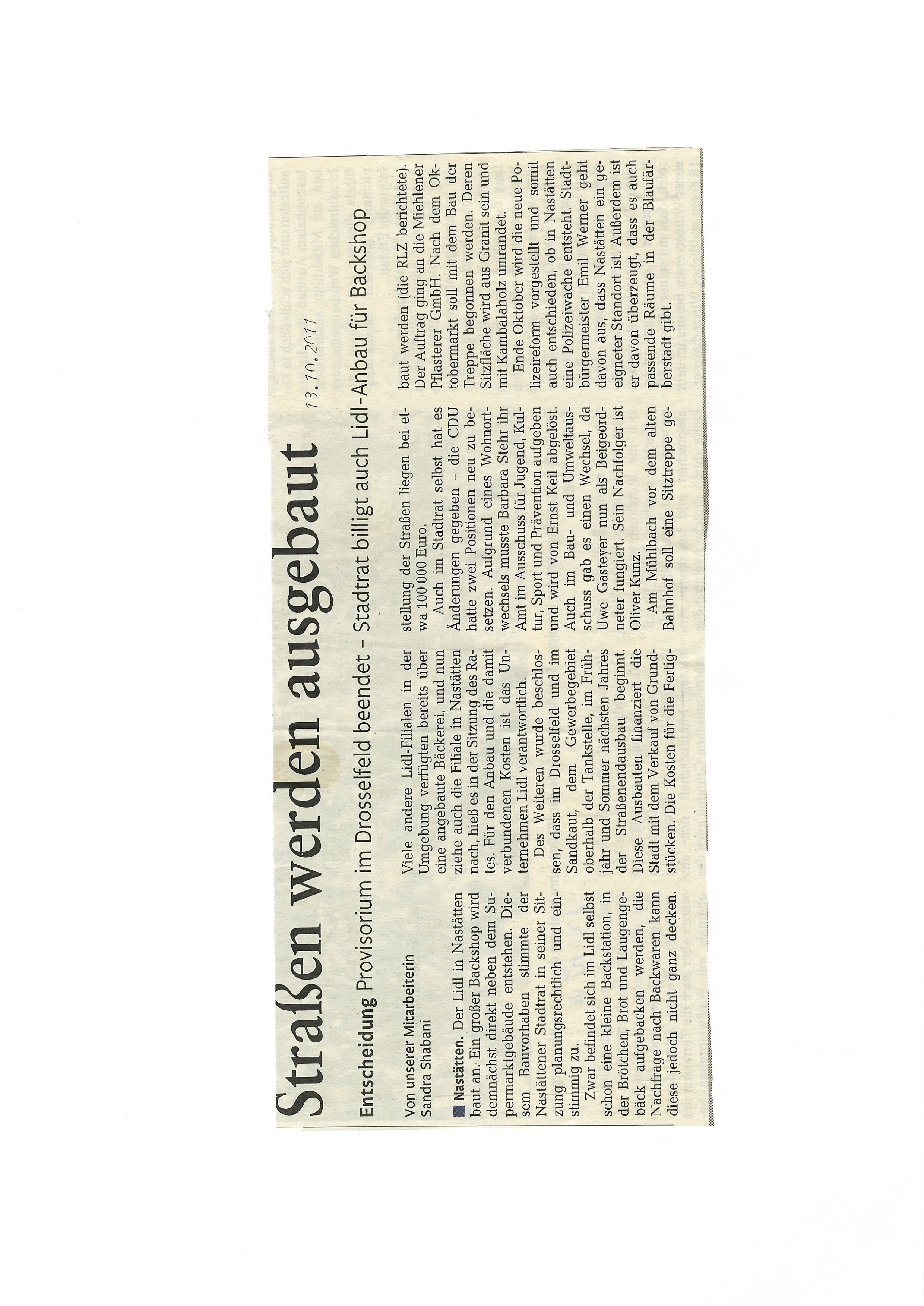 Zeitungsartikel Rhein-Lahn-Zeitung-Bad-Ems von und über Nastätten aus dem Jahre 2011.