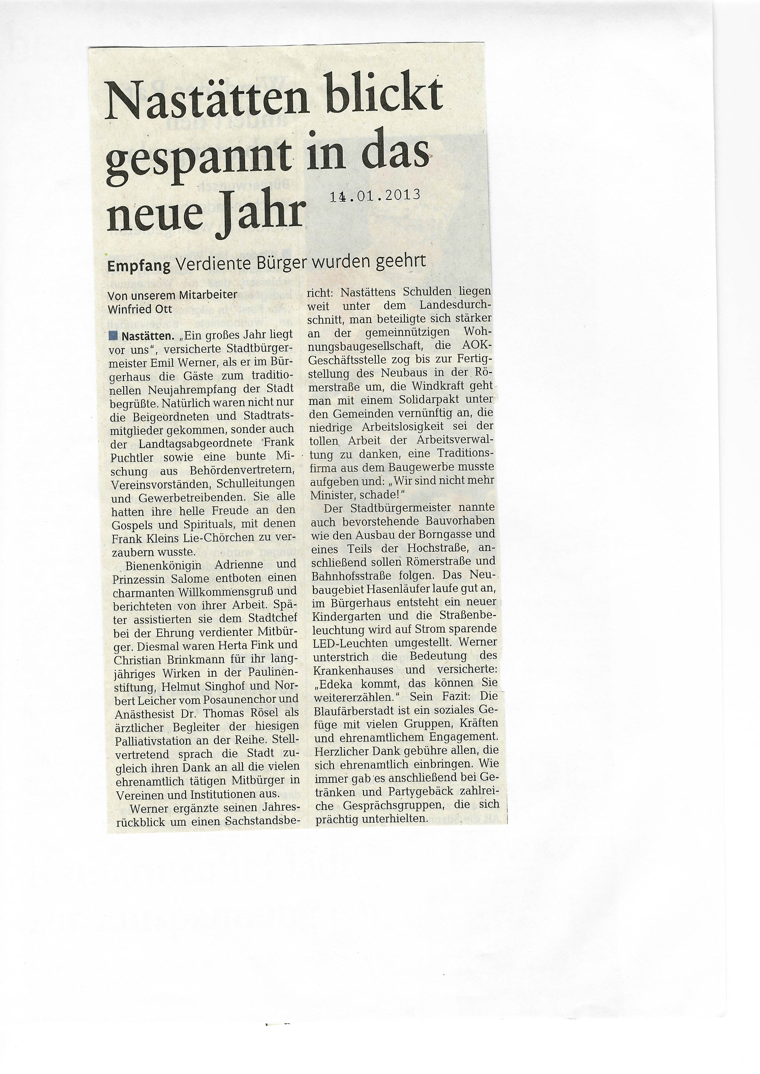 Zeitungsartikel Rhein-Lahn-Zeitung-Bad-Ems von und über Nastätten aus dem Jahre 2013.