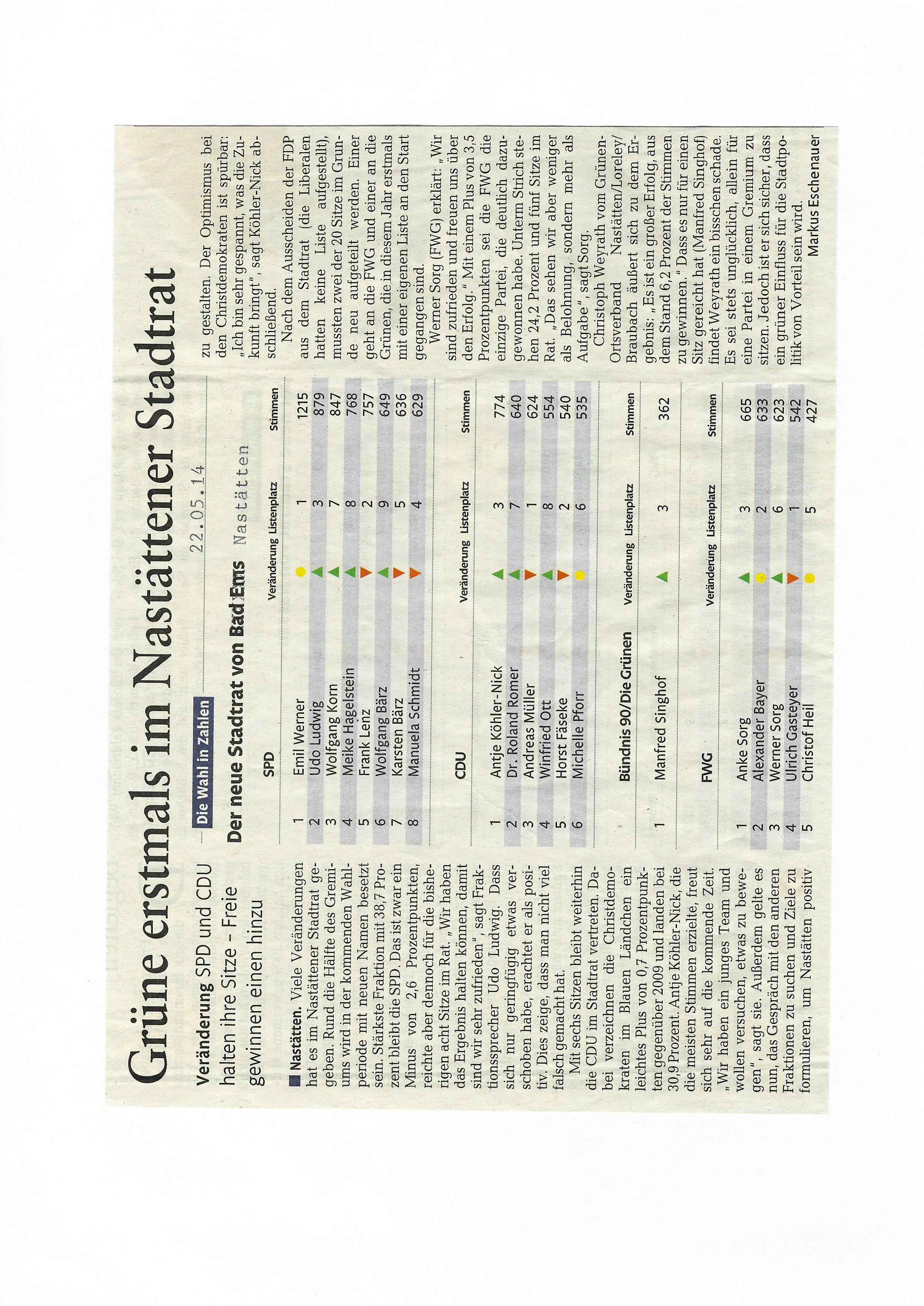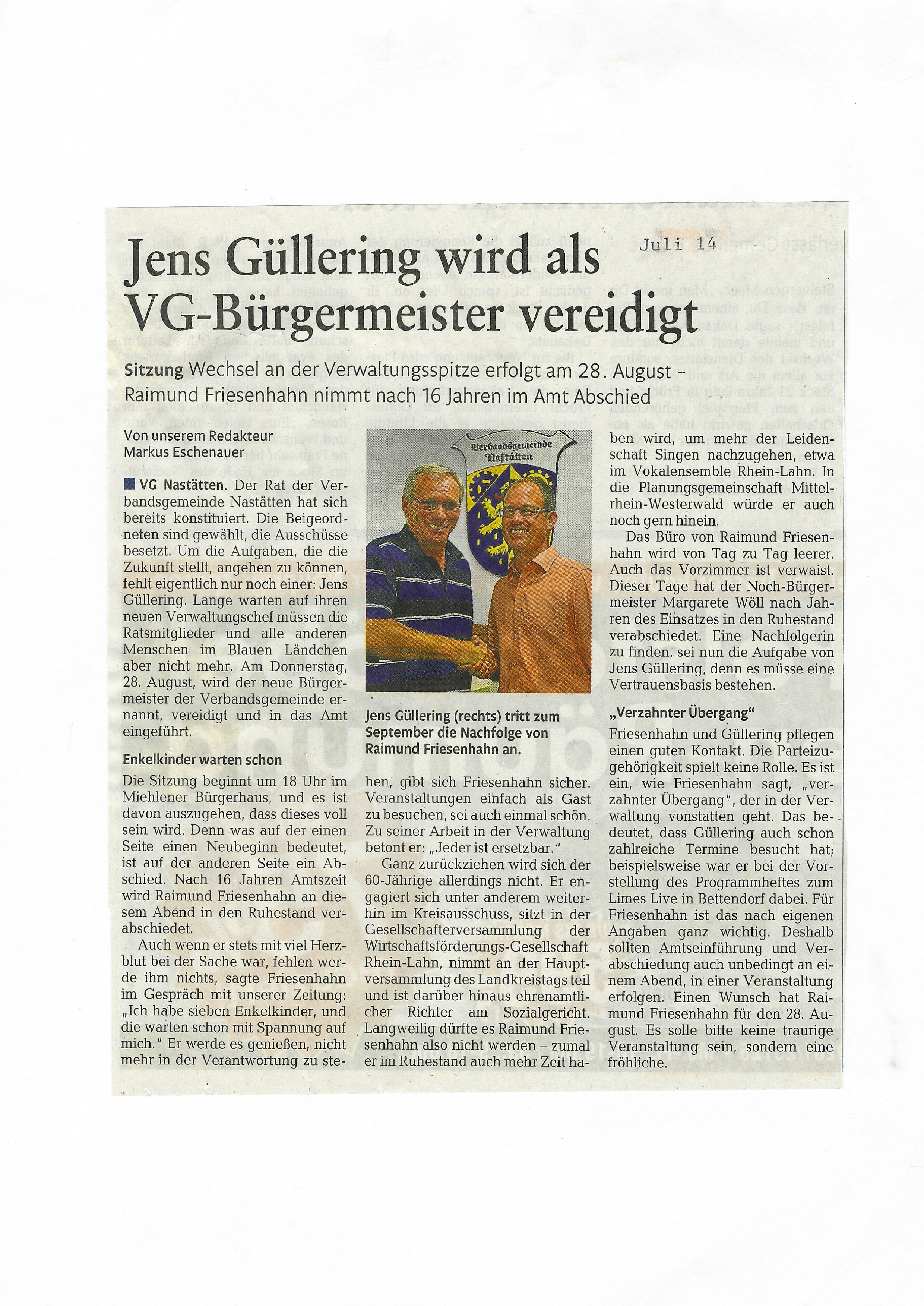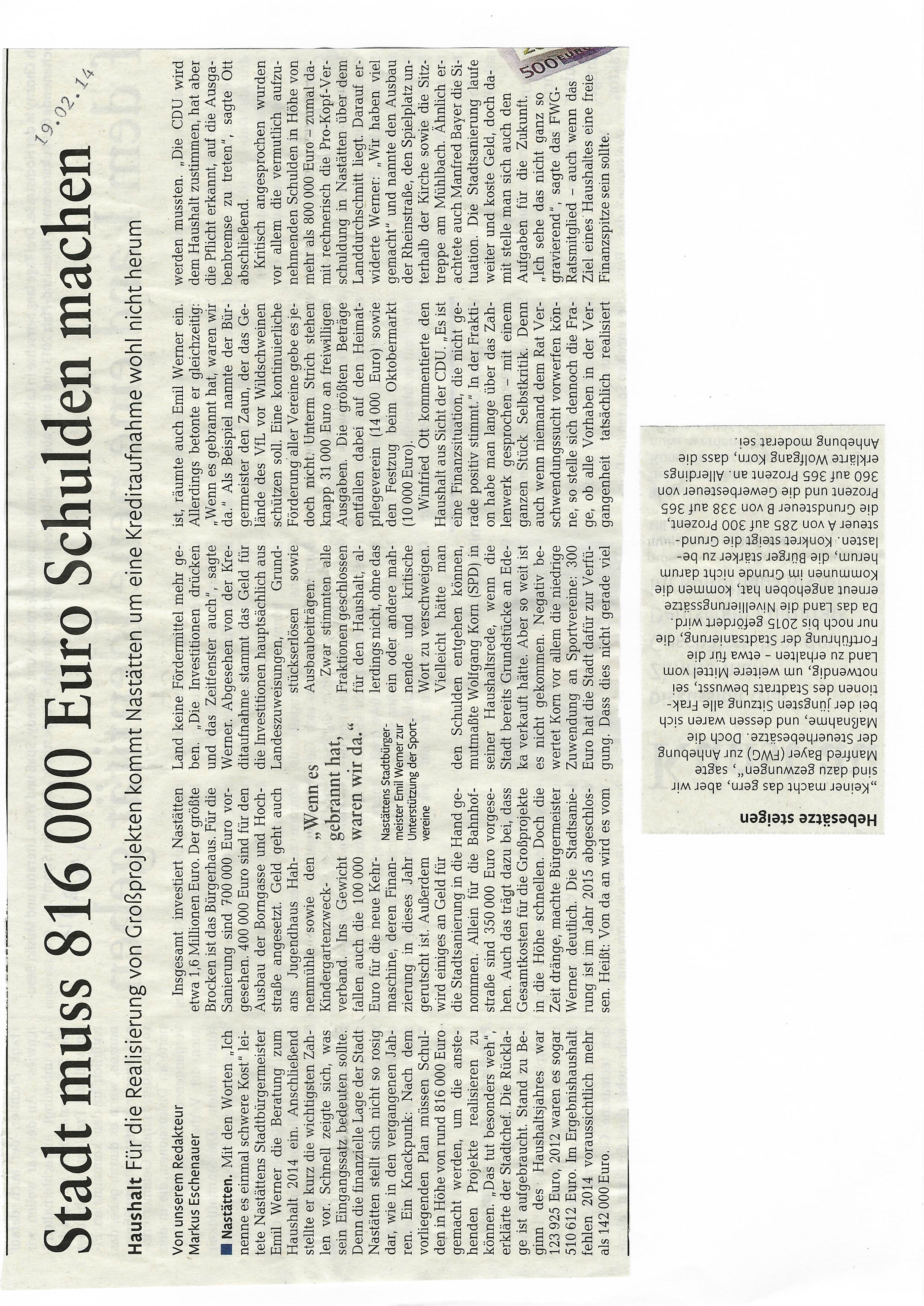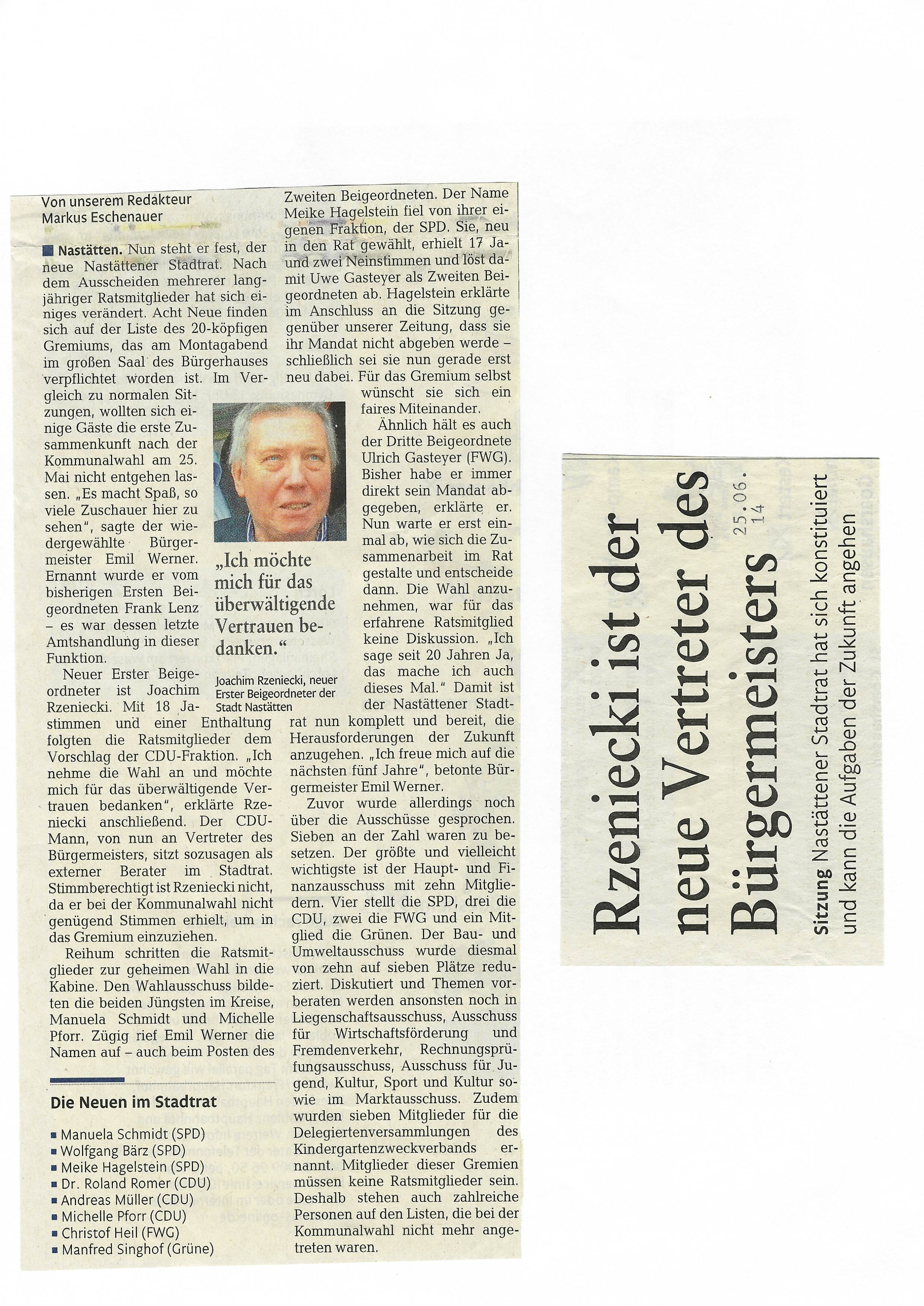 Zeitungsartikel Rhein-Lahn-Zeitung-Bad-Ems von und über Nastätten aus dem Jahre 2014.