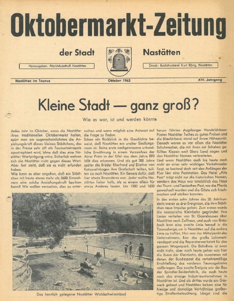Jedes Jahr im Oktober, wenn die Nastätter ihren traditionellen Oktobermarkt halten, spürt man am augenscheinlichsten die Anziehungskraft dieses kleinen Städtchens, das in der Presse sehr oft als Taunusmetropole apostrophiert wird, ohne dass dies eine Nastätter Wortprägung wäre. Sicherlich wehren sich die Nastätter nicht gegen dieses Wort. Aber feststeht, dass sie es nicht erfunden haben. Wie kann es aber angehen, dass ein Städtchen mit heute etwas mehr als 2600 Einwohnern eine solche Anziehungskraft besitzen kann? Wir wollen versuchen, dies zu untersuchen und wenn möglich eine Antwort auf die Frage zu finden. Schon ein Rückblick in die Geschichte beweist, dass Nastätten ein uralter Siedlungsraum ist. Seine erste nachgewiesene urkundliche Erwähnung in einem Verzeichnis der Abtei Prüm in der Eifel aus dem Jahre 893 lässt dies erkennen. Und als gut 300 Jahre später die Brüder Eberhard und Diether von Katzenelnbogen ihre Grafschaft teilten, teilten sie auch Nastätten. Ein Beweis dafür, dass hier etwas Besonderes war. Jeder wollte Nastätten lieber halb, als es einem allein für etwas Anderes lassen. Um 1.500 und 1.600 herum führten Augsburger Handelshäuser Posten Nastätter Tuches zu guten Preisen und die Blaufärberei stand auf ihrem Höhepunkt. Danach waren es vor allem die Nastätter Schuhmacher, die mit ihren mit Schuhen gefüllten Kiepen weit übers Land zogen und den Nastätter Namen verbreiteten. Und wenn Nastätten auch bis heute noch nicht an einer sehr wichtigen Verkehrsader liegt, so bestand doch seit den Anfängen der Post hier eine Poststation. Das Hotel „Alte Post“ trägt nicht nur die historischen Namen, sondern das Haus war tatsächlich das Haus der Thurn- und Taxisschen Post, wo die Pferde gewechselt wurden und die Gäste sich frischmachen und stärken konnten. In den ersten zehn Jahren des 20. Jahrhunderts waren es drei Ereignisse, die dem Städtchen neue Impulse gaben. Zum ersten wurde die nassauische Kleinbahn gegründet. Ihre Linien verliefen von St. Goarshausen über Nastätten nach Zollhaus, und auch von Braubach kam eine zweite Linie herauf in die Taunusberge, um in Nastätten auf die andere Linie zu treffen. Hier war der Mittelpunkt des Unternehmens; hier das große Lokomotiven-Depot und die Reparaturwerkstatt für den ganzen Wagenpark. Die Bahnlinie ist zwar nicht mehr, aber noch heute gehen von hier die Busse der Kleinbahn, die zusammen mit denen der Bundespost die verkehrsmäßige Erschließung des vorderen Taunusgebietes vollbringen. Das zweite Ereignis war der Bau der Spindler-Seidenfabrik, die auch heute noch das einzige Industrieunternehmen in Nastätten ist. Und als drittes wurde ein Gaswerk gebaut und Nastätten bekam eine für hiesige und damalige Verhältnisse großartige Straßenbeleuchtung. Längst sind die Gaslampen modernen Stromleuchten gewichen und vor sechs Jahren schloss das kleine Werk aus Unrentabilität seine Pforten. In diesem Jahr haben dagegen die MKW, also die Hersteller der anderen Energieart, damit begonnen, ein neues Inspektionsgebäude zu errichten. Wie sieht es nun heute in Nastätten aus? Zurzeit sind in erster Linie der Handel und das Handwerk die tragenden Säulen der kleinen Stadt. Die Landmaschinenhändler und Werkstätten ziehen vor allem die landwirtschaftlich orientierte Bevölkerung der weiten Umgebung nach Nastätten. Und dann, wenn die Leute erst einmal hier sind, kaufen sie natürlich auch vieles andere. Aber nicht nur das, sie gehen auch - vor allem die Damen - zu den Verschönerungsaposteln, den Friseuren. Und wenn alle Einkäufe getätigt sind, wird eine Pause eingelegt, in der etwas für das leibliche Wohl getan wird. Daher die vielen Gaststätten und Cafés, oder sind Sie nicht auch der Meinung, dass 18 voll-konzessionierte Betriebe eine stattliche Zahl sind? Aber es sind auch noch andere Fakten, die den zentralen Charakter Nastättens bestimmen. Das sind einmal die Behörden: das Amtsgericht, das staatliche Forstamt, das große Postamt — von hier werden über 50 Ortschaften versorgt — und das Fernsprechamt. Zum zweiten sind es die Ärzte und Zahnärzte, sowie Apotheke und Drogerie, die die Leute anziehen. Wen wundert es, dass deshalb auch zwei Bankinstitute, die Nassauische Sparkasse und die bodenständige jetzt 101 Jahre alte Volksbank hier vertreten sind. Als viertes kommt das Altersheim und mehr noch das Krankenhaus als Anziehungspunkt dazu. Fünftens sind es die kulturellen Einrichtungen, die den Charakter eines Mittelpunktes verstärken: Da ist zunächst die Landwirtschaftsschule mit ihrem Beratungsdienst, die landwirtschaftliche Berufsschule für den Kreis und die Realschule. Aber auch das neue Schwimmbad kann dazu gezählt werden. Ferner die Kinos und das recht aktive Volksbildungswerk mit ganzjährigen Veranstaltungen und der neu gegründete Theaterring. Zu all dem bisher Gesagten tritt noch eine weitere Komponente. Nastätten ist seit vielen Jahren Fremdenverkehrsgemeinde. Wenn auch keine Rekordzahlen vorgewiesen werden können, so ist doch eine ständige Aufwärtsentwicklung zu verzeichnen. Und um einer neuen Reiseart entsprechen zu können, wurde vor drei Jahren ein Campingplatz angelegt und weil die Fläche in diesem Jahr nicht mehr reichte, soll der Platz für die nächste Saison erweitert werden. Und wie wird es weiter gehen? Es wird nicht einfach sein, eine Prognose zu geben und nicht alle Zukunftsvermutungen und Erwartungen werden sich erfüllen, aber dennoch dürfte ein Blick voraus recht interessant sein und deshalb gewagt werden. Der einheimische Handel sieht sich wie an anderen Plätzen auch einer starken Konkurrenz des Versandhandels gegenüber. Was er nicht zu fürchten braucht, sind große Kaufhäuser und Konzernfilialen. Da aber die Motorisierung auch das flache. Land erfasst hat, schrumpfen die Entfernungen in die Großstädte Koblenz und Wiesbaden und werden somit doch zu einer gewissen Konkurrenz. Ihr zu begegnen versuchen die Nastätter Gewerbetreibenden damit, da