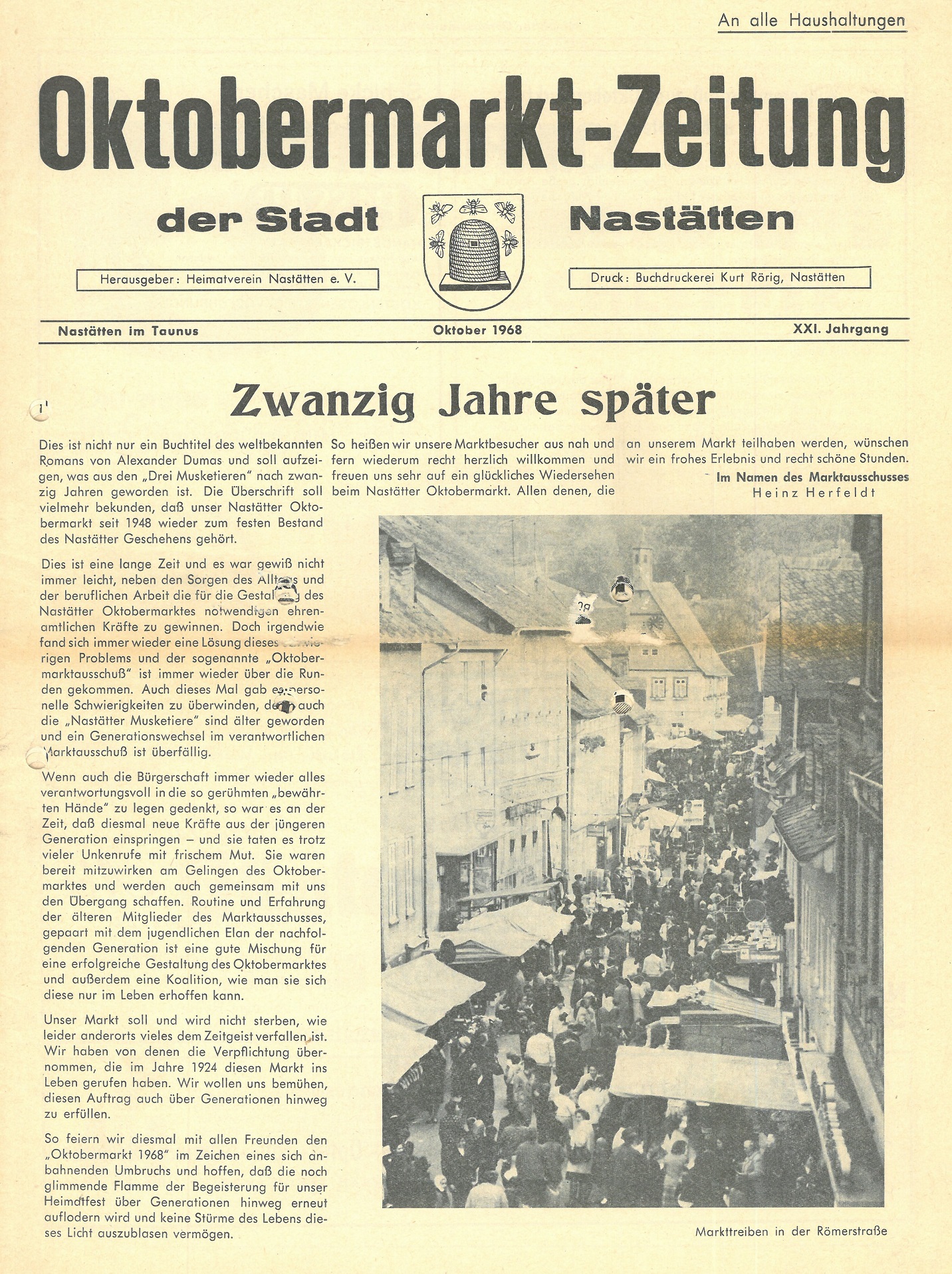 Dies ist nicht nur ein Buchtitel des weltbekannten Romans von Alexander Dumas und soll aufzeigen, was aus den „Drei Musketieren“ nach zwanzig Jahren geworden ist. Die Überschrift soll vielmehr bekunden, dass unser Nastätter Oktobermarkt seit 1948 wieder zum festen Bestand des Nastätter Geschehens gehört.