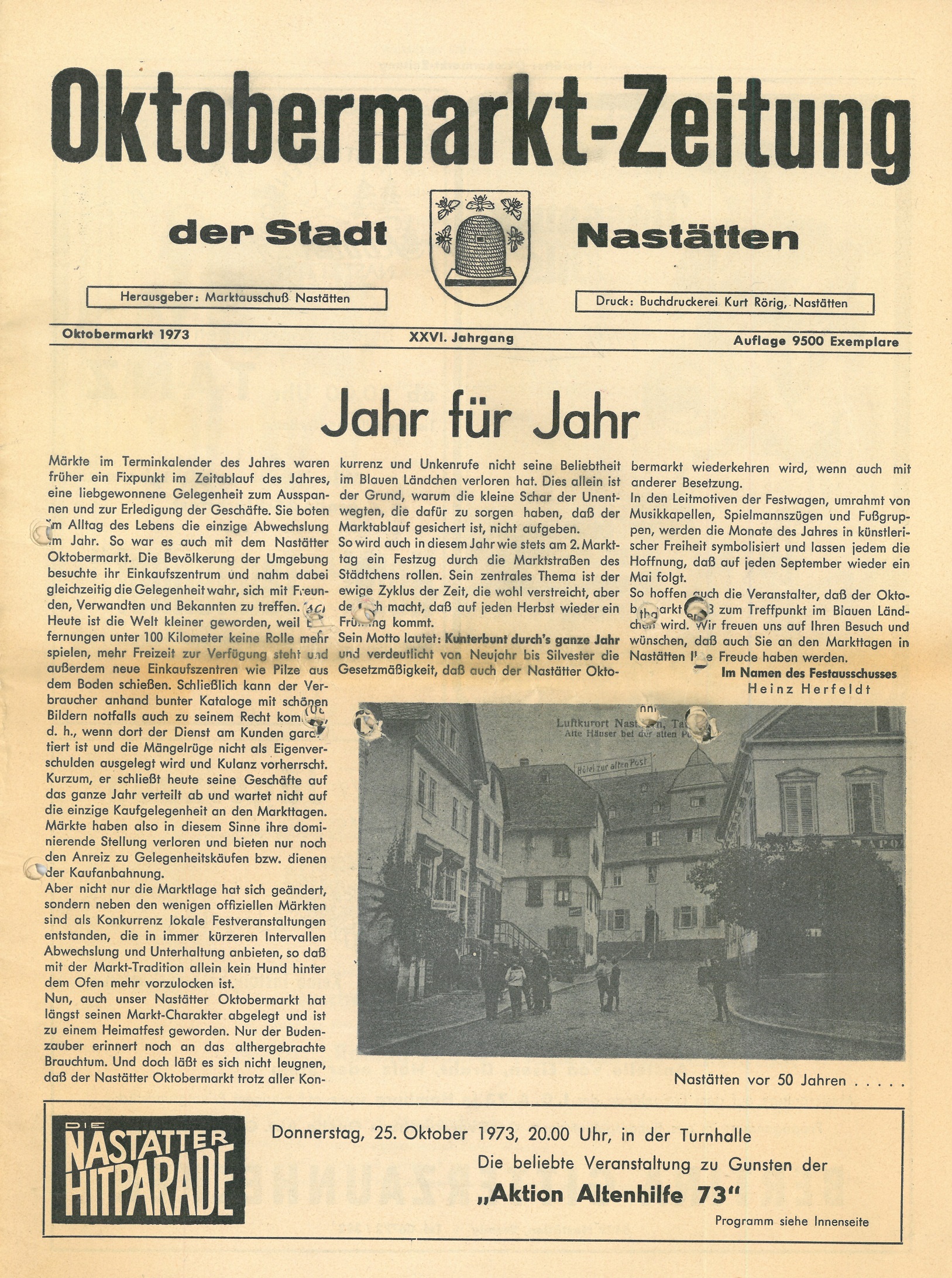 Märkte im Terminkalender des Jahres waren früher ein Fixpunkt imzeitablauf des Jahres, eine liebgewonnene Gelegenheut zum Ausspannen und zur Erledigung der Geschäfte. Sie botem im Alltag des Lebens die einzige Abwechslung im Jahr. So war es auch mit dem Nastätter Oktobermarkt. Die Bvölkerung der Umgebung besuchte ihr Einkaufszentrum und nahm dabei gleichzeitig die Gelegenheit wahr, sich mit Freunden, Verwanten und Bekannten zubtreffen. Heute ist die Welt kleiner geworden, weil Entfernungen unter 100 Kilometer keine Rolle mehr spielen, mehr Freizeit zur Verfügung steht und außerdem neue Einkaufszentren wie Pilze aus dem Boden schießen. Schließlich kann der Verbraucher anhand bunter Kataloge mit schönen Bildern notfalls auch zu seinem Recht kommen, d. h. wenn dort der Dienst am Kunden garantiert ist und die Mängelrüge nicht als Eigenverschulden ausgelegt wird und Kulanz vorherscht. Kurzum, er schließt heute seine Geschäfte auf das ganze Jahr verteilt ab und wartet nicht auf die einzige Kaufgelegenheit an den Markttagen. Märkte haben also in diesem Sinne ihre dominierenden Stellung verloren und bieten nur noch den Anreiz zu Gelegenheitskäufen bzw. dienen der Kaufanbahnung. Aber nicht nur die Marktlage hat sich geändert, sondern neben den wenigen offiziellen Märkten sind als Konkurrenz lokale Festveranstaltungen entstanden, die in immer kürzeren Intervallen Abwechslung und Unterhaltung anbieten, so daß mit der Markt- Tradition alleine kein Hund mehr hinter dem Ofen mehr Vorzulocken ist. Nun, auch unser Nastätter Oktobermarkt hat längst seinen Markt-Charakter abgelegt und ist zu einem Heimatfest geworden. Nur der Budenzauber erinnert noch an das althergebrachte Brauchtum. Und doch läßt es sich nicht leugnen, daß der Nastätter Oktobermarkt trotz aller Kobnkurenz und Unkenrufe nicht seine Beliebtheit im Blauen Ländchen verloren hat. Dies allein ist der Grund, warum die kleine Schar der Unentwegten, die dafür zu sorgen haben, daß der Marktablauf gesichert ist, nicht aufgeben. So wird auch in diesem Jahr wie stets am 2.Markttag ein Festzug durch die Marktstraßen des Städchens rollen. Sein zentrales Thema ist der ewige Zyklus der Zeit, die wohl verstreicht, aber der auch macht, daß auf jeden Herbst wieder ein Frühling kommt. Sein Motto lautet : Kunterbunt durch´s ganze Jahr und verdeutlichst von Neujahr bis Sylvester die Gesetzmäßigkeit, daß auch der Nastätter Oktobermarkt wiederkehren wird, wenn auch mit anderer Besetzung. In den Leitmotiven der Festwagen, umrahmt von Musikkapellen, Spielmannszügen und Fußgruppen, werden die Monate des Jahres in künstlerischer Freiheit symbolisiert und lassen jedem die Hoffnung, daß auf jeden September wieder ein Mai folgt. So hoffen auch die Veranstalter, daß der Oktobermarkt wieder zum Treffpunkt im Blauen Ländchen wird. Wir freuen uns auf ihren Besuch und wünschen, daß auch sie an den Markttagen in Nastätten ihre Freude haben werden. Im Namen des Festausschusses Heinz Herfeldt