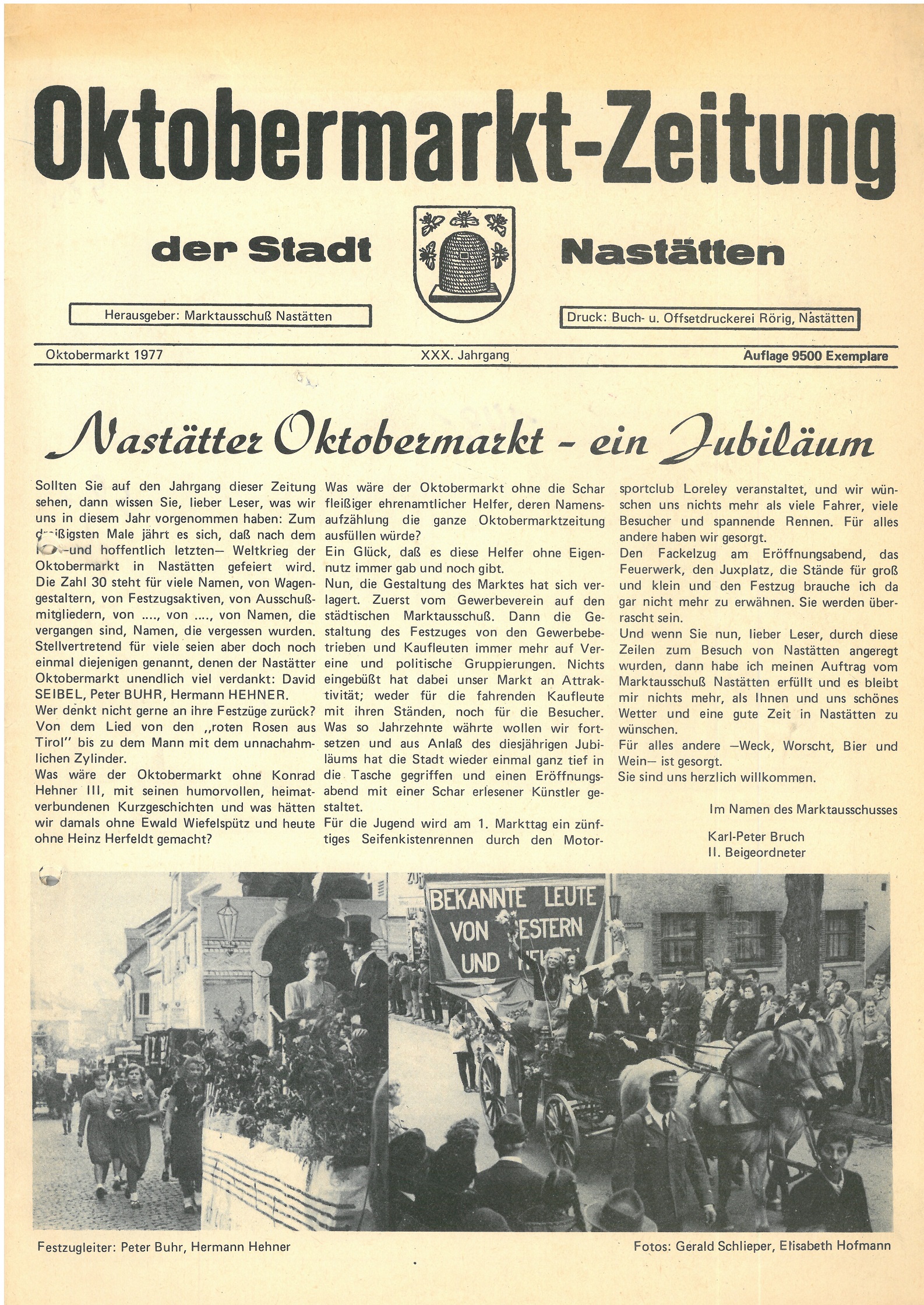 Sollten sie auf den Jahrgang dieser Zeitung sehen, dann wissen sie, lieber Leser,was wir uns in diesem Jahr vorgenommen haben: zum dreißigsten Male jährt es sich, daß nach dem zweiten -und hoffentlich letzten- Weltkrieg, der Oktobermarkt in Nastätten gefeiert wird. Die Zahl 30 steht für viele Namen, von Wagengestaltern, von Festzugsaktiven, von Ausschußmitgliedern, von….., von ….., von Namen, die vergangen sind, Namen, die vergessen wurden. Stellvertretend für viele seien aber doch noch einmal diejenigen genannt, dennen der Nastätter Oktobermarkt unendlich viel verdankt: David SEIBEL, Peter BUHR, Hermann HEHNER. Wer denkt nicht gerne an ihre Festzüge zurück? Von dem Lied von den „Roten Rosen aus Tirol“ bis zu dem Mann mit dem unnachahmlichen Zylinder. Was wäre der Oktobermarkt ohne Konrad Hehner III, mit seinen humorvollen, heimatverbundenen Kurzgeschichten und was hätten wir damals ohne Ewald Wiefelspütz und heute ohne Heinz Herfeldt gemacht? Was wäre der Oktobermarkt ohne die Schar fleißiger ehrenamtlicher Helfer, deren Namensaufzählung die ganze Oktobermarktzeitung ausfüllen würde? Ein Glück, daß es diese Helfer ohne Eigennutz immer gab und noch gibt. Nun, die Gestaltung des Marktes hat sich verlagert. Zuerst vom Gewerbeverein auf den städtischen Marktausschuß. Dann die Gestaltung des Festzuges von den Gewerbebetrieben und Kaufleuten immer mehr auf die Vereine und politische Gruppierungen. Nichts einegbüßt hat dabei unser Markt an Attraktivität; weder für die fahrenden Kaufleute mit ihren Ständen, noch für die Besucher. Was so Jahrzehnte währte wollen wir fortsetzen und aus Anlaß des diesjährigen Jubiläums hat die Stadt wieder einmal ganz tief in die Tasche gegriffen und einen Eröffnungsabend mit einer Schar erlesener Künstler gestaltet. Für die Jugend wird am 1. Markttag ein zünftiges Seifenkistenrennen durch den Motorsportclub Loreley veranstaltet, und wir wünschen uns nichts mehr als viele Fahrer, viele Besucher und spannende Renne. Für alles andere haben wir gesorgt. Den Fackelzug am Eröffnungsabend, das Feuerwerk, den Juxplatz, die Stände für groß und klein und den Festzug brauche ich da gar nicht mehr zu erwähnen. Sie werden Überrascht sein. Und wenn sie nun, lieber Leser, durch diese Zeilen zum Besuch von Nastätten angeregt wurden, dann habe ich meinen Auftrag vom Marktausschuß Nastätten erfüllt und es bleibt mir nichts mehr, als ihnen und uns schönes Wetter und eine gute Zeit in Nastätten zu wünschen. Für alles andere -Weck, Worscht, Bier und Wein- ist gesorgt. Sie sind uns herzlich willkommen. Im NBamen des Marktausschusses Karl-Peter Bruch II.Beigeordneter